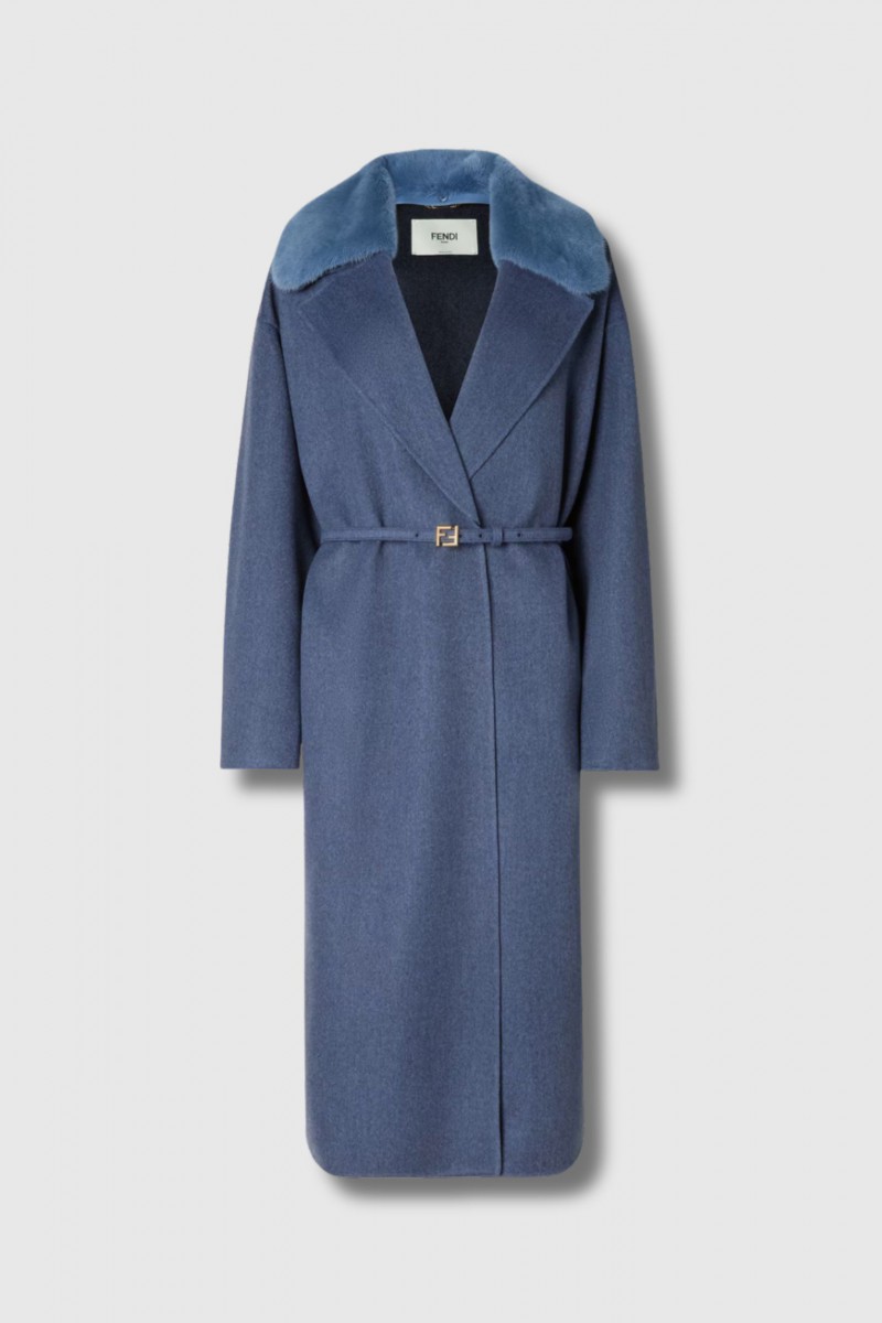 This reversible navy cashmere coat is by Fendi. Designed with an elegant oversized silhouette, it features a wide collar with fur lapels and dropped shoulders that enhance its modern, enveloping look. Crafted from lightweight double-faced blue cashmere, it reveals a dark blue interior for a subtle and sophisticated contrast. A tone-on-tone embroidered logo adorns the lower part of the left sleeve, offering a discreet signature detail. The coat fastens with a matching belt and comes with two cashmere belts: one with a tone-on-tone covered buckle and the other with an FF metal buckle in a palladium finish.