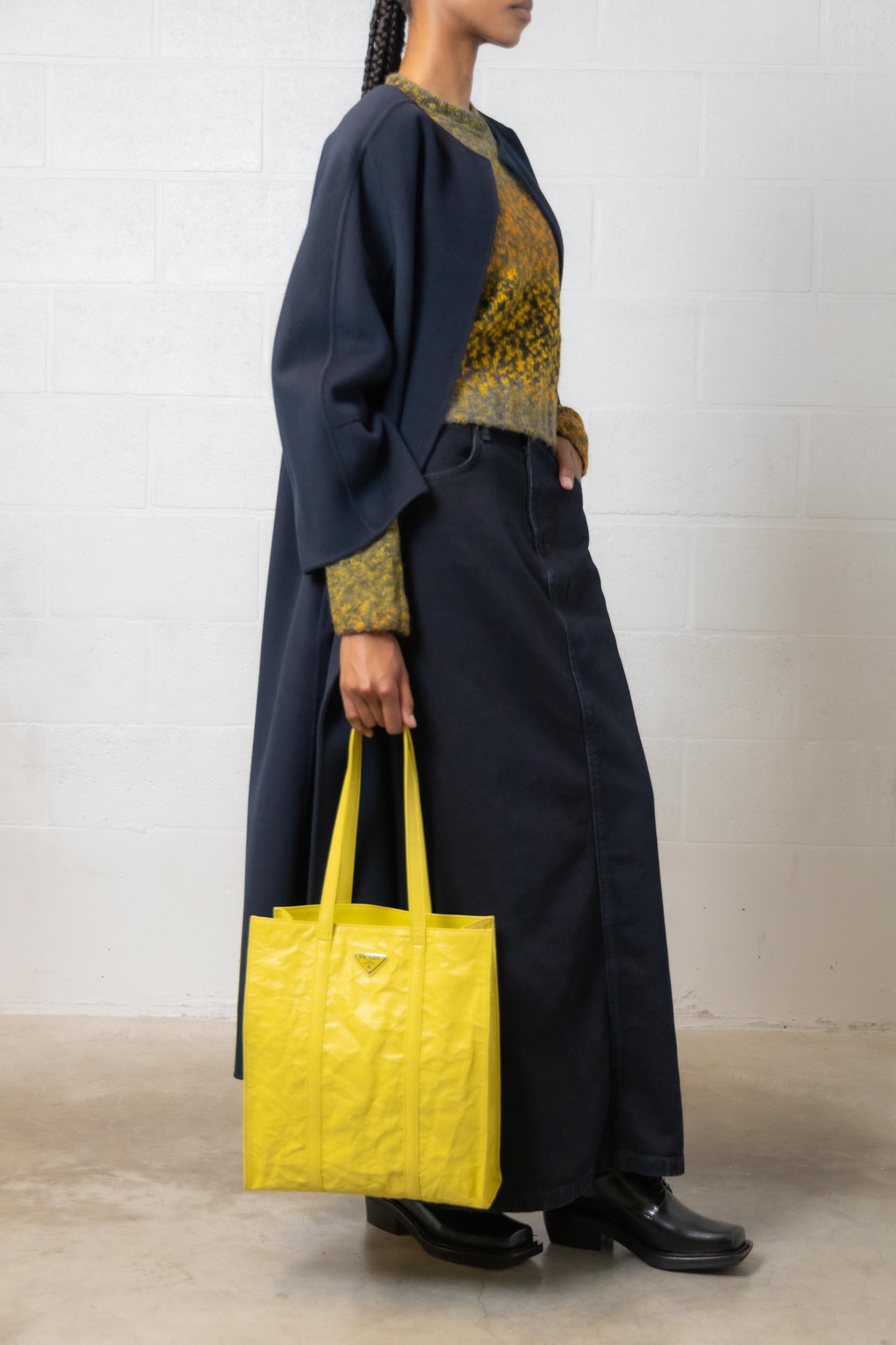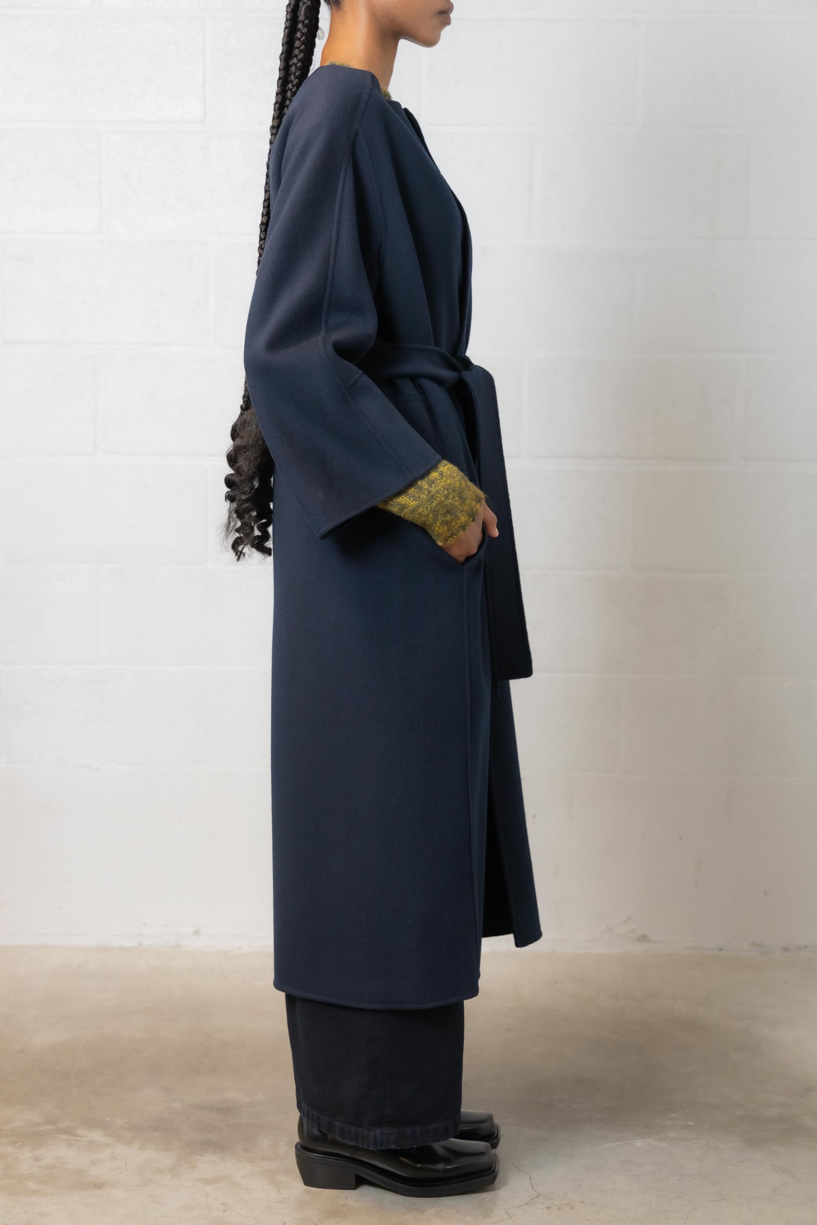 This long India coat in blue wool is designed by MaxMara. It features a long cut with a round neck, long kimono-style sleeves, a central slit at the back and is finished with a matching belt. This coat is 128 cm long.