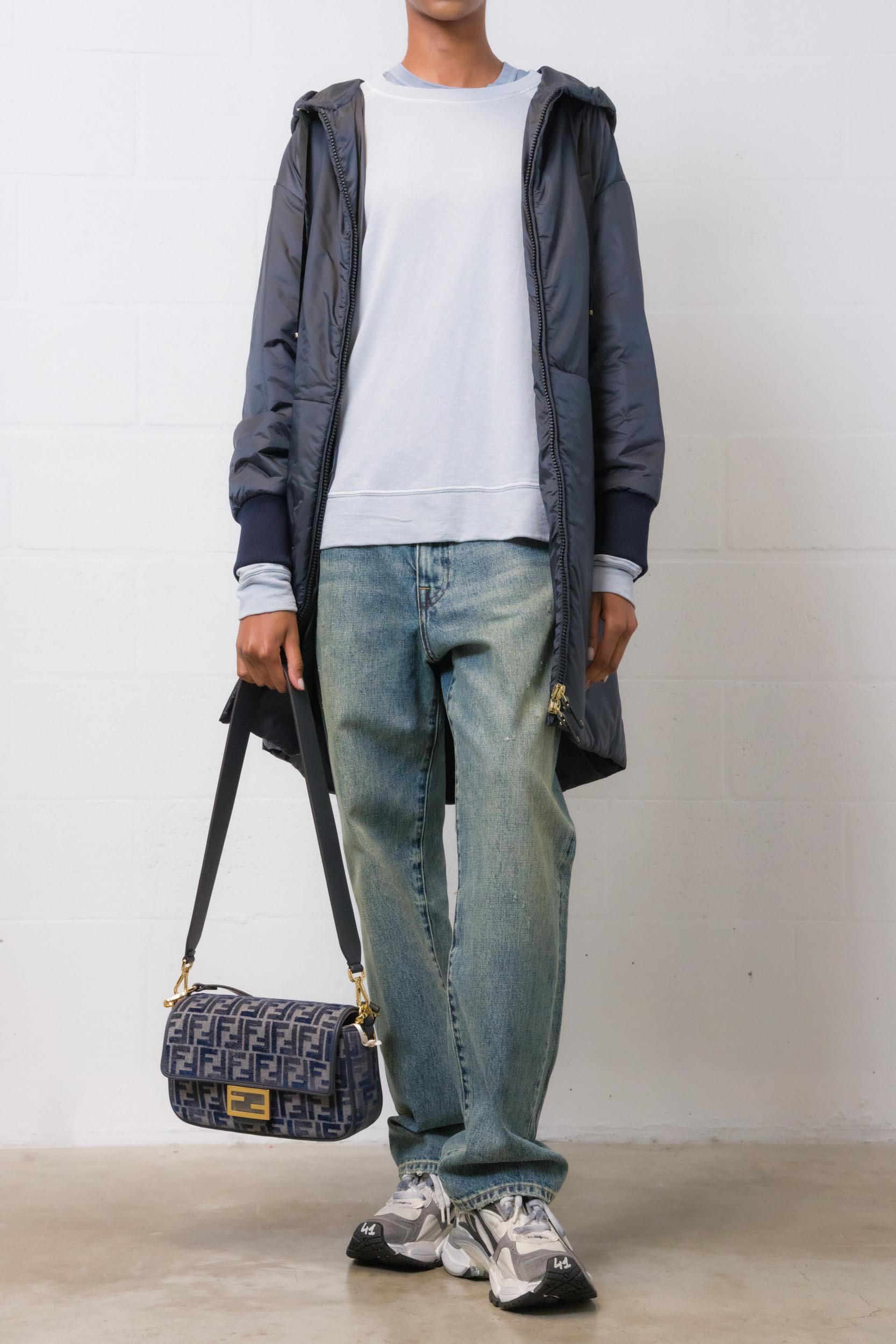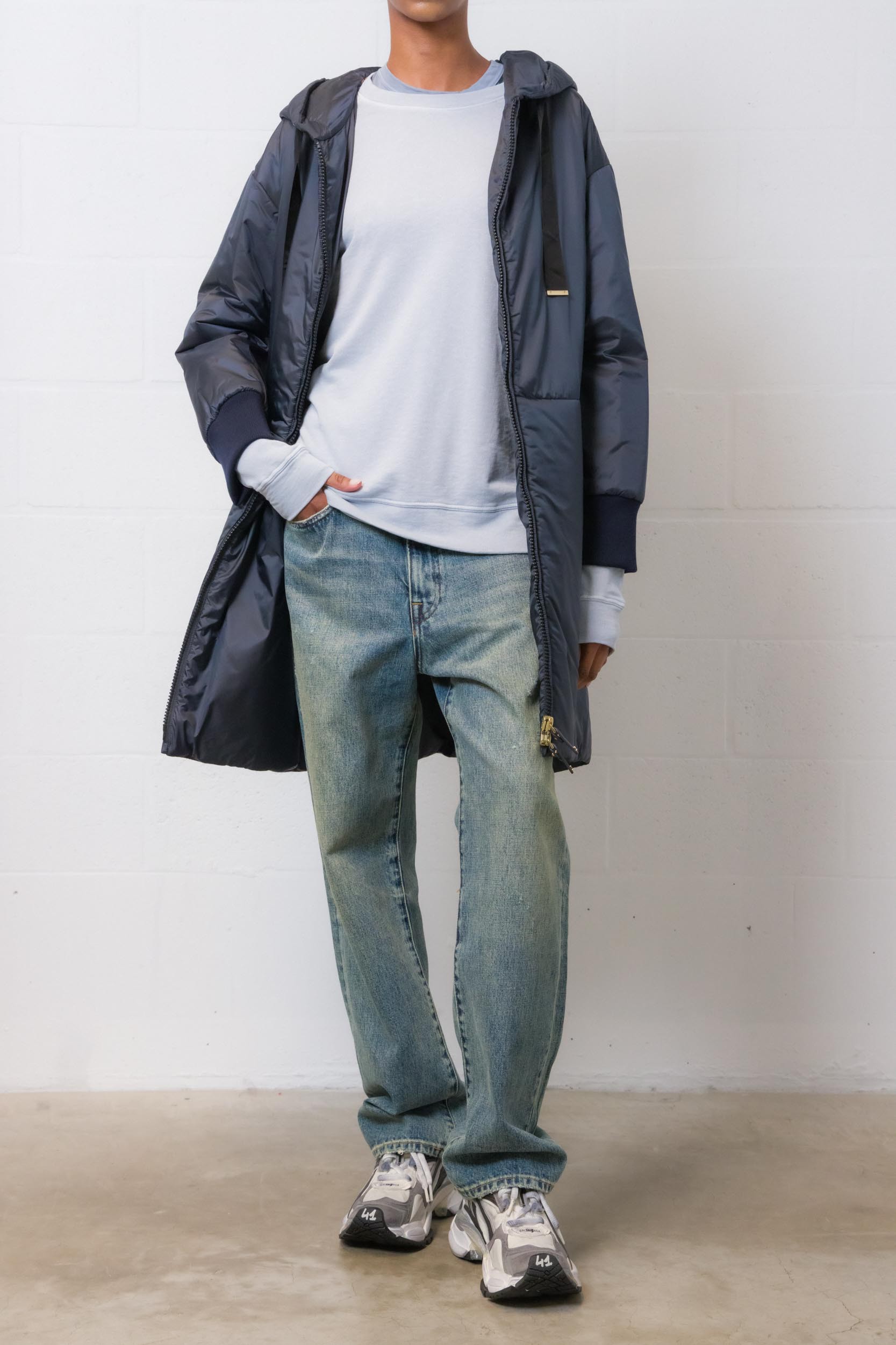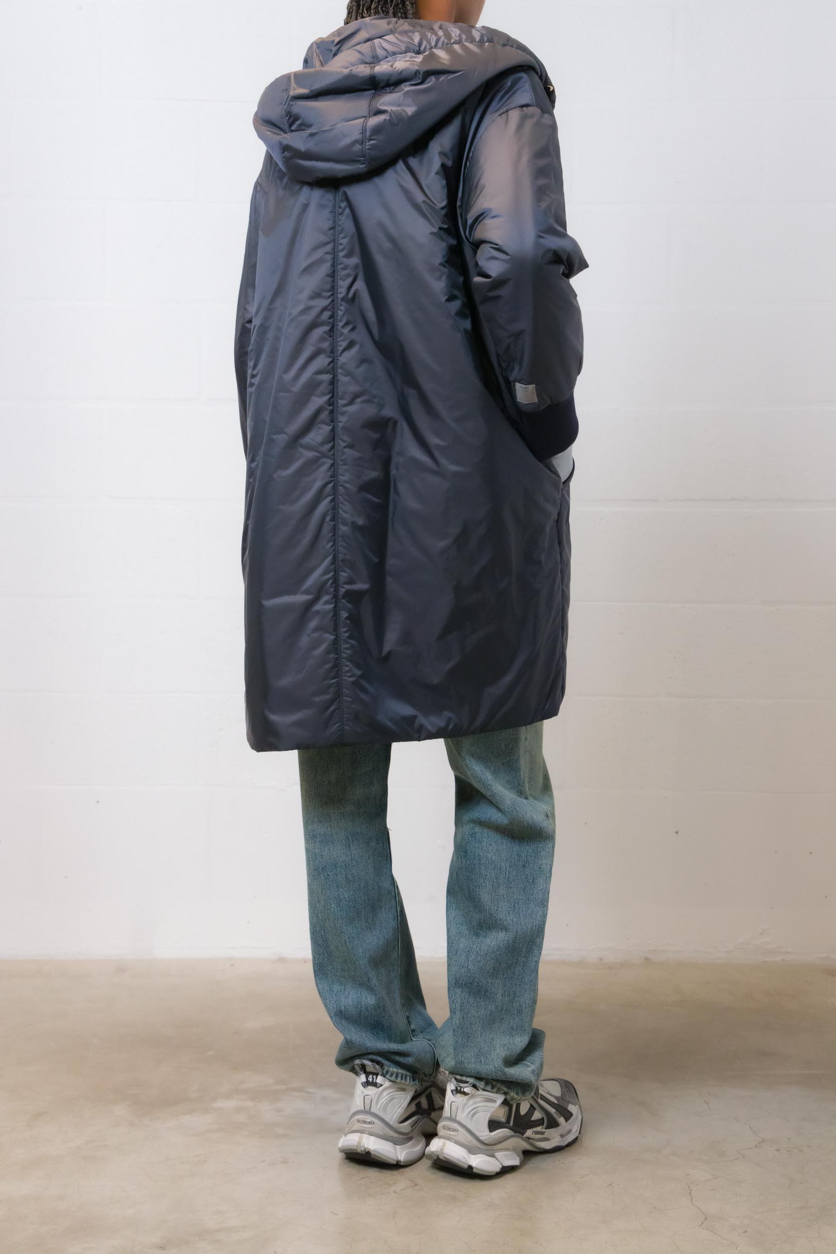 This navy blue nylon parka is designed by MaxMara. It stands out for its water-repellent and waterproof fabric, featuring a hood and kangaroo pockets. The jacket is padded with recycled fibers to create a special filling, ensuring optimal thermal insulation.
