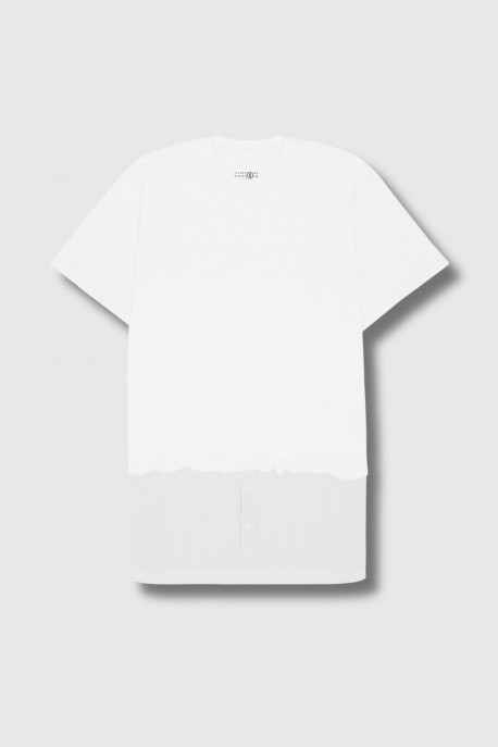This long shirt-style T-shirt by MM6 embodies the brand's signature hybrid approach. Crafted from cotton jersey with dropped shoulders and a relaxed fit, it combines the comfort of a T-shirt with the clean structure of a striped poplin shirt. This fusion of two pieces into one illustrates MM6's ongoing exploration of construction and the subversion of codes. At the back, the signature white topstitching subtly affirms the House's identity.