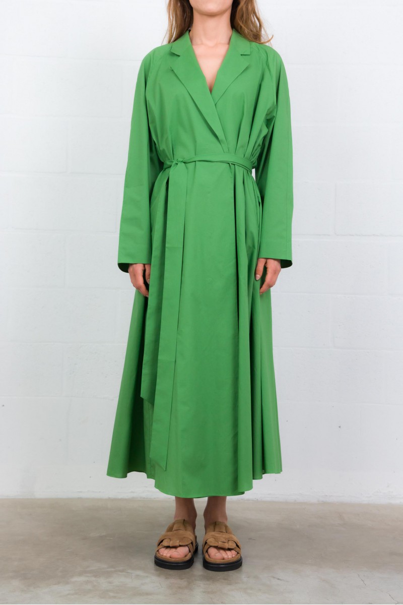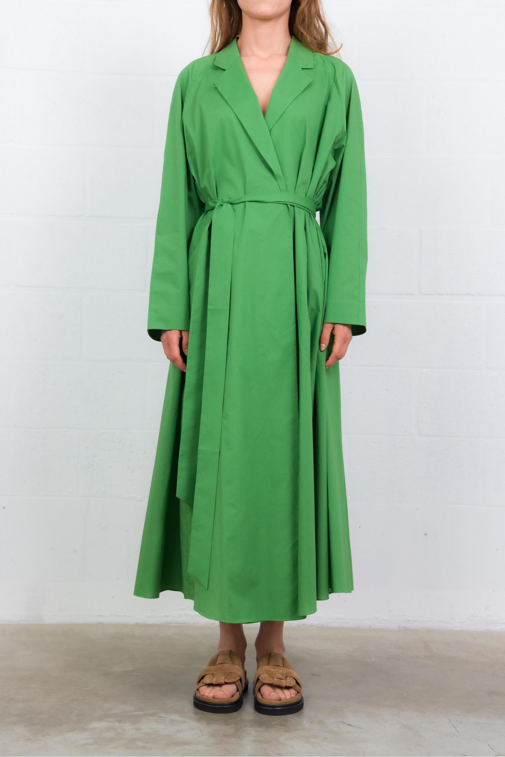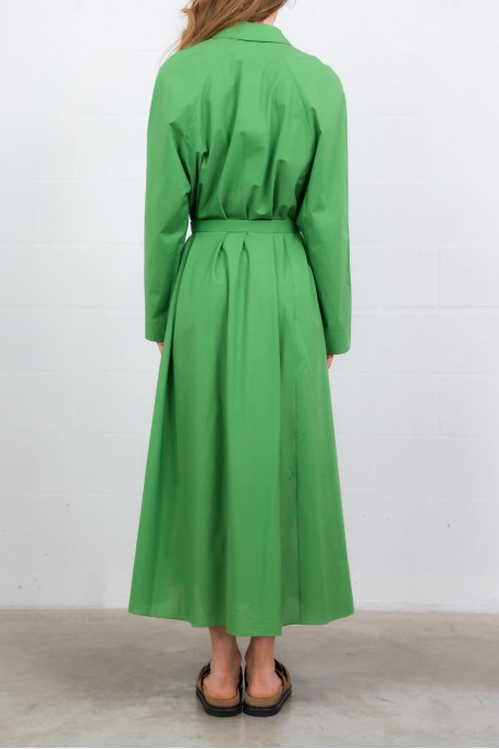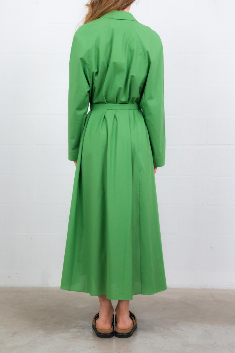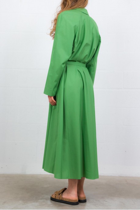 This green cotton poplin coat dress is by Indress. Crafted from Italian organic cotton poplin, it combines elegance and ease with a structured, loose silhouette. Its hidden button placket with a single visible button and adjustable lapel collar with a mother-of-pearl button add refined details. Featuring side seam pockets and a long belt to define the waist, it blends style with practicality.