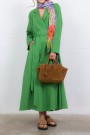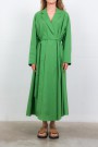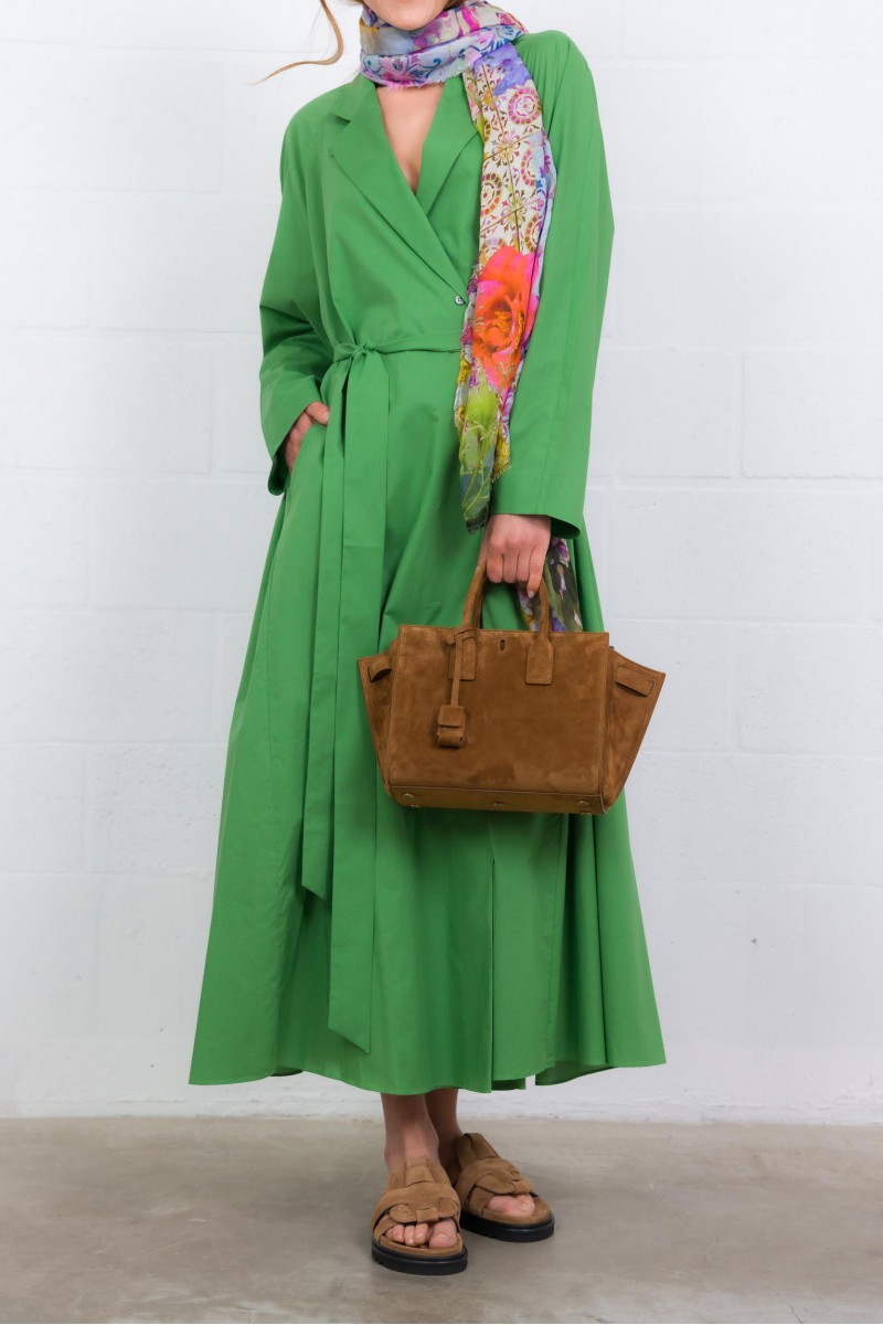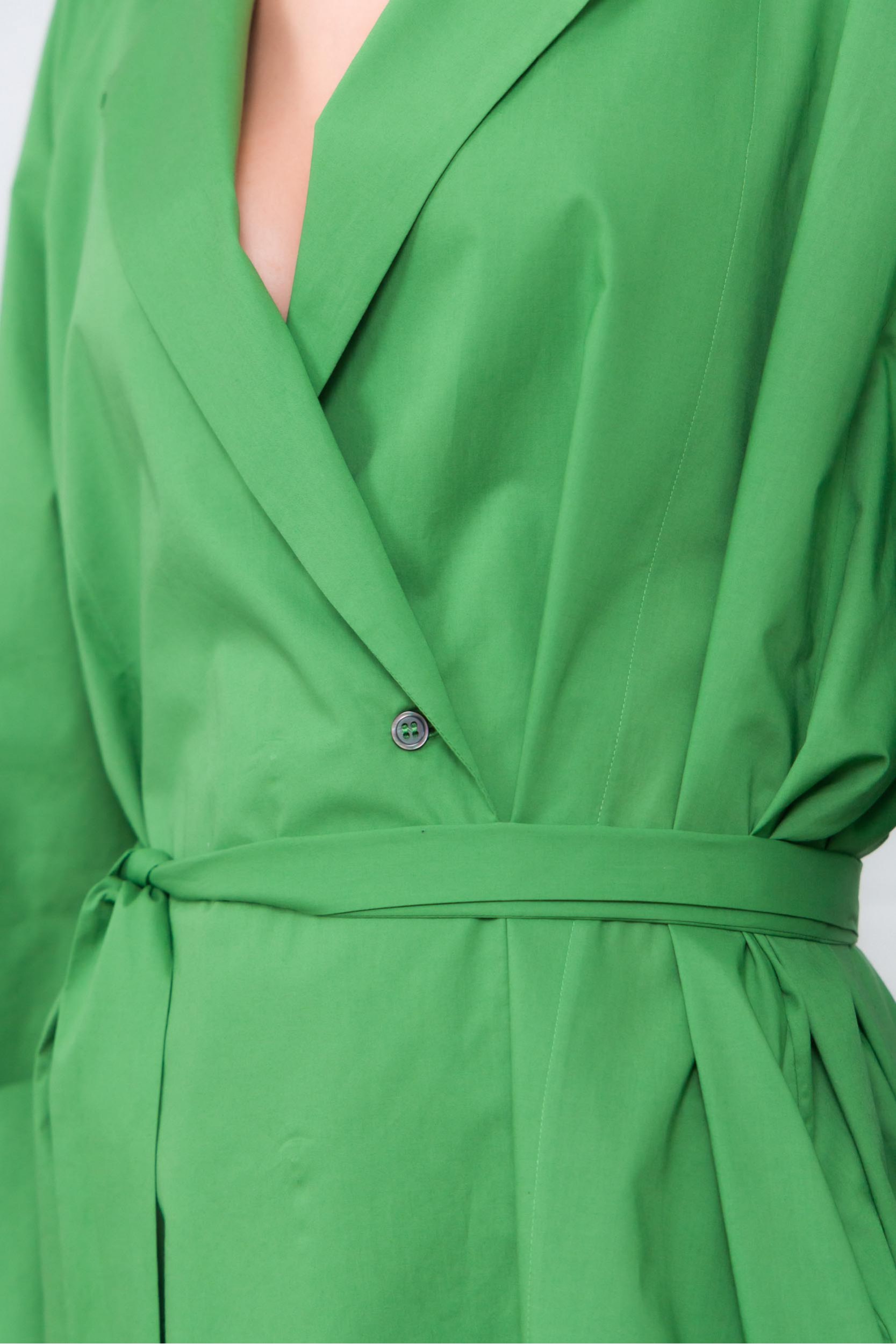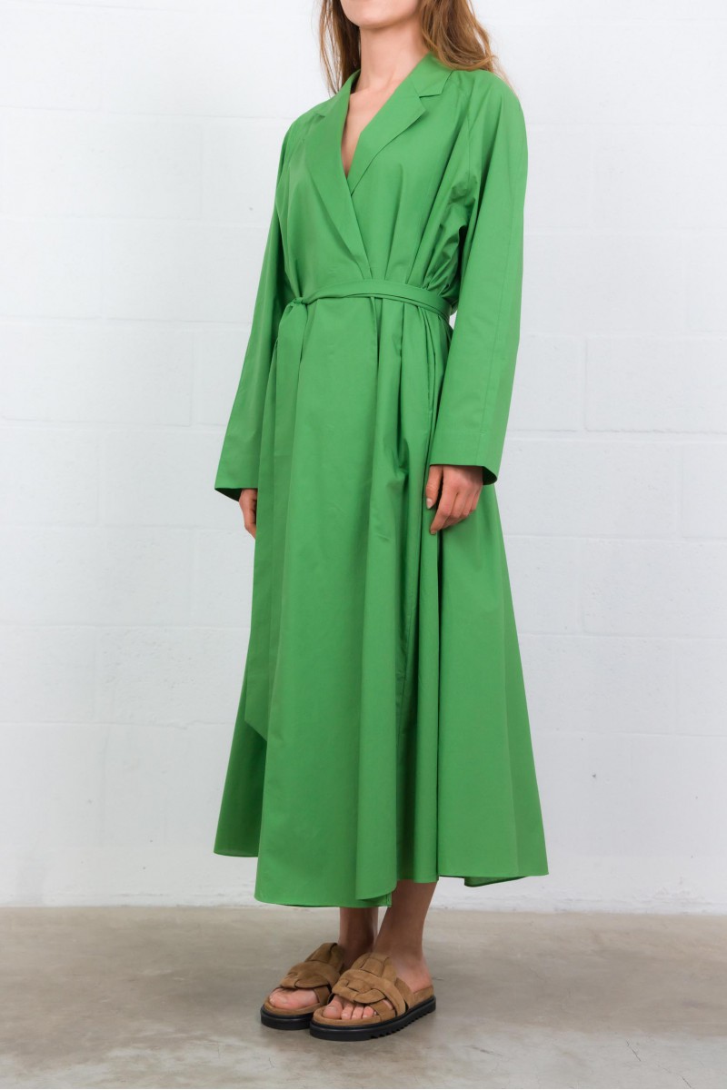 This green cotton poplin coat dress is by Indress. Crafted from Italian organic cotton poplin, it combines elegance and ease with a structured, loose silhouette. Its hidden button placket with a single visible button and adjustable lapel collar with a mother-of-pearl button add refined details. Featuring side seam pockets and a long belt to define the waist, it blends style with practicality.
