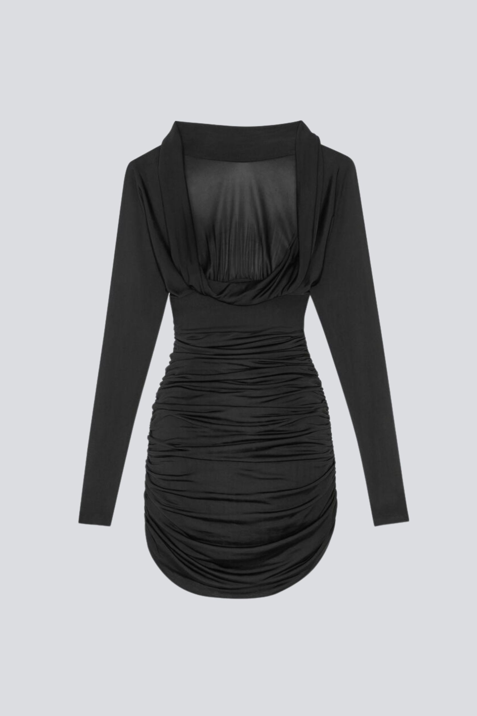 This short dress in black viscose is designed by Saint Laurent. It is made of viscose from certified and sustainably managed forests. It has a cowl neck in the back.