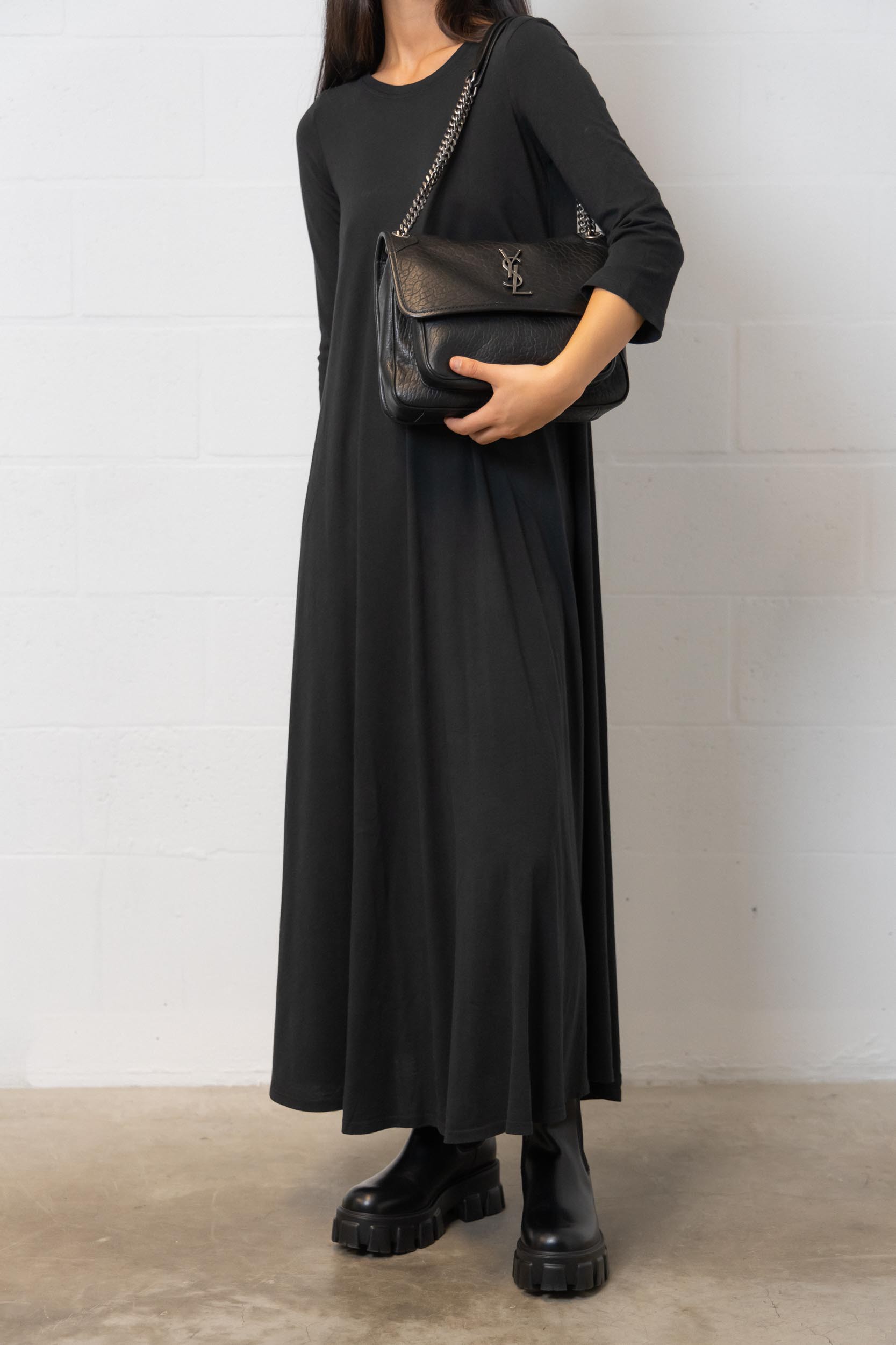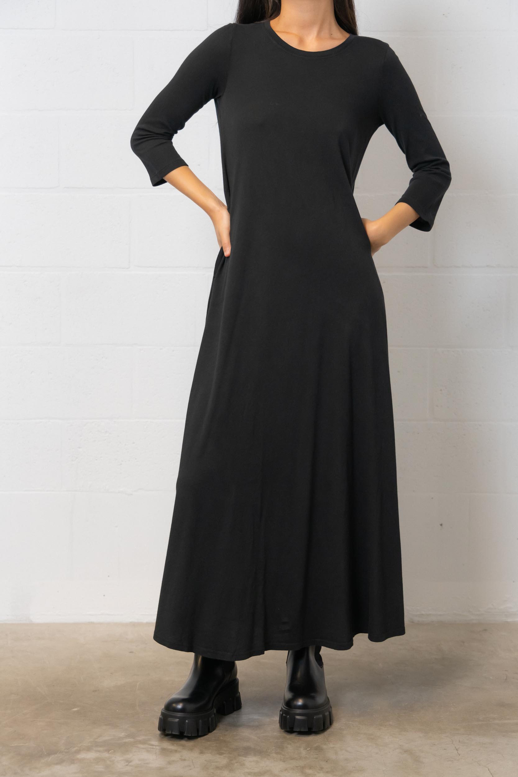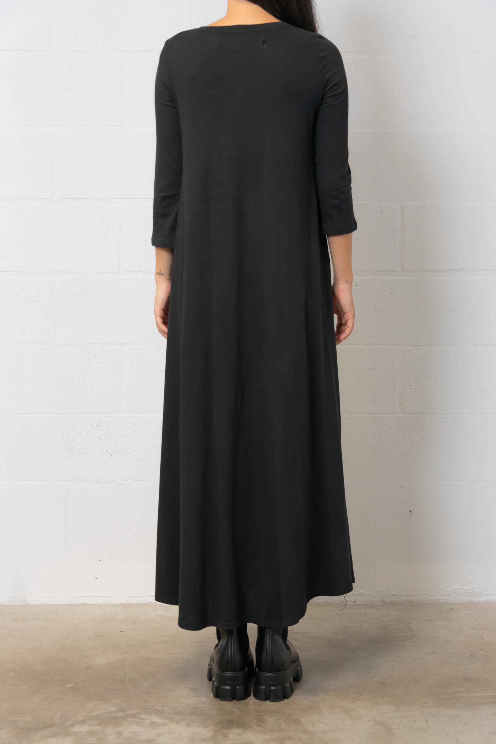 This Drama Maxi dress in black cotton jersey is designed by Raquel Allegra. It has a long, flowing cut, a round neck and long sleeves.