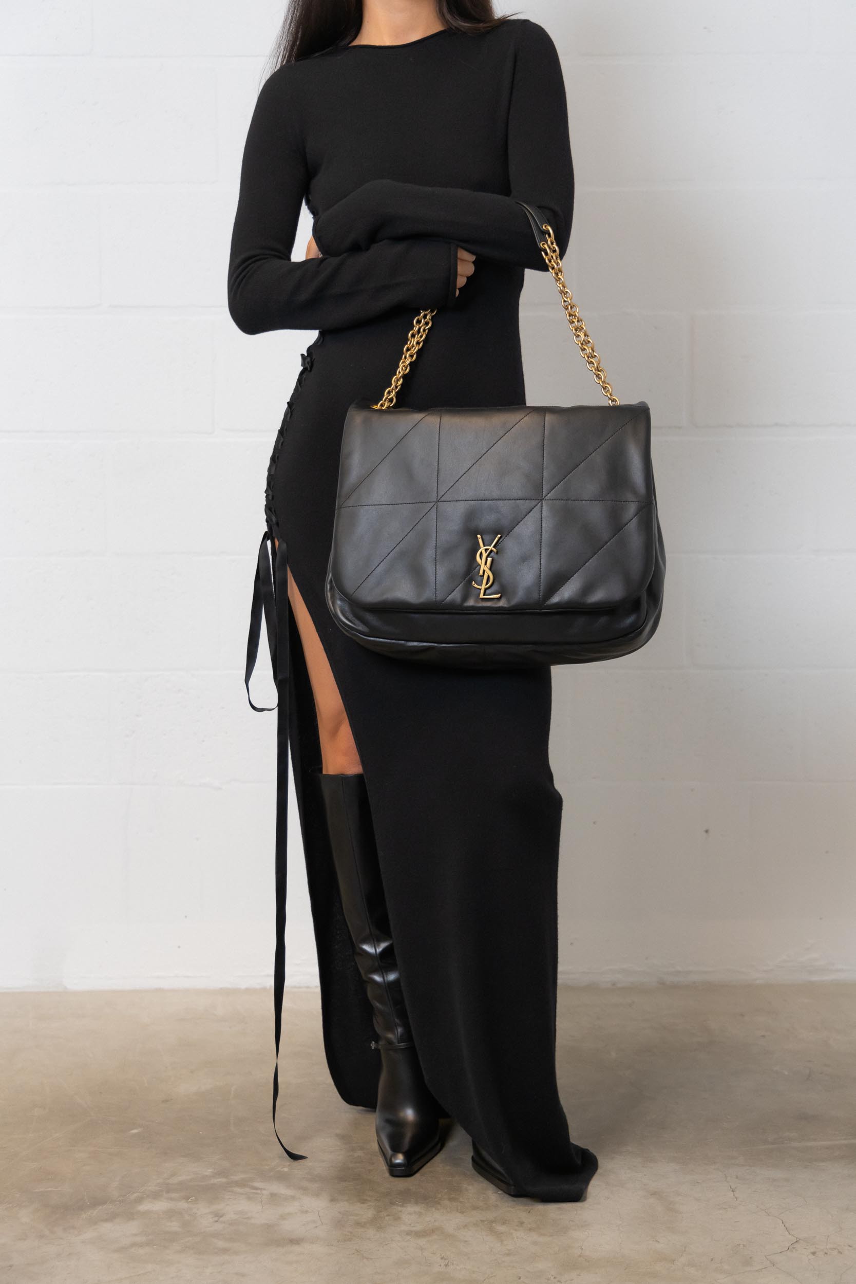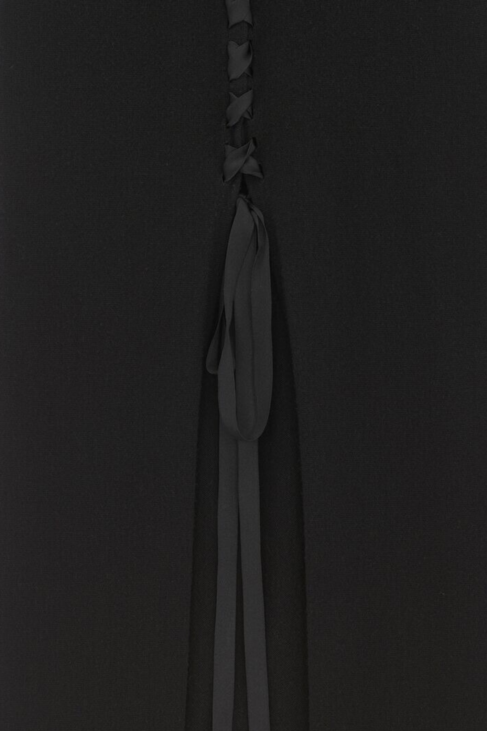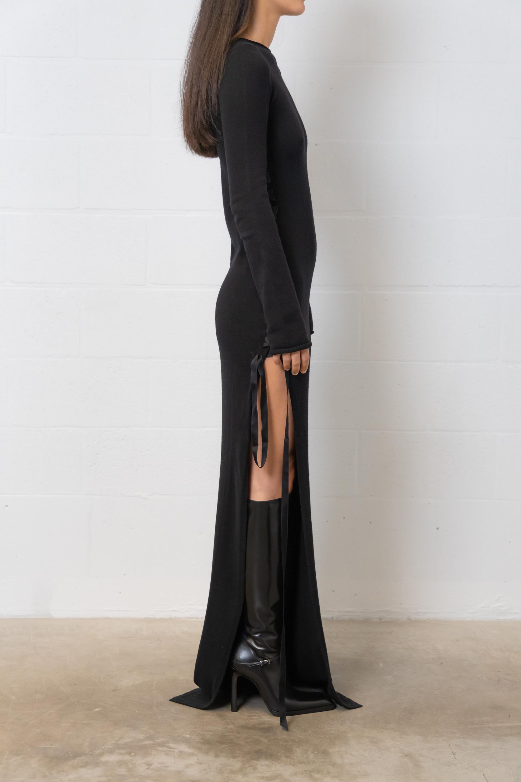 This long black wool dress is designed by Saint Laurent. It has a long cut with bell sleeves and a side slit with a tied ribbon.