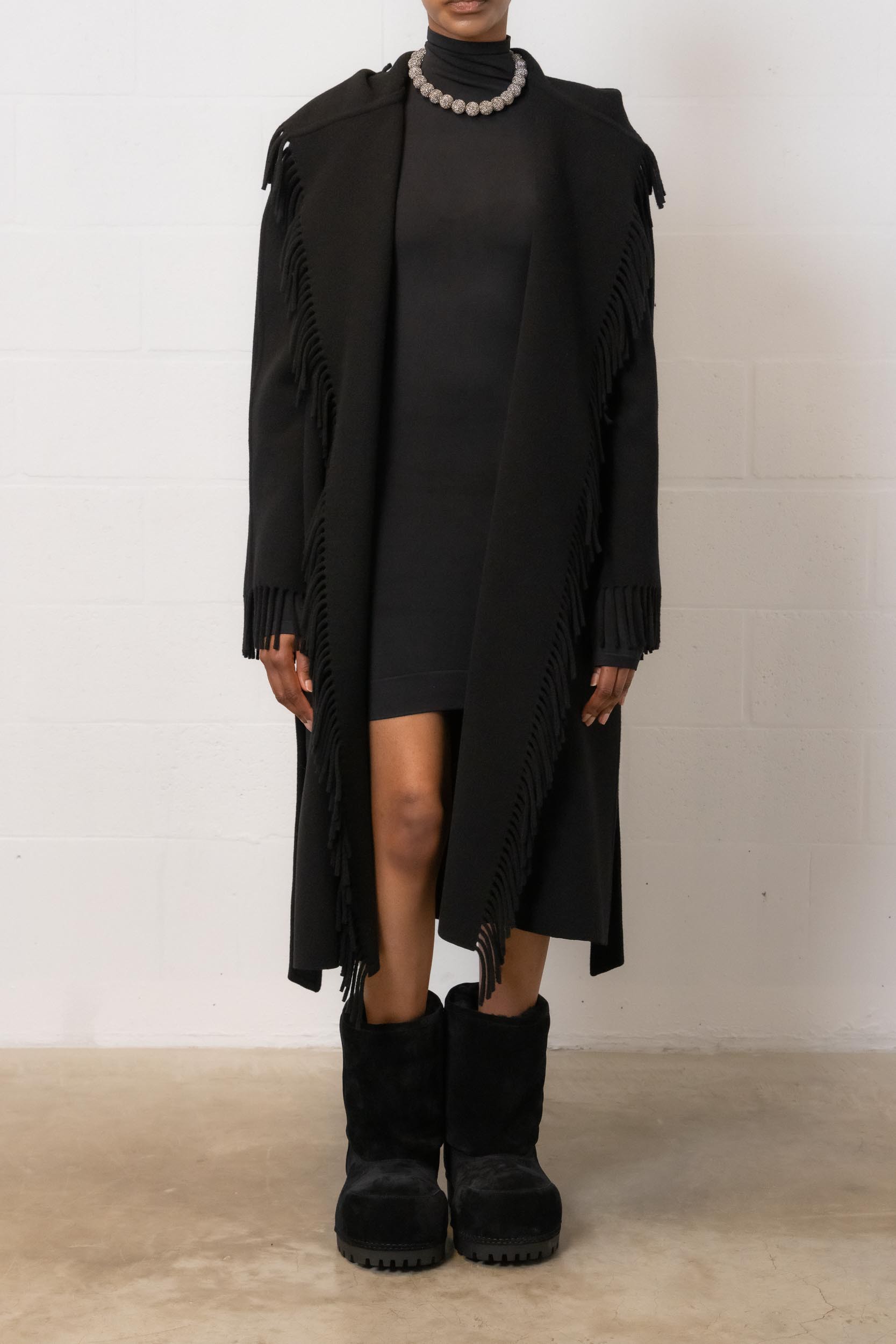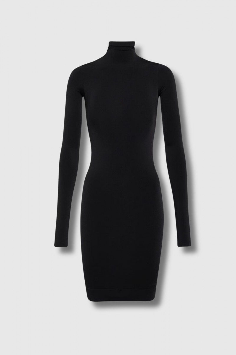 This black mini dress is designed by Balenciaga. It's cut close to the body thanks to its stretch fabric and high collar.