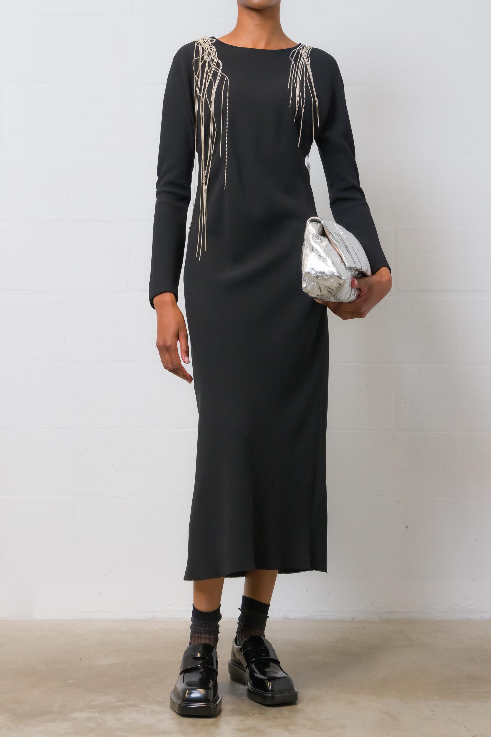 This black crepe de Chine dress is designed by Dries Van Noten. This dress is adorned with rows of sparkling crystals and curb chains that fall haphazardly down the front. It features a subtly cinched waist.