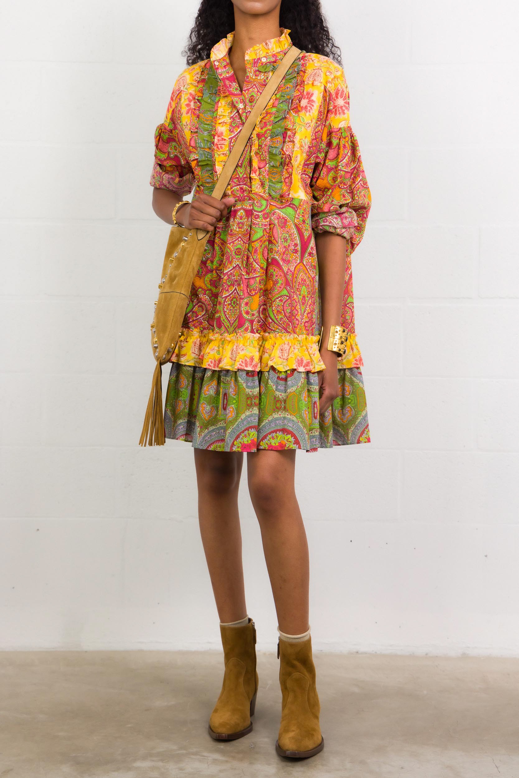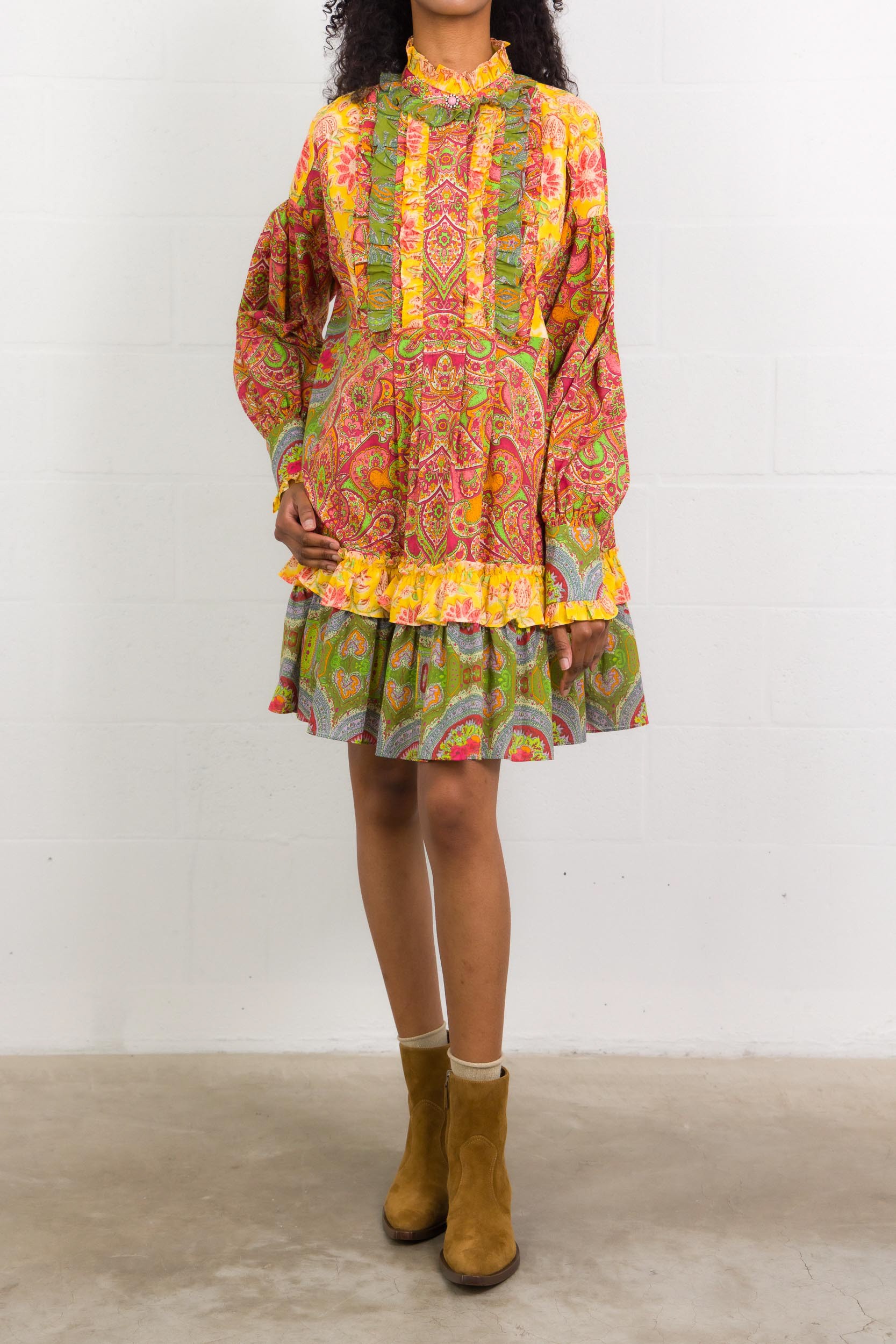This orange and red printed ruffled cashmere chiffon short dress is designed by Valentino. It features a front button fastening, a patchwork finish and puffed sleeves with ruffles.