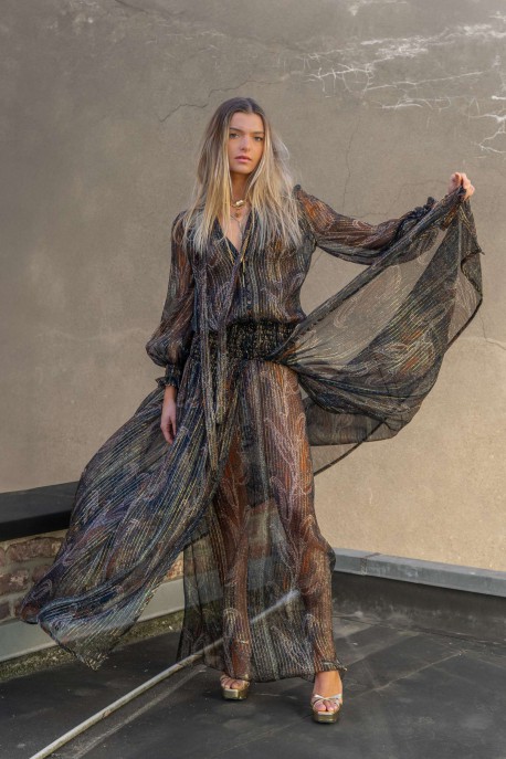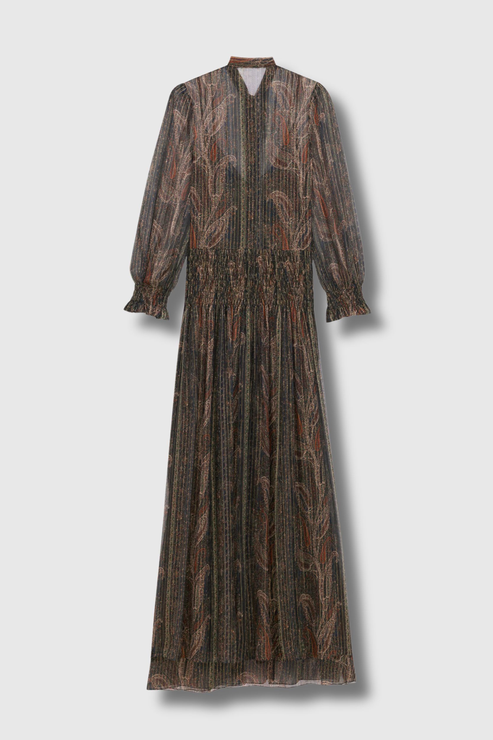 This black paisley print luxury silk crepon lavallière dress is designed by Saint Laurent. It is made from a semi-transparent fabric and is detailed with a gathered lavallière collar, a pleated waist and puffed sleeves. This piece has a flared cut.