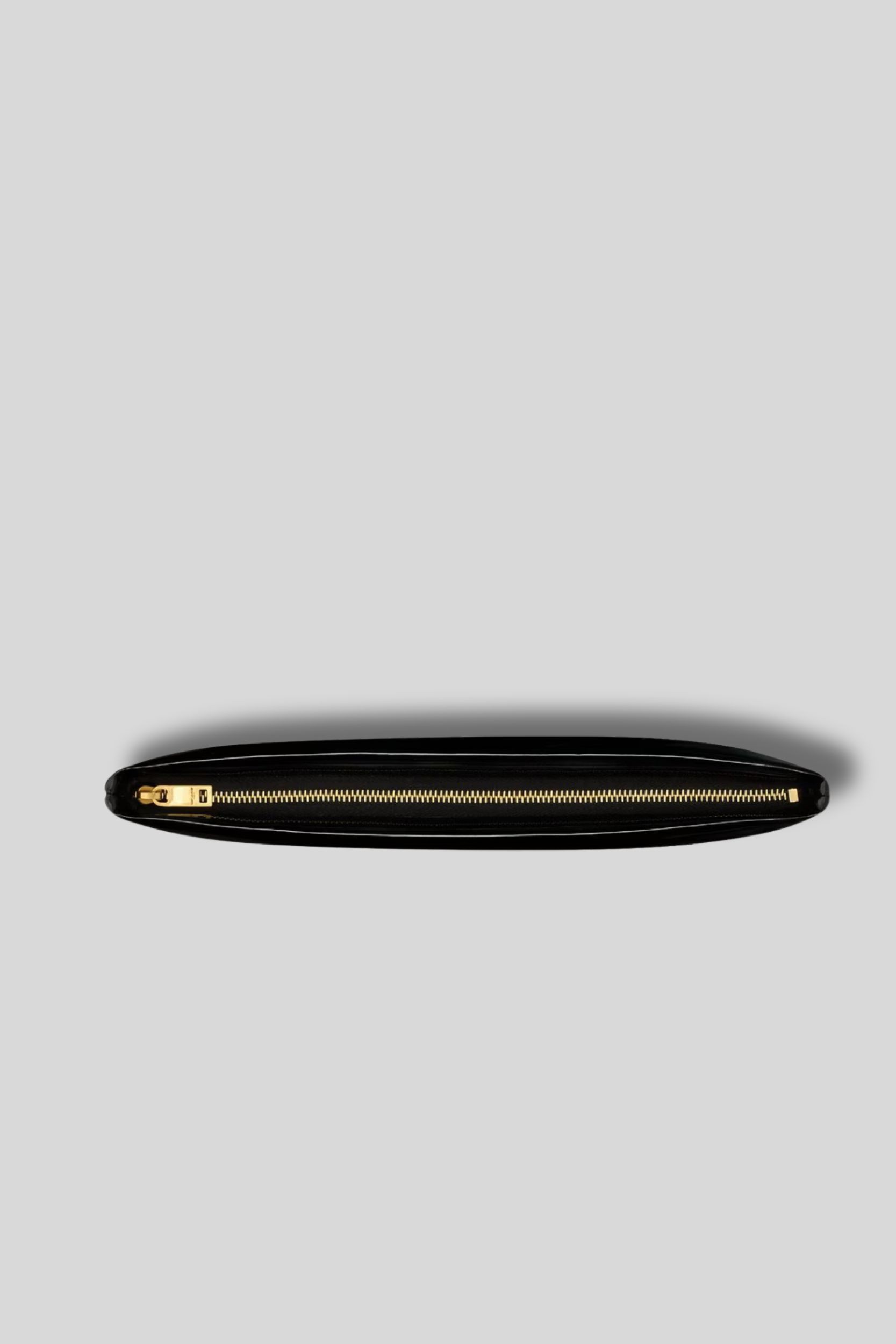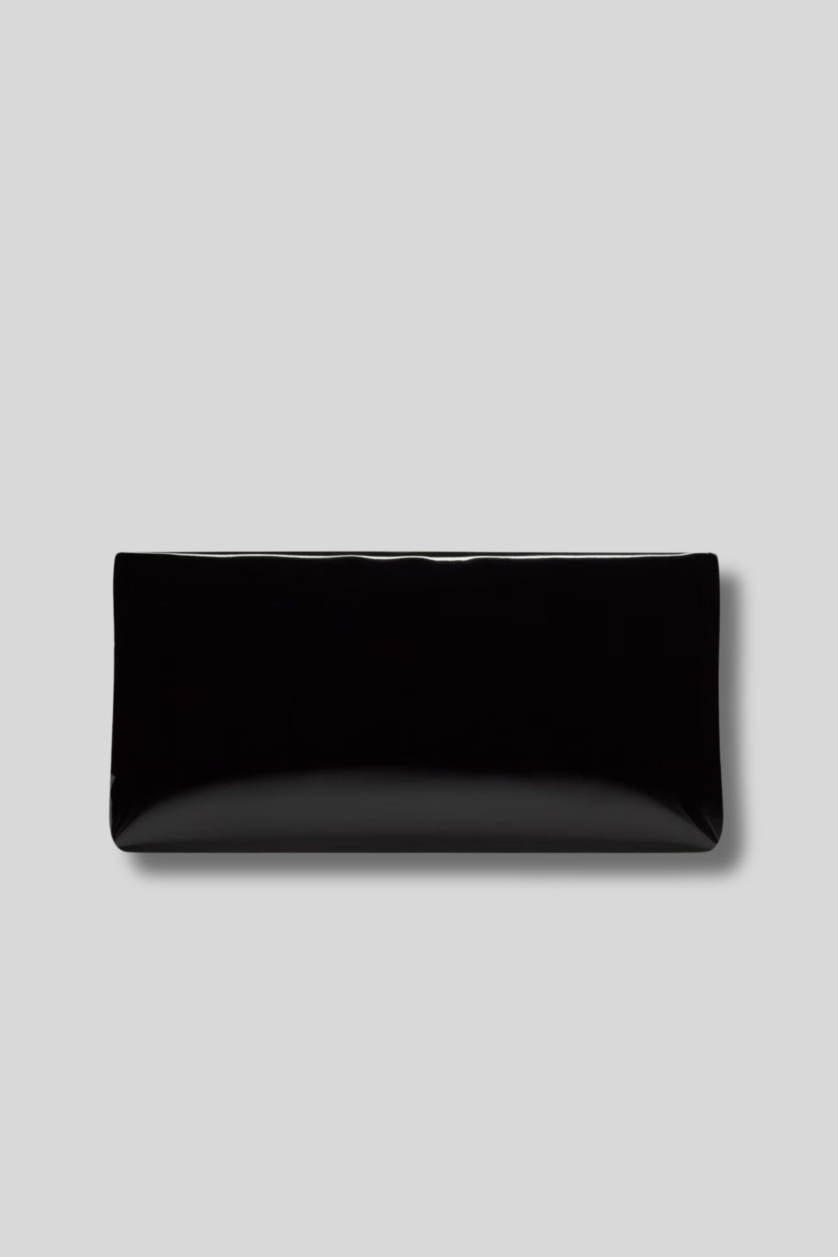 This Calypso clutch bag in glossy black canvas is designed by Saint Laurent. It features a main compartment and a zipper closure.
