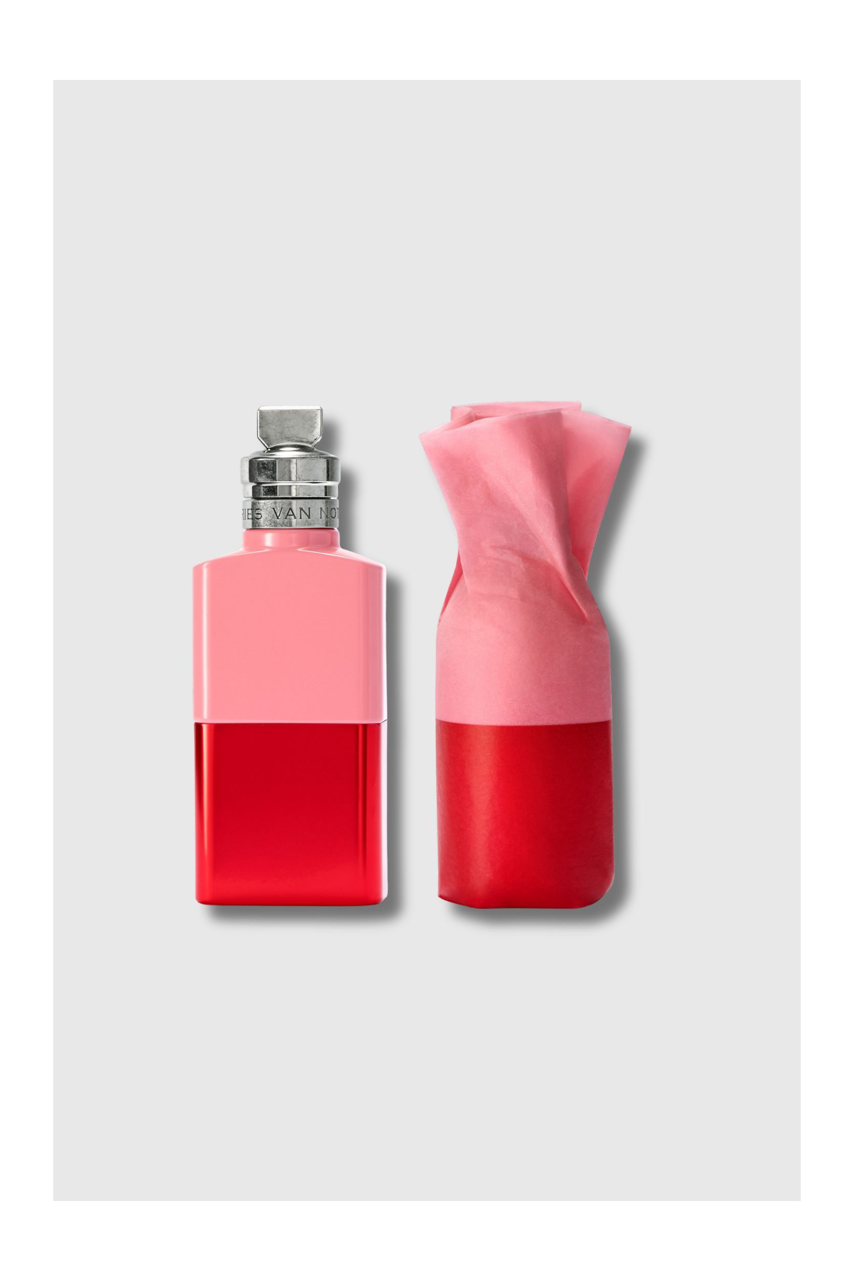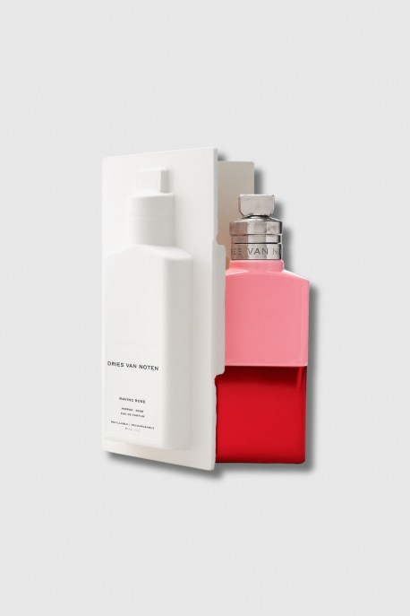 Raving Rose, the Eau de Parfum by Dries Van Noten, boldly reinvents the rose. Here, the classic flower becomes modern and explosive, electrified by a duo of pink and black pepper that diffuses a burning, sensual freshness. At its heart, an opulent rose—water and absolute—blooms with contemporary intensity, before softening into an enveloping base of cashmeran and musk. The bottle plays on contrast: a vibrant bubblegum pink cap atop a metallic red base, creating a modern and captivating composition.