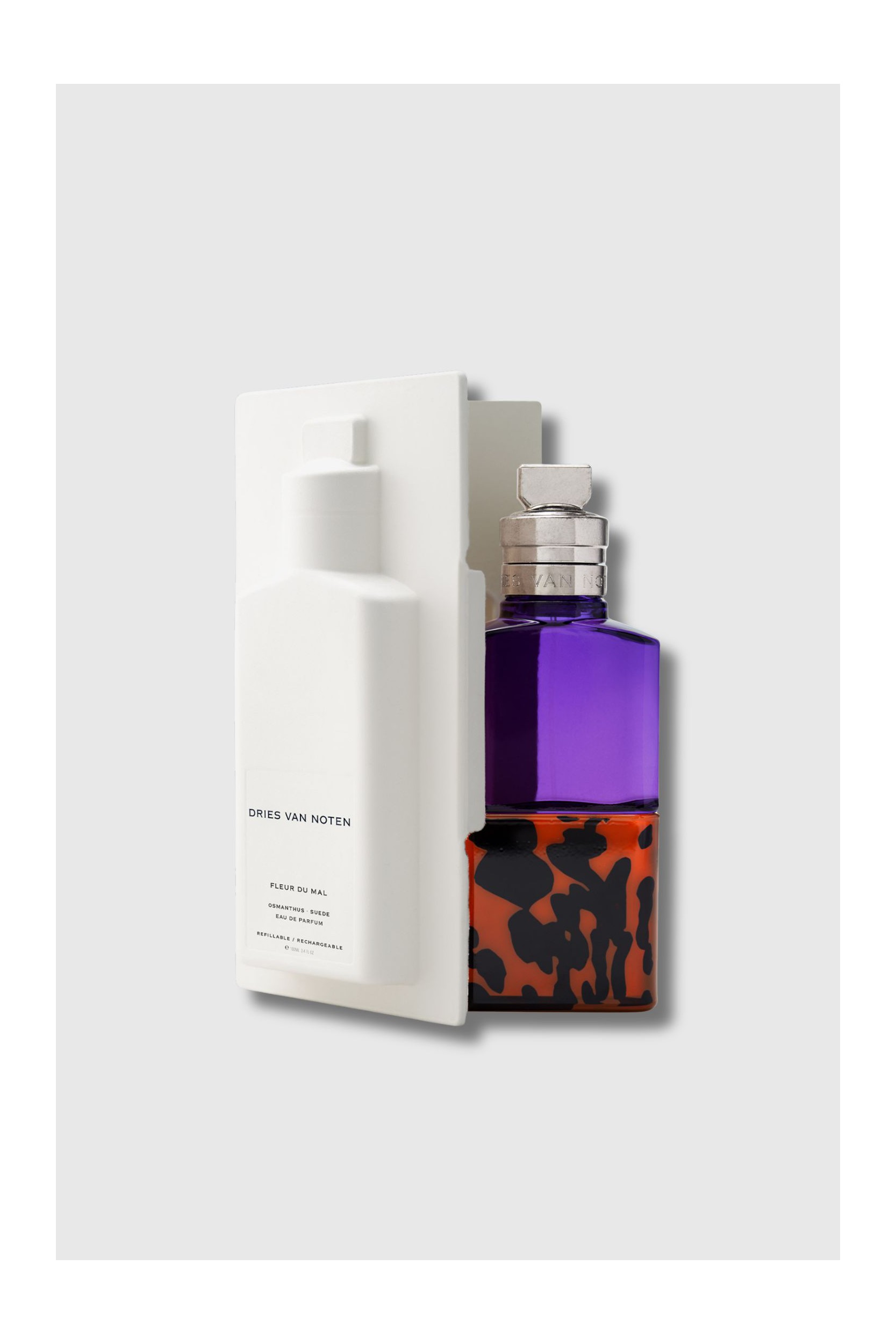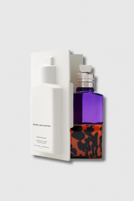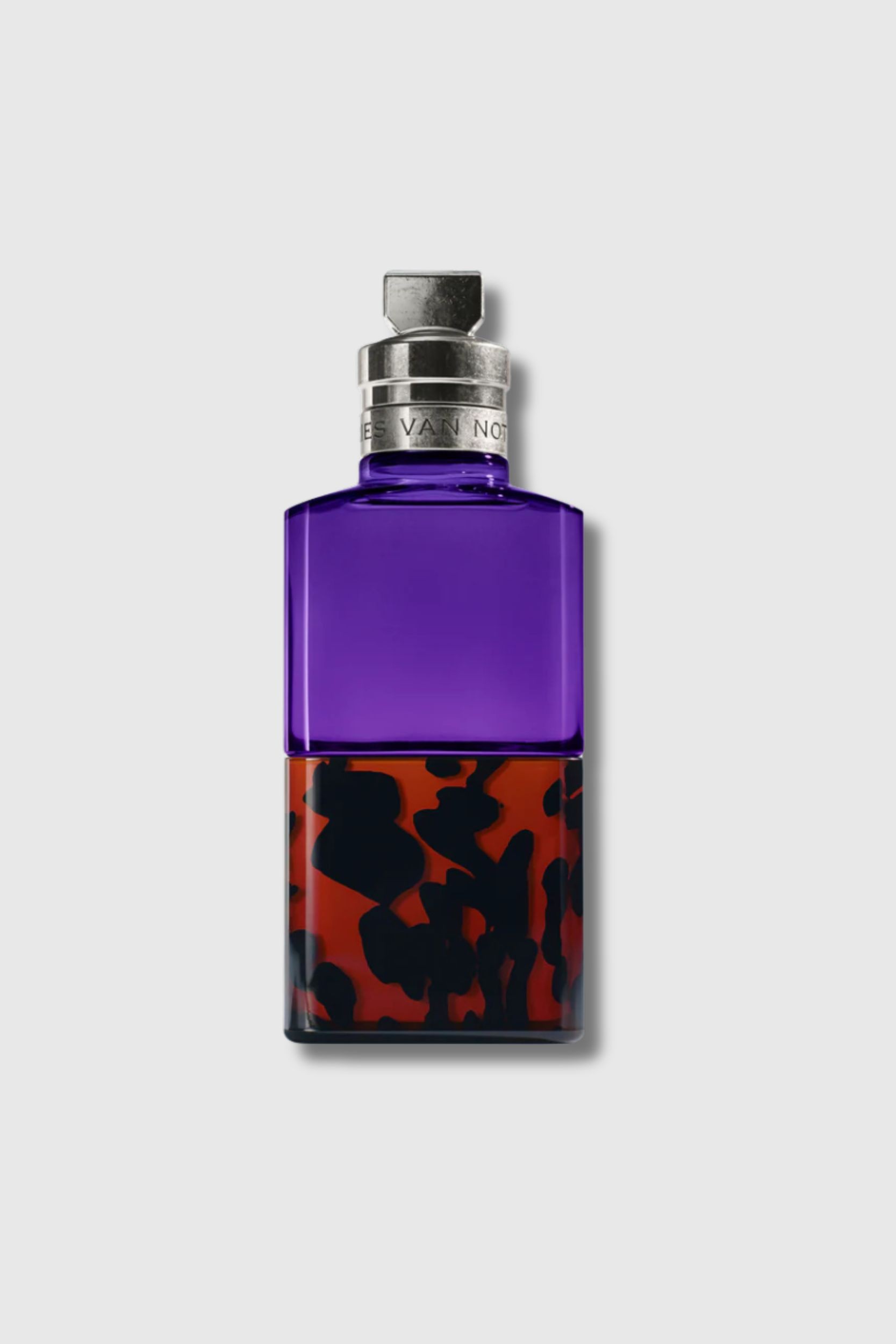 Fleur du Mal, the Eau de Parfum by Dries Van Noten, explores a modern and sensual sensuality. Peach juice opens the fragrance with a juicy sweetness, soon disturbed by a heart of osmanthus and jasmine, flowers with a captivating duality, both angelic and almost animalistic. The trail is velvety and deep, blending suede and amber in an addictive warmth. Composed of 88% natural ingredients, this creation is embodied in a bottle with striking contrasts: a sophisticated tortoiseshell base and intense purple glass.