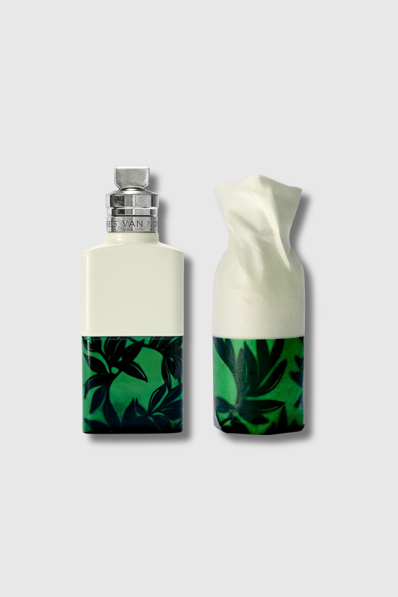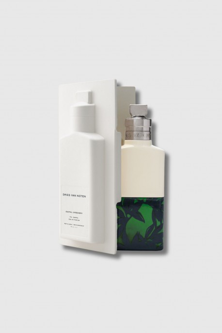 Santal Greenery, the Eau de Parfum by Dries Van Noten, reveals an addictive elegance where vegetal freshness and woody warmth are poetically balanced. Bergamot and grapefruit open a luminous trail, soon joined by the delicate greenness of violet leaves and a creamy fig accord. At the base, resilient sandalwood combines with enveloping white musk for a refined and soothing signature. Composed of 90% natural ingredients, the fragrance comes in an opaque white bottle with a green base adorned with delicate, modern plant shadows.