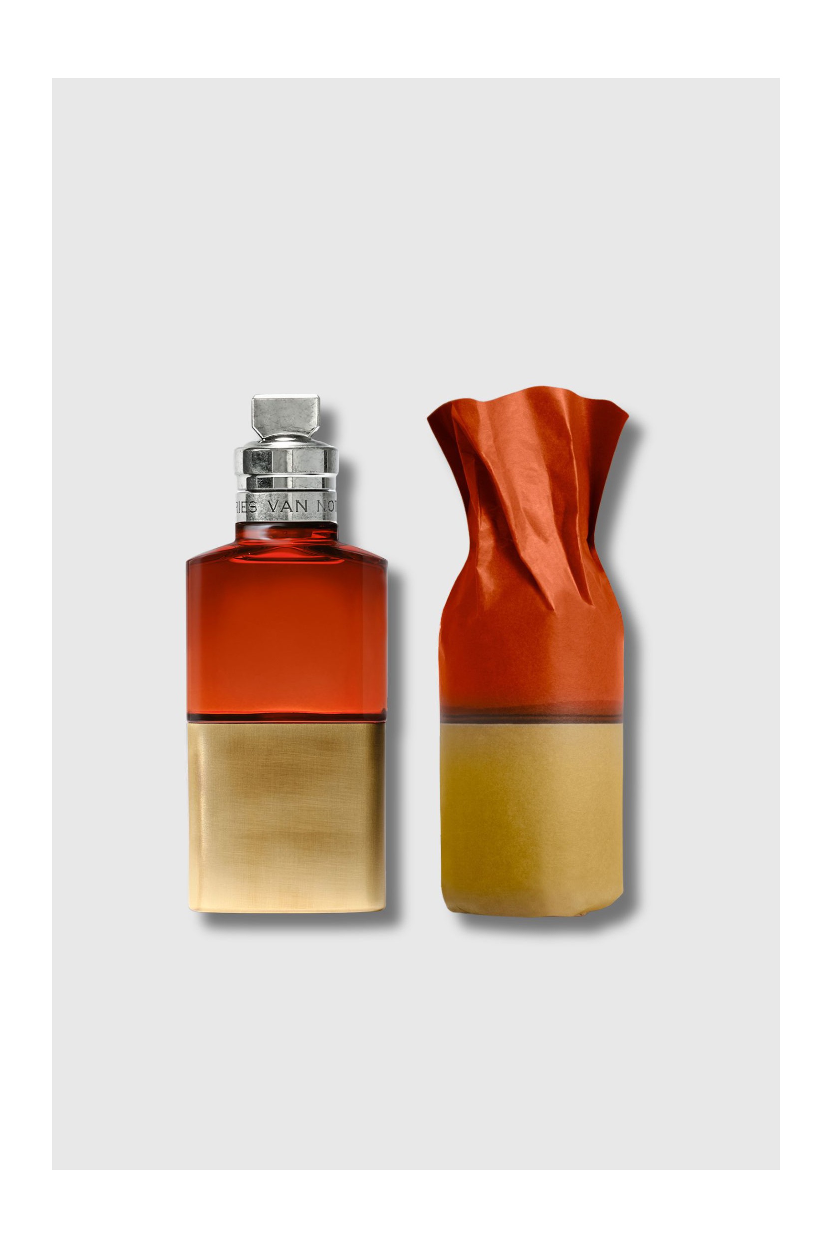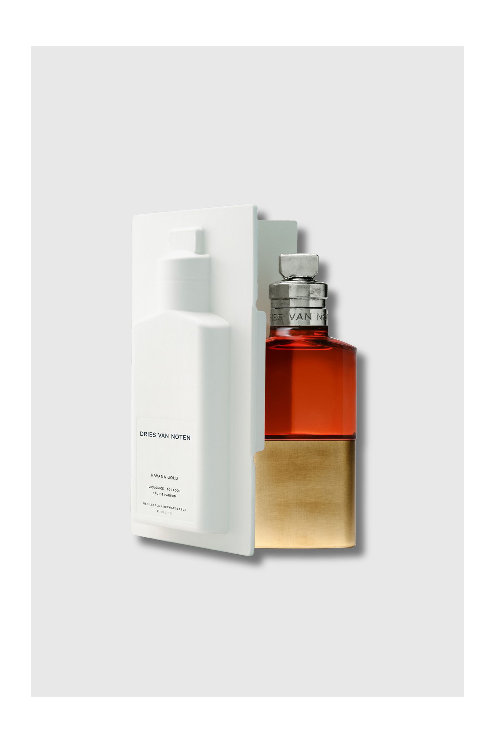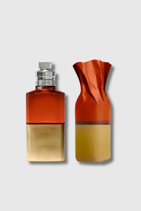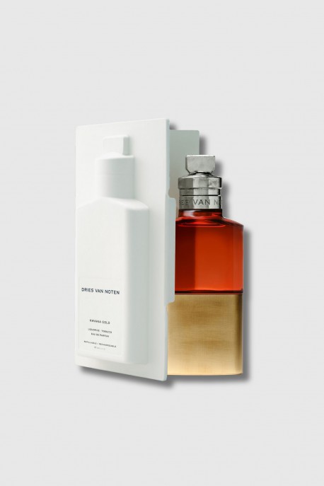 Havana Gold, the Eau de Parfum by Dries Van Noten, evokes the sensual and joyful atmosphere of Havana's bars. Fresh aniseed and sweet licorice intertwine with a heart of tobacco leaves with leathery, smoky, and spicy accents, enhanced by cinnamon and benzoin. The trail melts into an opulent amber, enriched with roasted tonka and notes of leather and cypriol, for an intoxicating and elegant fragrance. The incandescent amber glass bottle and golden brass, individually patinated, reveal a unique and refined alchemy.