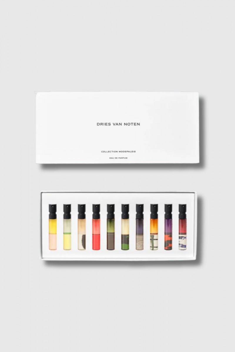 This Modepaleis Discovery Set 10 x 2 ml by Dries Van Noten pays tribute to the historic Antwerp boutique and the designer's iconic aesthetic. A true invitation to an olfactory journey, it brings together ten emblematic fragrances from the Modepaleis Collection, each based on an unexpected combination: Jardin de l'Orangerie (Orange Blossom & Sandalwood), Neon Garden (Mint & Iris), Rosa Carnivora (Rose & Vetiver), Raving Rose (Pepper & Rose), Cannabis Patchouli (Cannabis & Patchouli), Santal Greenery (Fig & Sandalwood), Voodoo Chile (Rosemary & Patchouli), Rock the Myrrh (Myrrh & Smoked Wood), Fleur du Mal (Osmanthus & Suede) and Soie Malaquais (Chestnut & Silk). An exceptional gift set to discover the art of contrasts unique to the House.