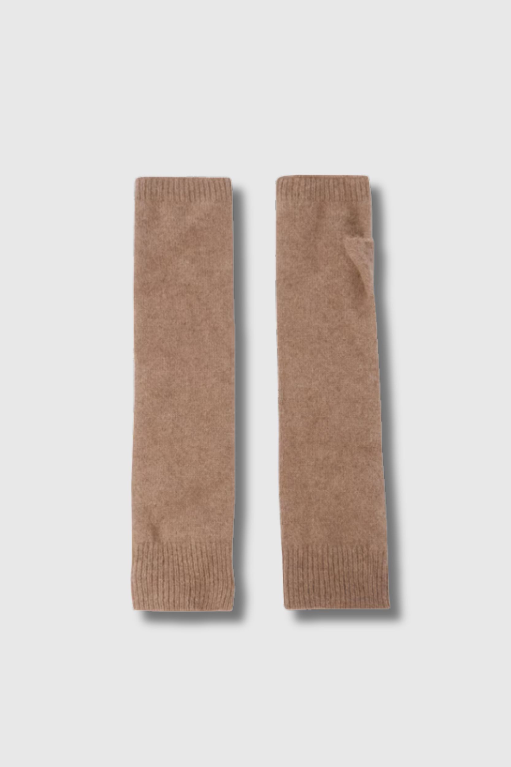 These beige knitted mittens are designed by Majestic Filatures. Made from a wool blend, they stand out for their soft, fluffy texture. Their long, fingerless design provides comfort and warmth while allowing for elegant freedom of movement.