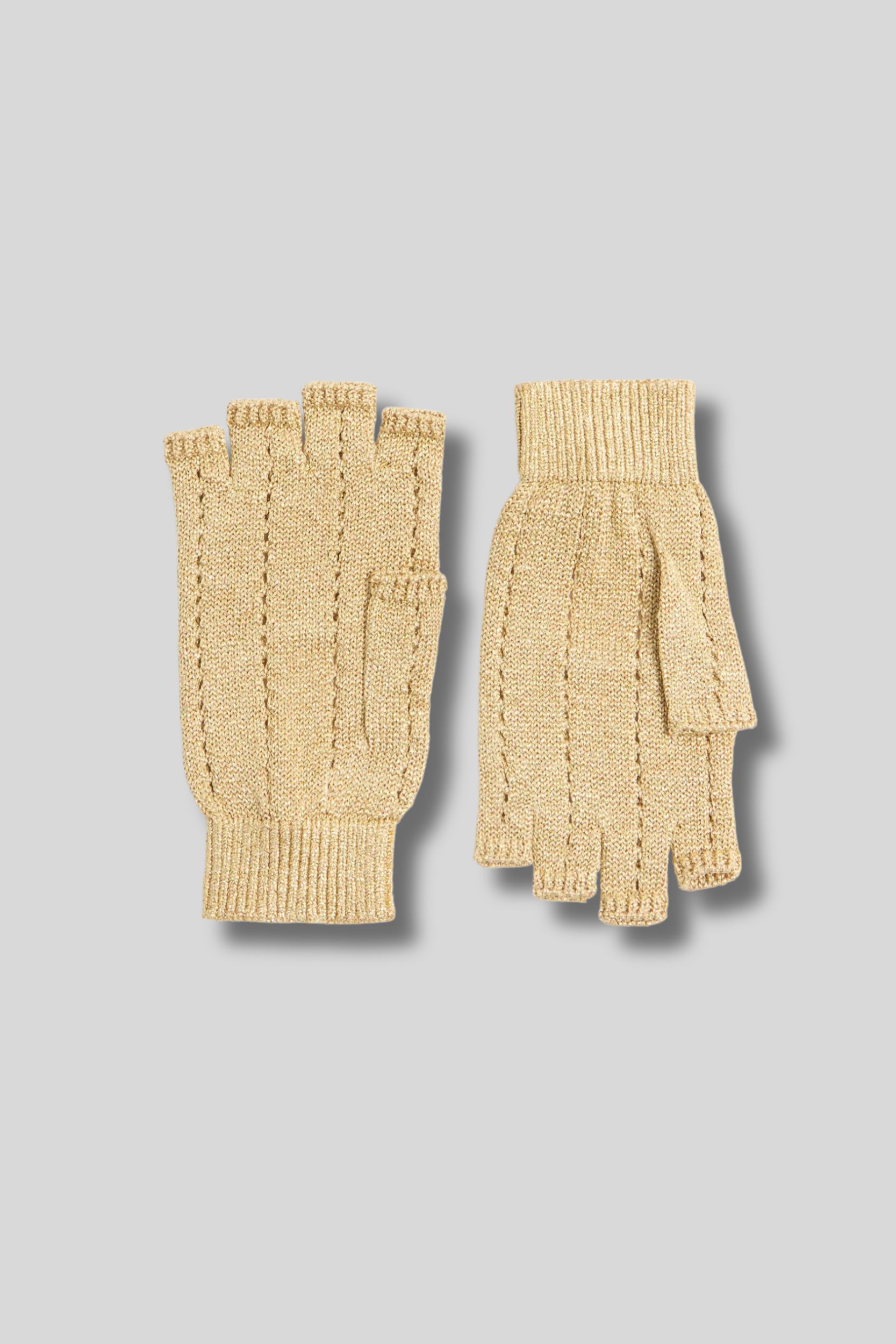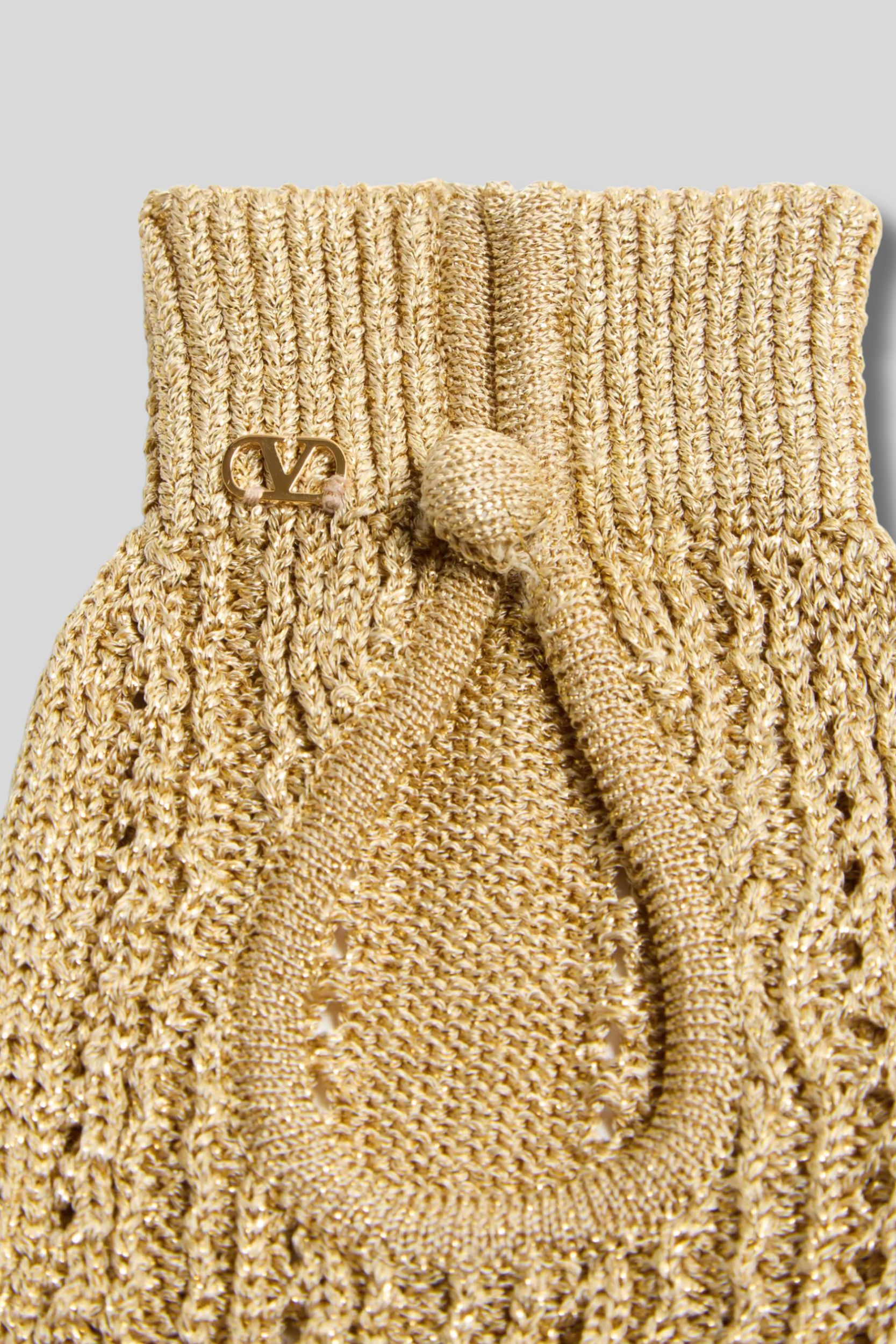 These knitted mittens in gold lurex are signed Valentino Garavani. They feature an opening at the top of the hand and are embellished with the house's gold logo.