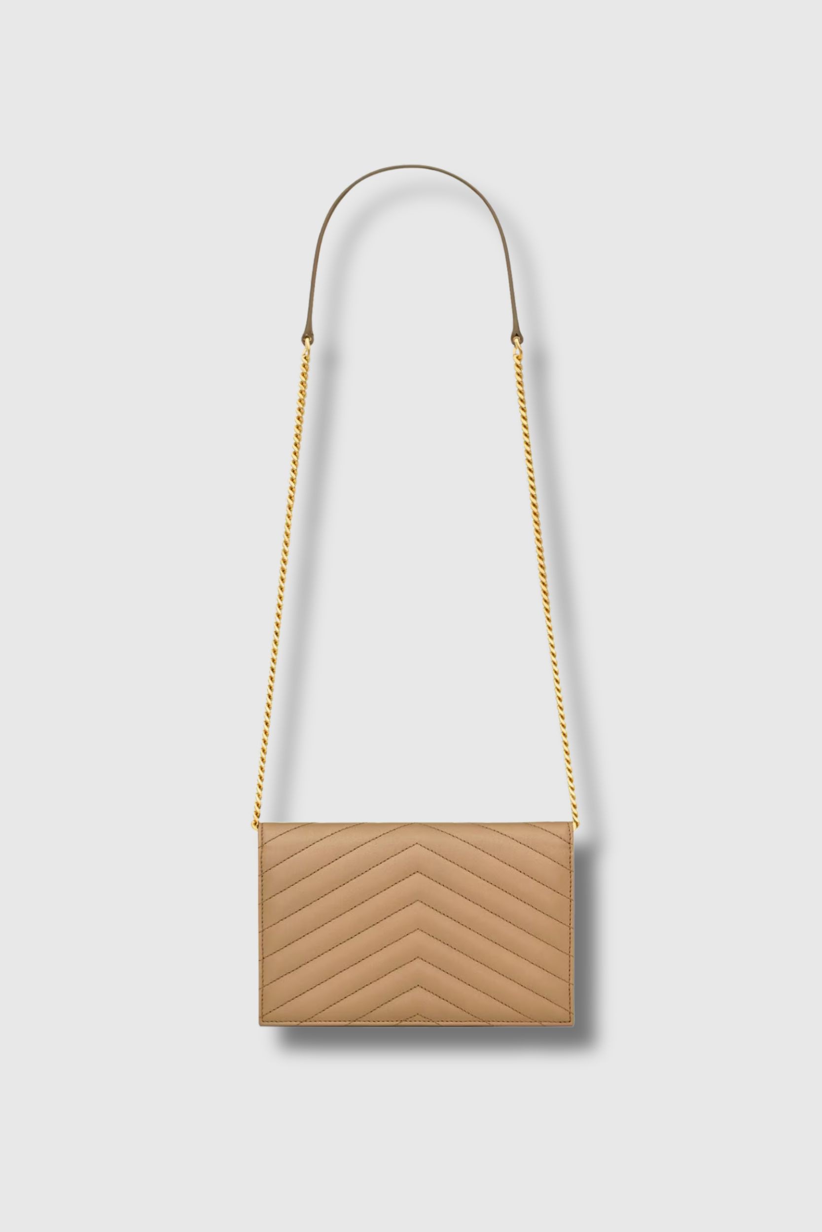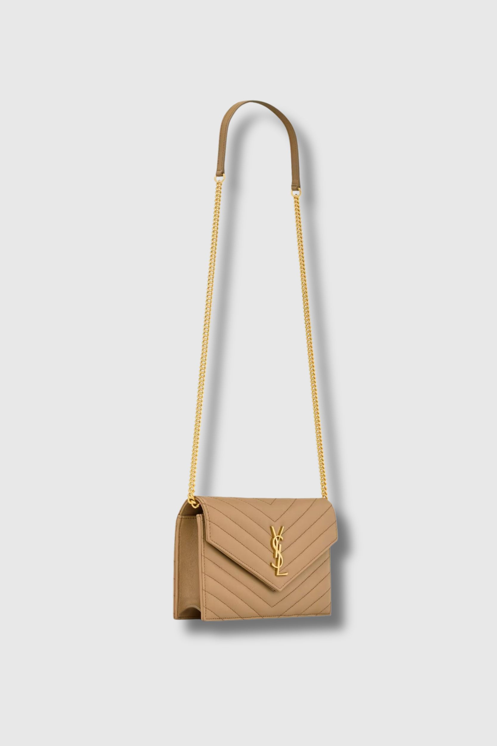 This Cassandre Envelope Chain Wallet bag in Natural Tan leather by Saint Laurent captivates with its compact size and iconic look. Adorned with the Cassandre monogram and signature quilted chevron stitching, it combines refinement and practicality. Its chain shoulder strap with leather reinforcement allows it to be worn over the shoulder or across the body, while the leather-lined interior features a zipped pocket and a card slot. Gold-plated brass hardware and a snap closure complete this timeless design.