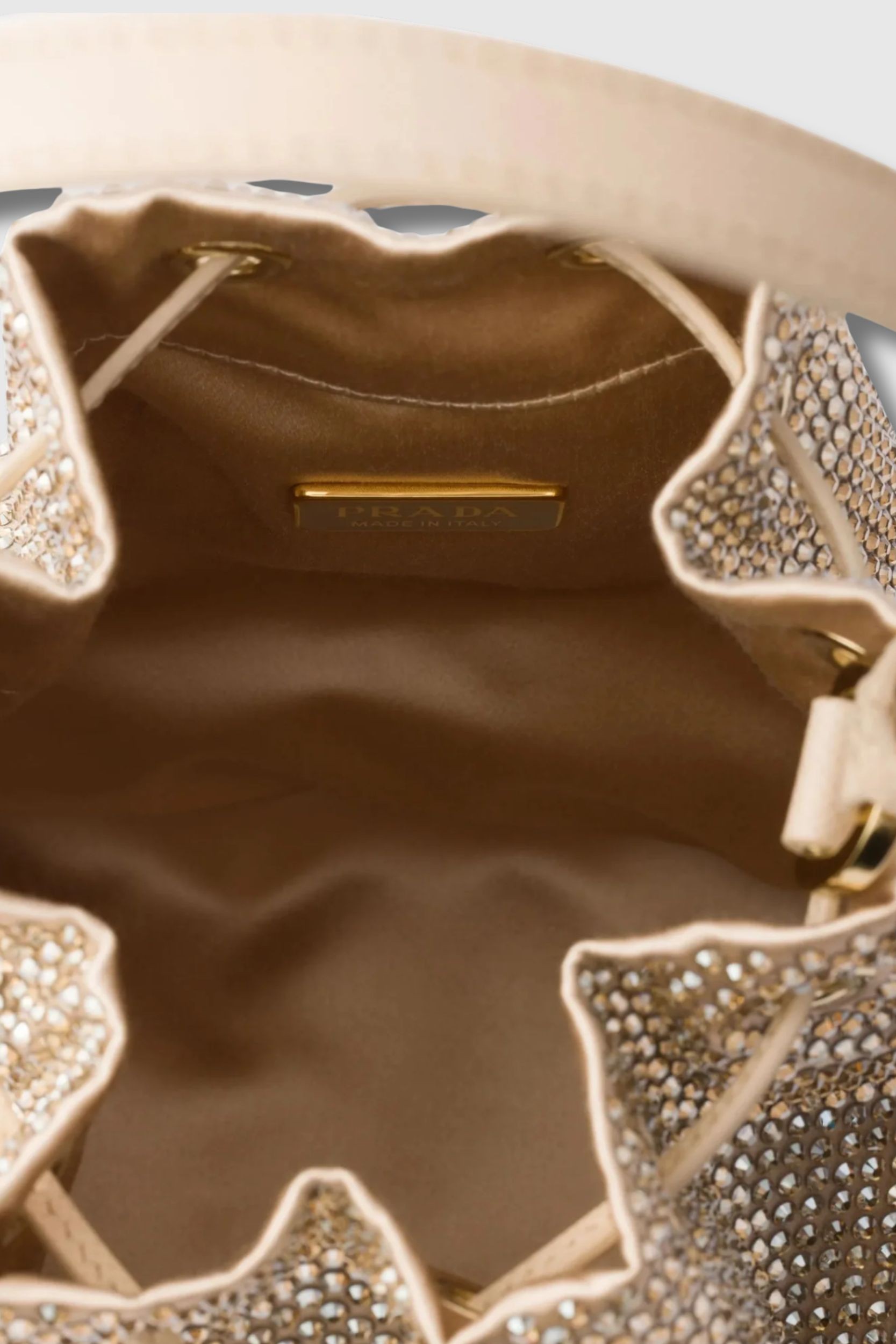 This Sabbia clutch bag by Prada captivates with its supple satin silhouette, embellished with sparkling faux crystals. Its refined design is complemented by a leather handle and removable shoulder strap, offering a modern and feminine look. The tone-on-tone enamelled metal triangle logo marks this exceptional accessory.