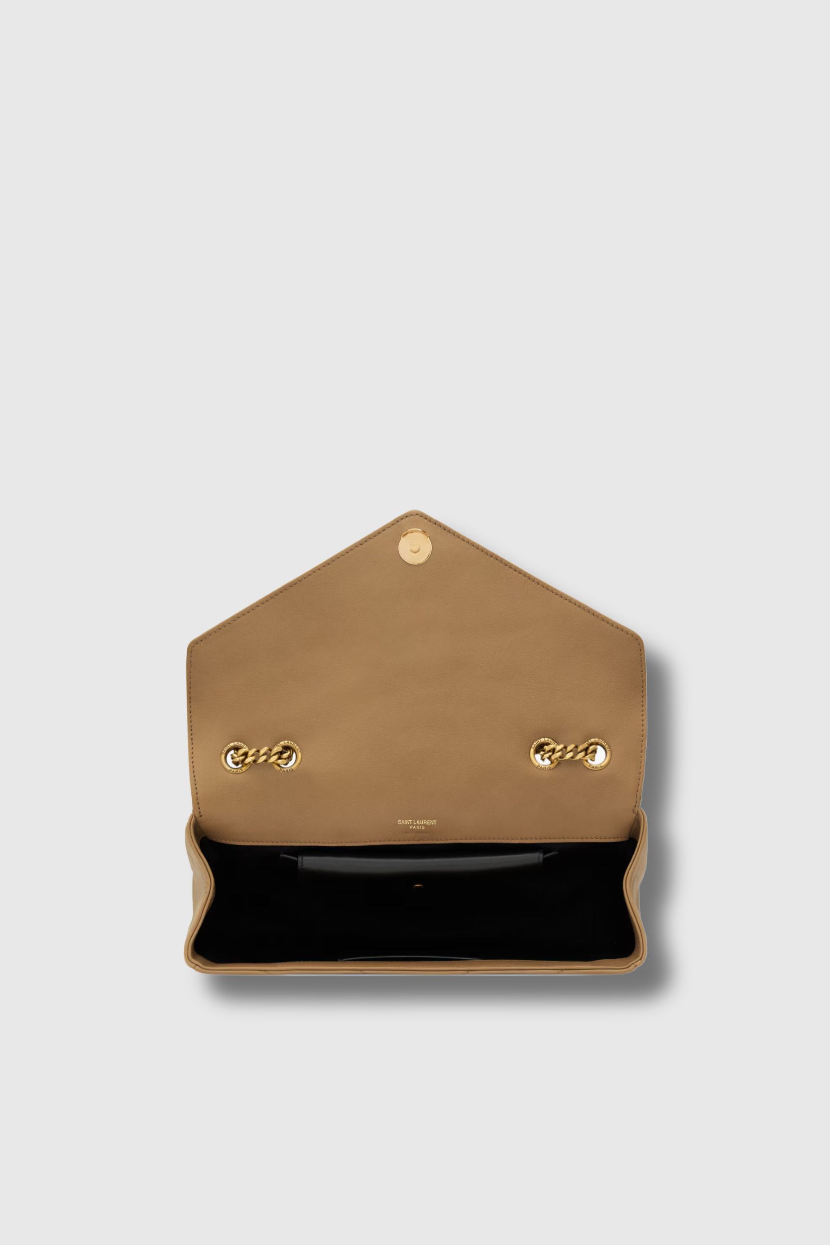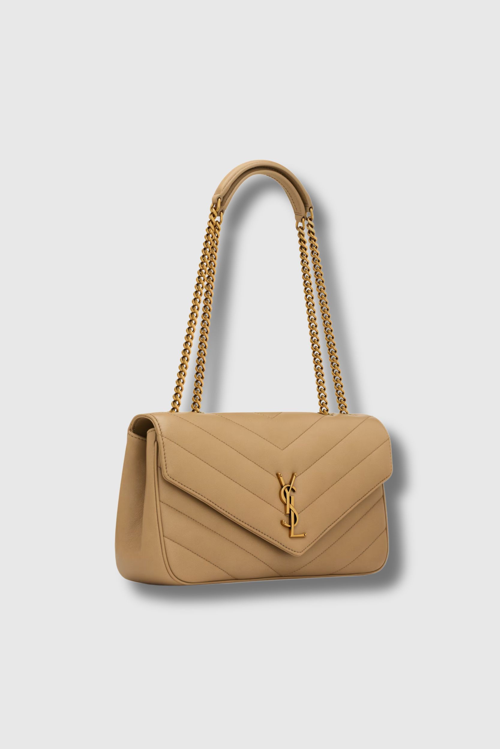 This medium-sized Loulou bag in beige leather by Saint Laurent embodies the iconic elegance of the House. Crafted from quilted lambskin leather with a chevron pattern, it stands out for its refined silhouette and timeless appeal. Its sliding chain allows it to be worn over the shoulder or across the body. It comes with a removable leather pouch and a pocket mirror, combining style and functionality.