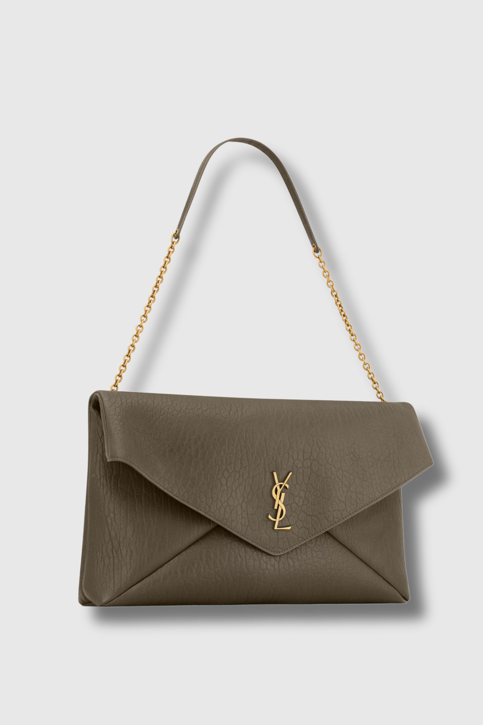 This Cassandre XXL bag in khaki lambskin leather designed by Saint Laurent is a generously sized chain clutch bag that combines modernity and elegance. Crafted from supple lambskin leather and adorned with the iconic Cassandre logo, it captivates with its refined and versatile silhouette. Its chain link allows it to be worn over the shoulder or carried by hand, depending on your mood.