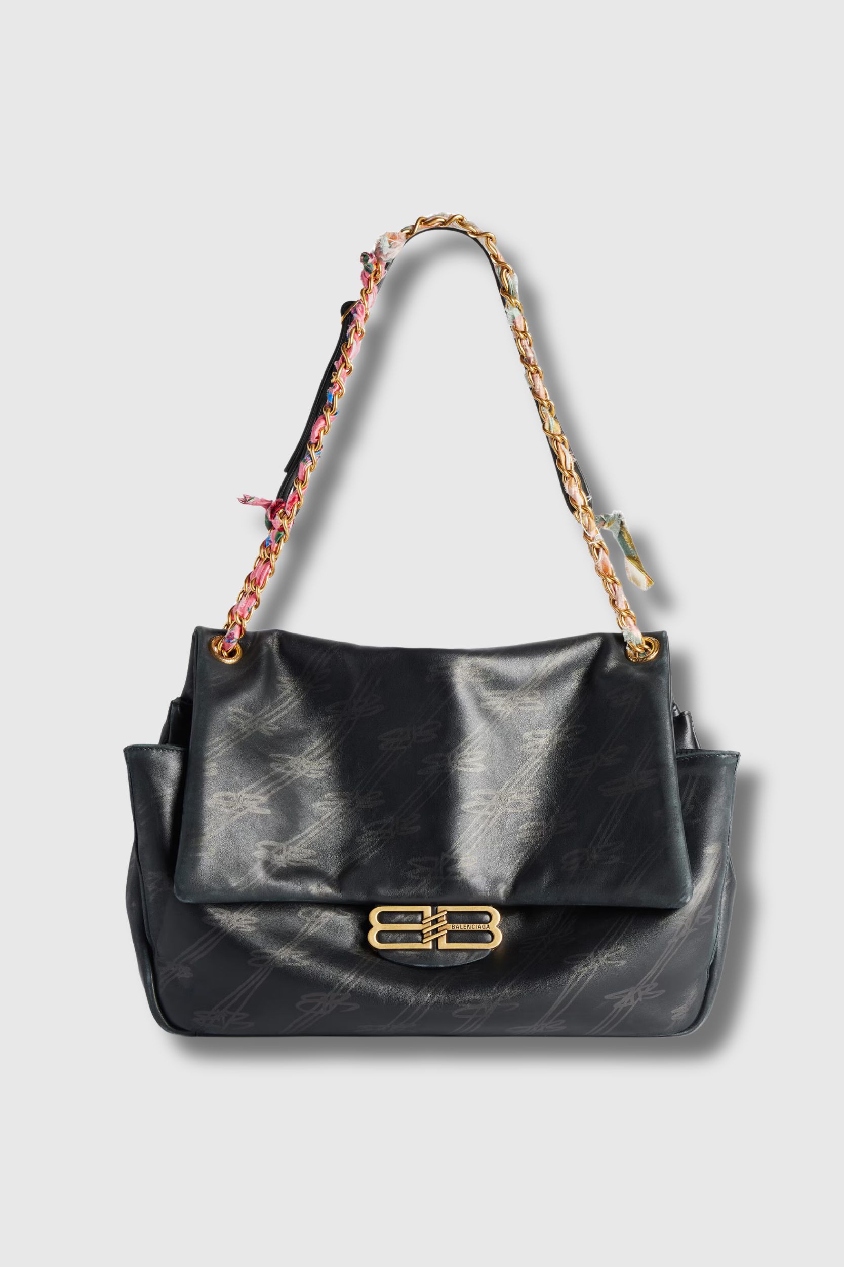 Crafted from supple calf leather with a BB monogram print, it features a sliding chain shoulder strap embellished with ribbon, allowing it to be worn on the shoulder or across the body. Its curved flap adorned with the iconic BB logo in aged gold metal opens with a studded magnetic clasp.