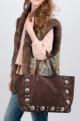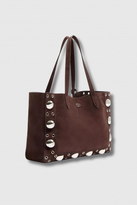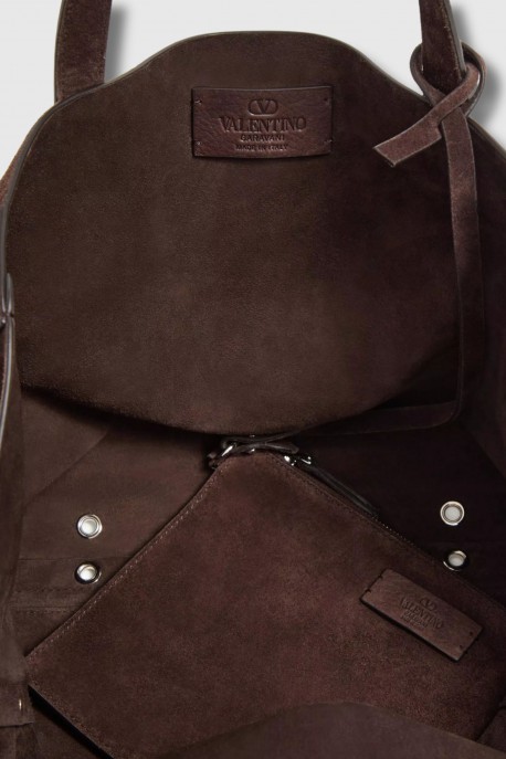 The Antibes bag in camel suede is designed by Valentino Garavani. This Nellcôte suede tote bag stands out with its edging adorned with ball studs and iconic rivets. It can be carried by hand or on the shoulder thanks to its handles. It features a small VLogo Signature metal ornament, a removable inner pocket and palladium-finish metal hardware.