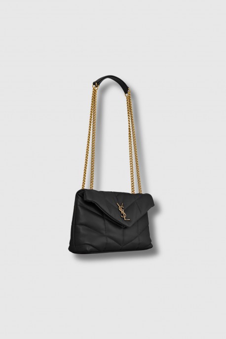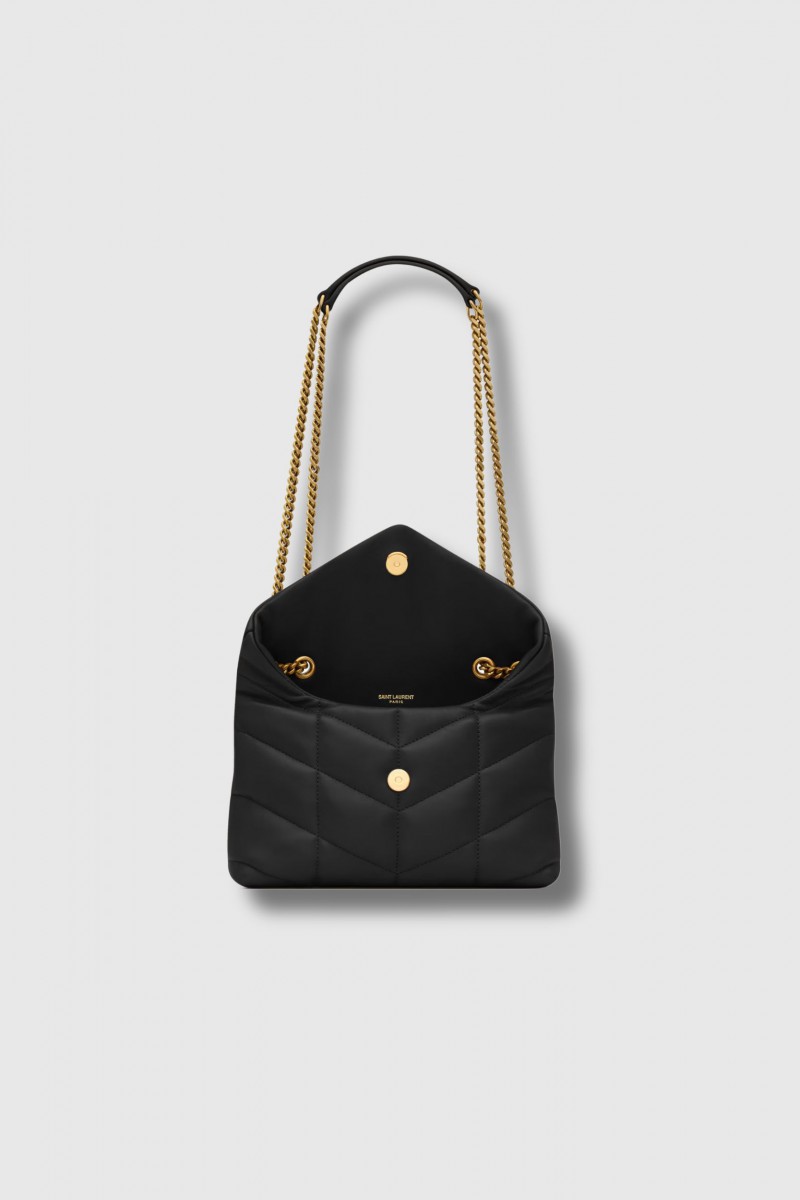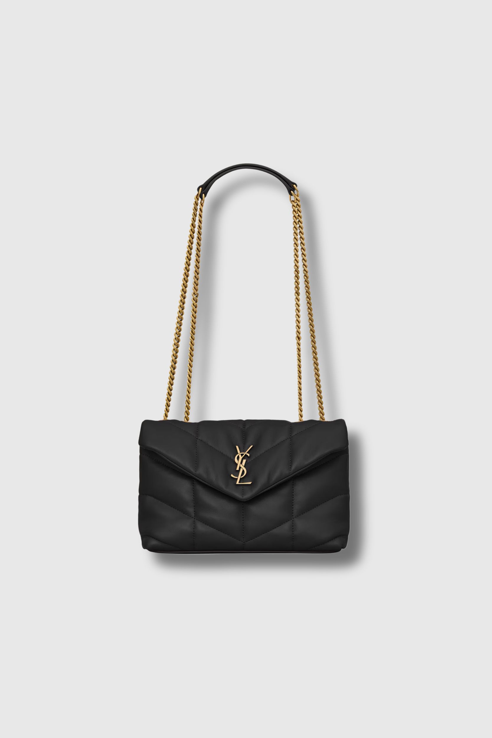 This Saint Laurent Puffer mini Toy bag reinterprets the iconic Loulou Puffer in an irresistible mini format. Crafted from quilted nappa lambskin leather with a soft herringbone pattern, it captivates with its modern yet refined look. Its sliding chain allows it to be worn over the shoulder or across the body, depending on your mood. The interior is lined with grosgrain and features a zipped pocket and two card slots. Light bronze brass hardware and a magnetic clasp complete this compact, elegant and functional design.