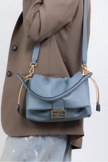 This medium sky blue Mamma Baguette bag by Fendi is a modern reinterpretation of one of the House's iconic designs from the late 1990s. Presented in a soft, deconstructed version for the Spring-Summer 2025 show, it retains its signature underarm carry while gaining fluidity. Crafted in mercury blue nappa leather, it is enhanced with an FF clasp and tone-on-tone finishes. Its spacious interior, lined with suede, closes with a drawstring, while the magnetic flap and gold-tone trim add a refined touch. With its removable handle and shoulder strap, it can be carried elegantly on the shoulder or across the body.