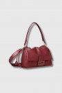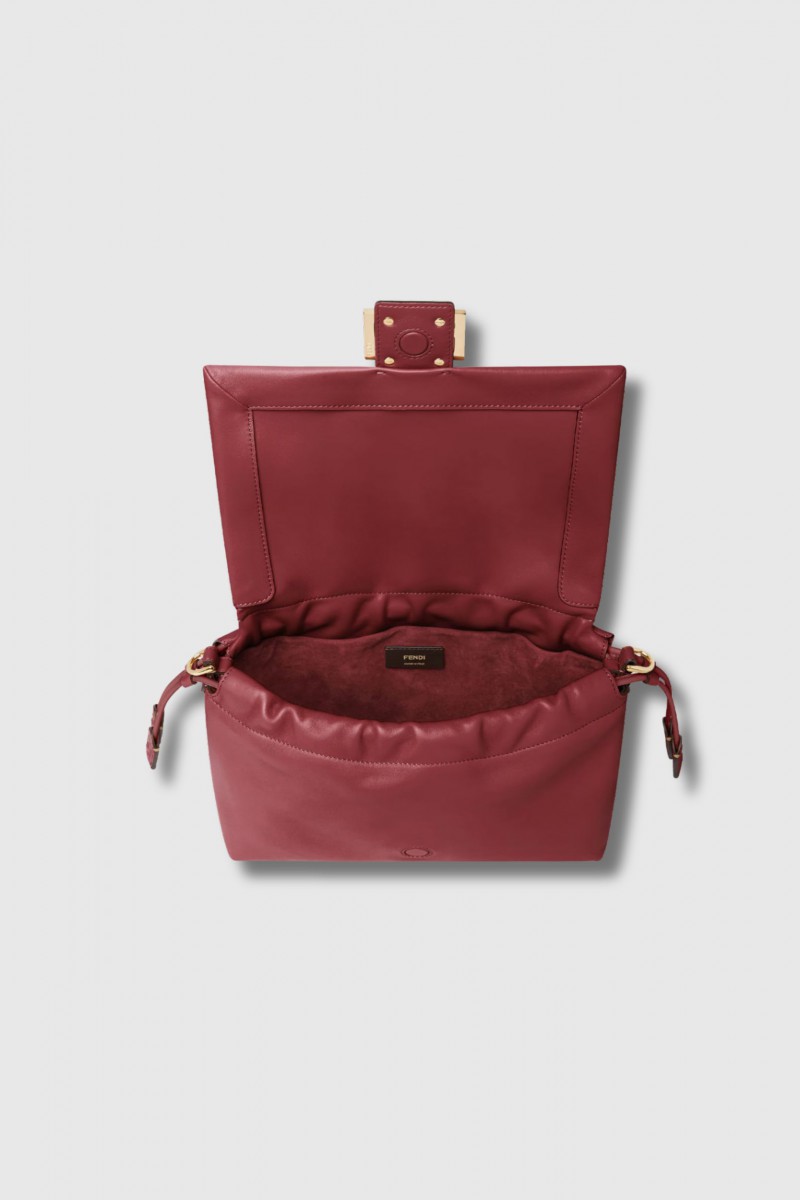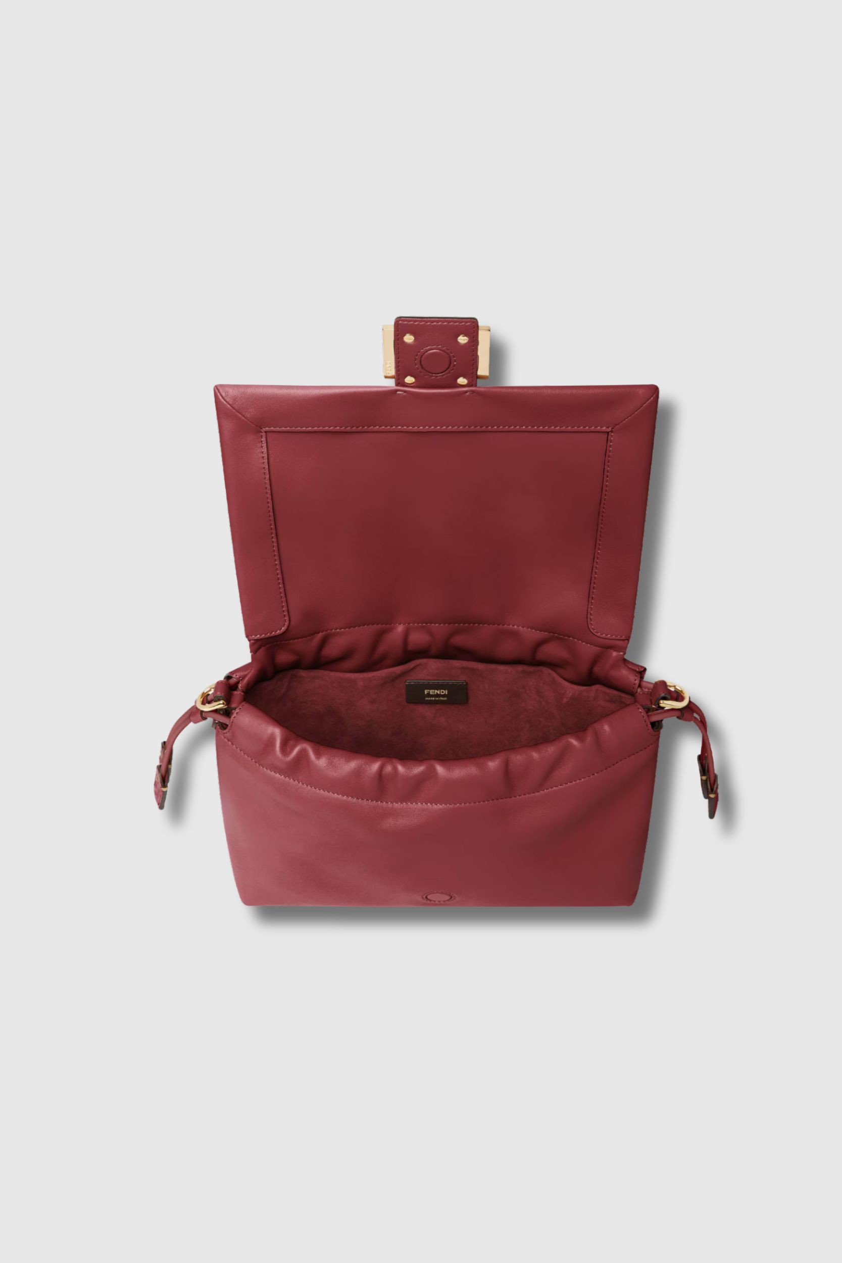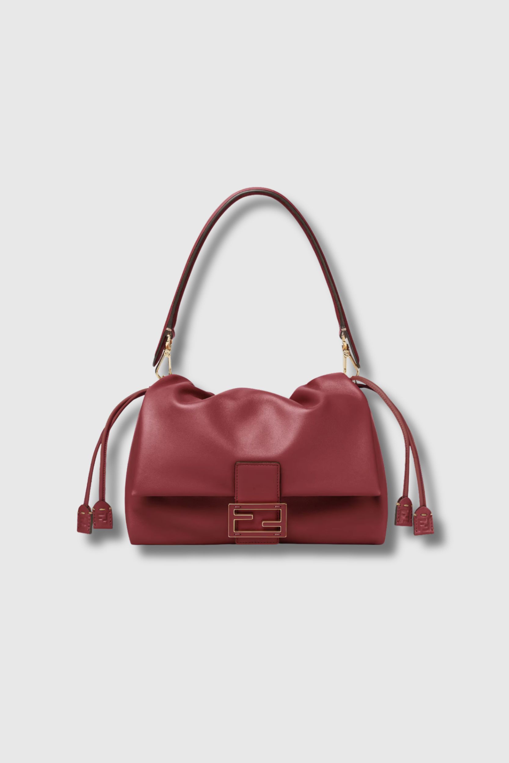 This medium burgundy Mamma Baguette bag by Fendi embodies the iconic heritage of the House in a contemporary and relaxed version, unveiled during the Spring-Summer 2025 fashion show. Created in the late 1990s as a more generous version of the Baguette bag, it retains its iconic underarm carry while adopting a more fluid look. Crafted from supple burgundy nappa leather, it is enhanced by the FF clasp and tone-on-tone finishes. Its spacious interior, lined with suede, closes with a drawstring, while the magnetic flap and gold-tone hardware add a touch of luxury. Thanks to its removable shoulder strap and handle, it can be carried on the shoulder or across the body with natural elegance.