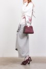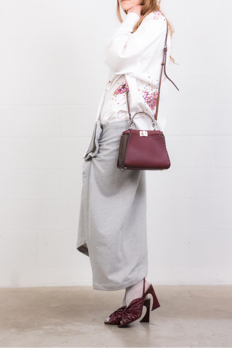 This burgundy Peekaboo mini bag by Fendi embodies the Selleria craftsmanship that has been the hallmark of the House since 1925, with its 220 large hand-stitched topstitches. Crafted from burgundy Cuoio Romano leather with brown sides, featuring a natural grain obtained through metal-free tanning, it exudes authentic elegance. Its calfskin-lined interior features two separate compartments and an interior pocket. Adorned with the iconic turnlock clasp, a silver Selleria plaque and palladium trim, it can be carried by hand, on the shoulder or across the body thanks to its stone-coloured python handle and removable shoulder strap. Compact and functional, it holds all your everyday essentials.