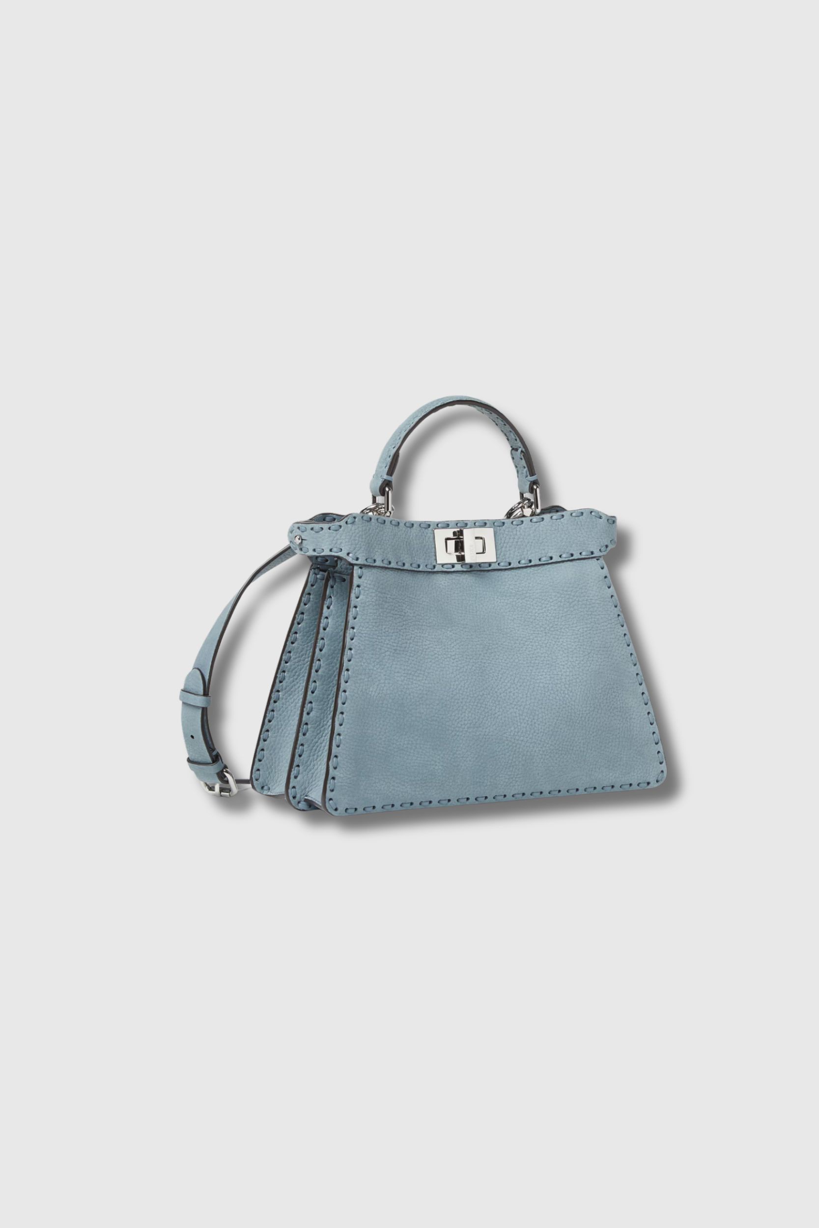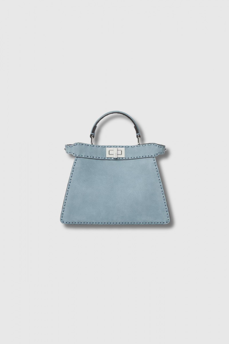 This sky blue Peekaboo ISeeU small bag by Fendi showcases the excellence of Selleria craftsmanship with its 556 hand-stitched points, a tradition upheld by the House since 1925. Crafted from light blue Cuoio Romano leather with a suede finish and a natural grain resulting from metal-free tanning, it features a tone-on-tone calfskin leather lining, organised into two separate compartments and an interior pocket. Enhanced with a silver Selleria plaque, palladium trim and the iconic turnlock clasp on both sides, it can be carried by hand, on the shoulder or across the body thanks to its handle and removable shoulder strap. Compact and functional, it easily holds all your everyday essentials.