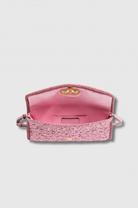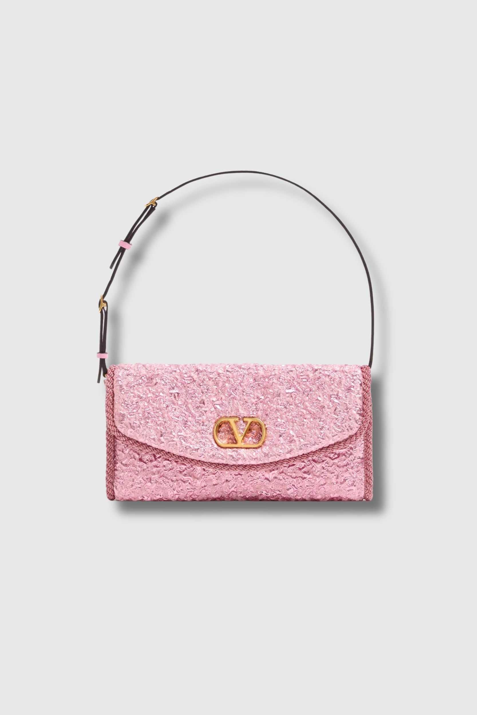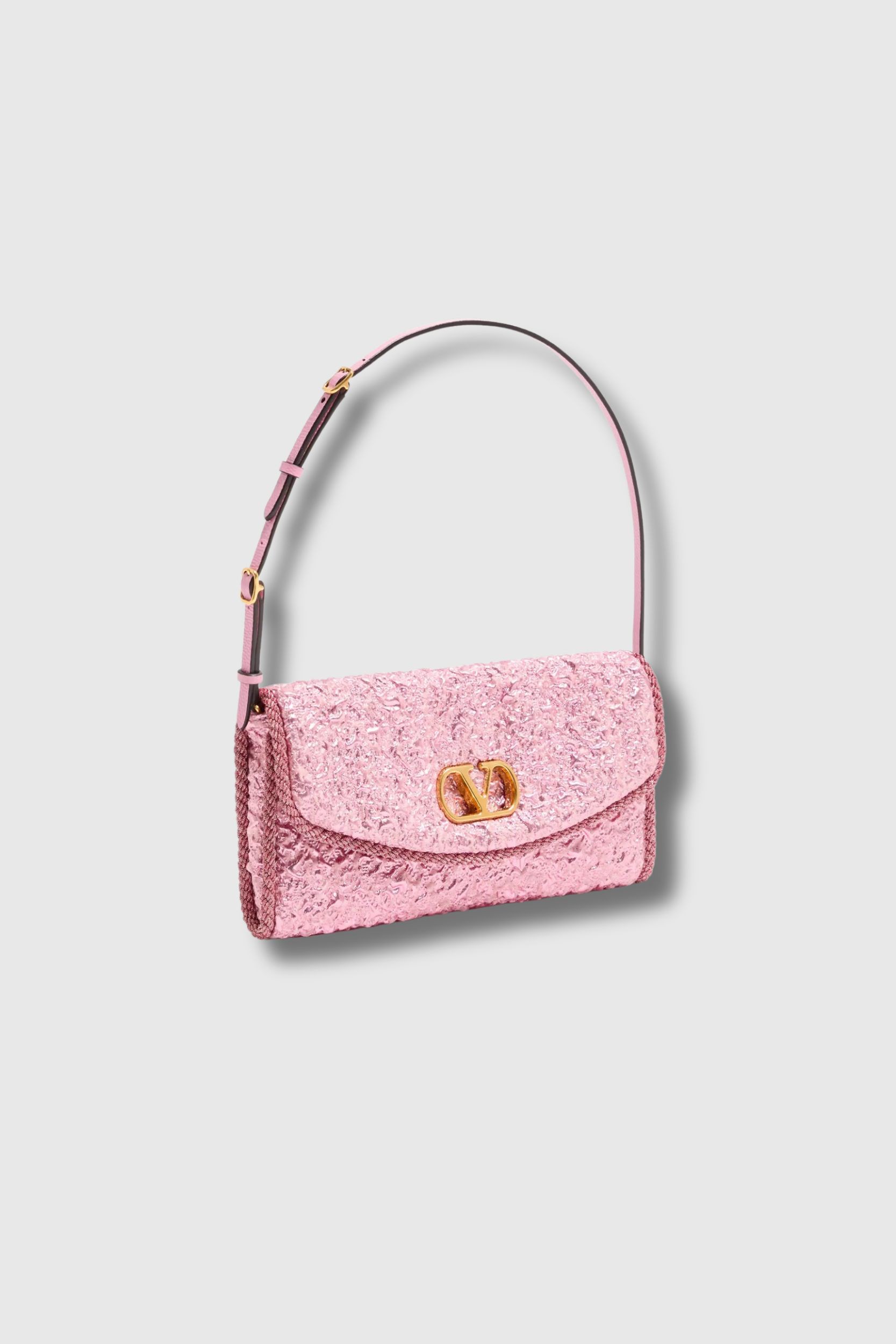 This pink Valentino Garavani handbag stands out for its refined elegance and compact size. The DeVain model is crafted from cloaked jacquard fabric and embellished with a metallic VLogo Signature ornament with an antique brass finish. Featuring an adjustable strap and grained calfskin leather details, it can be carried by hand or worn over the shoulder. Its magnetic closure ensures practicality and security, while the satin-lined interior, equipped with a flat pocket, offers neat storage for essentials.