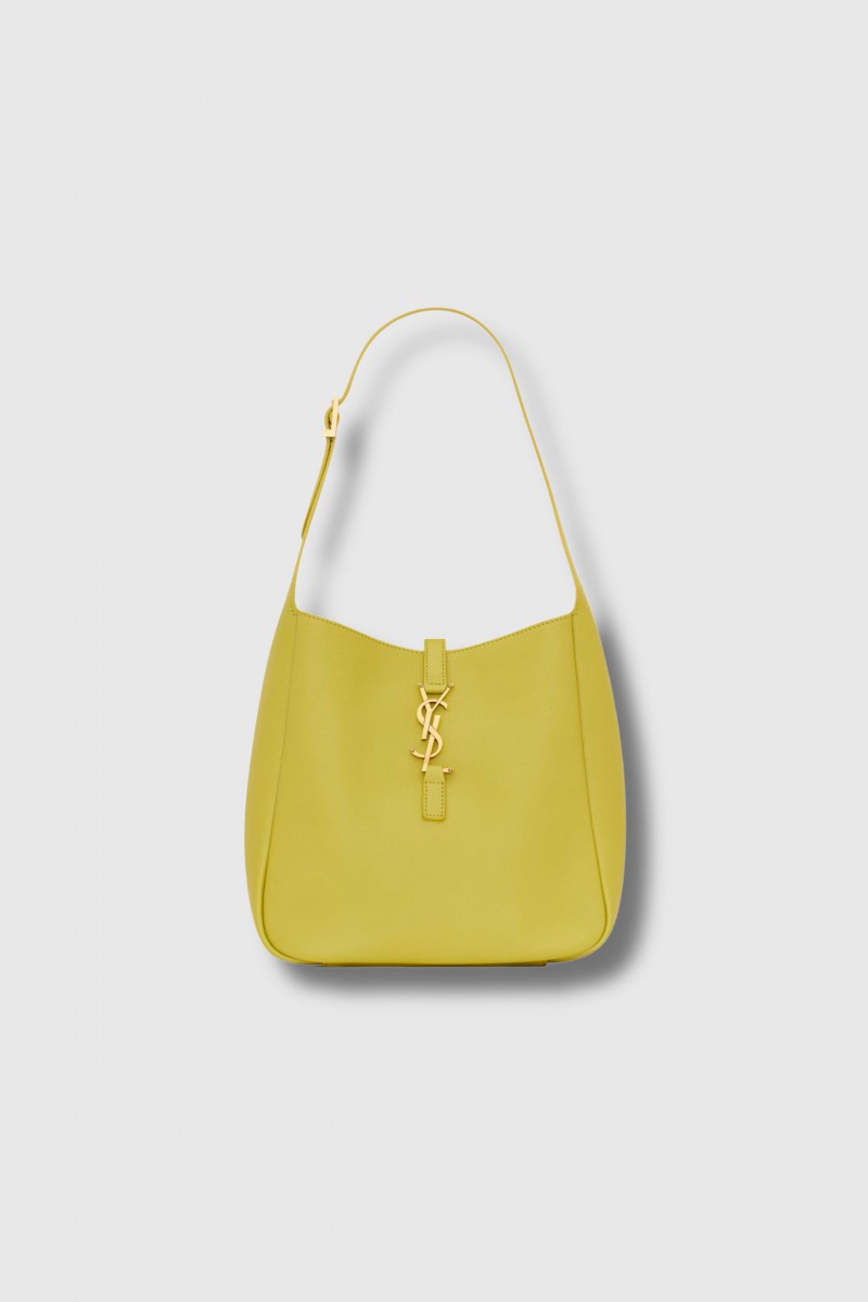 The Small 5 à 7 Bag in lemon grained leather by Saint Laurent reimagines the iconic 5 à 7 in a soft and refined version. Crafted from finely grained leather, it is suede-lined in a tone-on-tone finish, offering a luxurious and natural feel. Spacious and practical, it features a signature Cassandre leather tab and a removable zipped internal pouch. The adjustable strap allows for a customized shoulder carry. This model stands out with its suede lining, light bronze brass hardware, and timeless elegance.