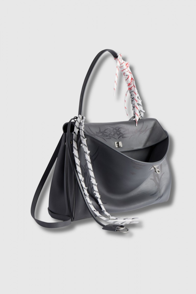 The Large Grey Tag Rodeo Bag by Balenciaga blends raw attitude with contemporary elegance. Crafted from smooth calfskin leather and polyamide, it features a worn tattoo-style artwork print for a modern patinated effect. Designed with a single handle, aged-effect laces, a removable shoulder strap, and a detachable bell key ring, it showcases aged silver-tone finishes and a turn-lock closure. Practical and refined, it offers a large front pocket, main compartment, zipped interior pocket, and two flat back pockets, with nappa lambskin lining.