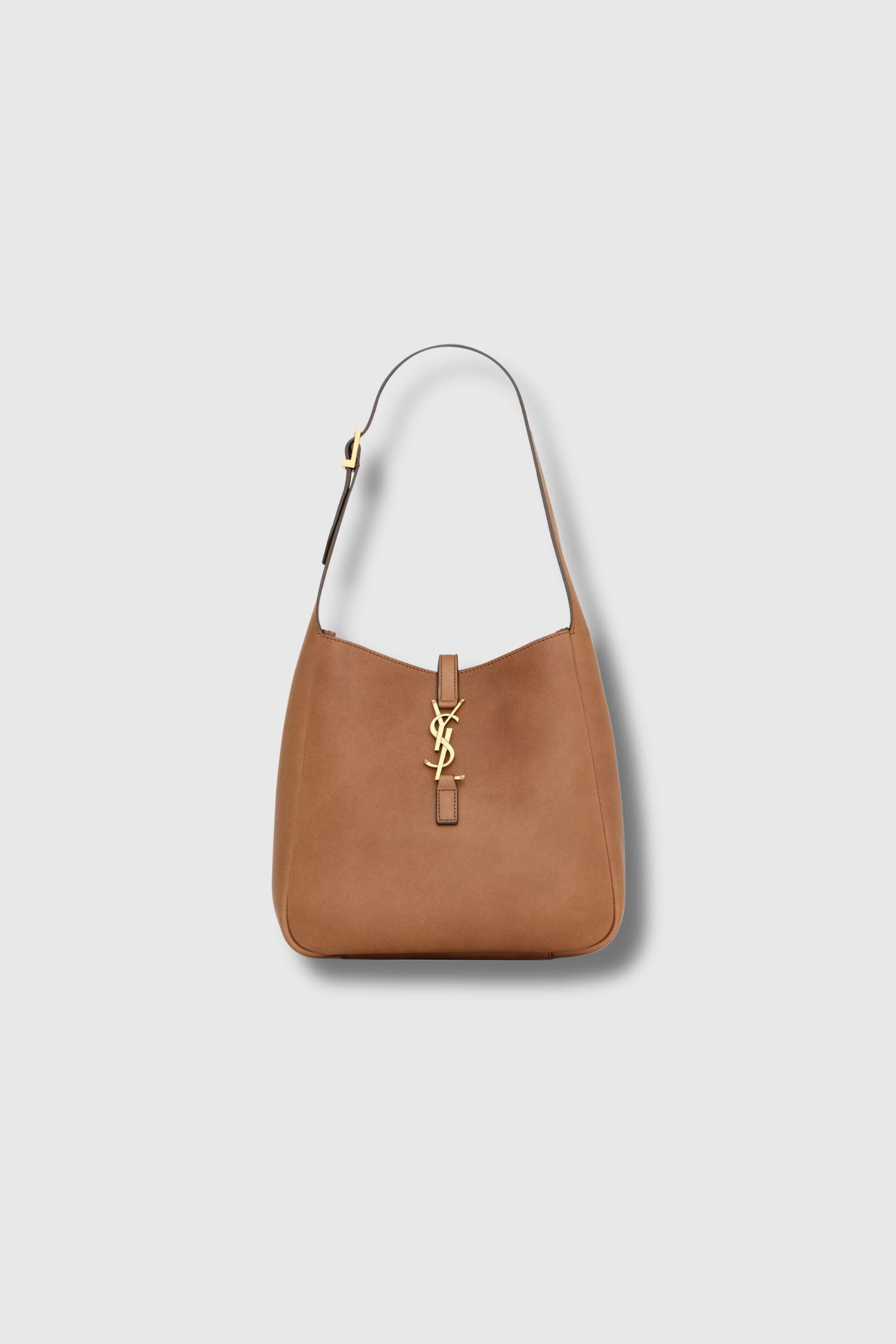 This Le 5 à 7 small camel leather bag is by Saint Laurent. A soft version of the iconic design, it stands out with its spacious and elegant silhouette. It features a leather tab adorned with the Cassandre logo and a removable zipped inner pouch. The adjustable handle allows for a customized shoulder carry. The bag is finished with a suede lining and light bronze-tone hardware.
