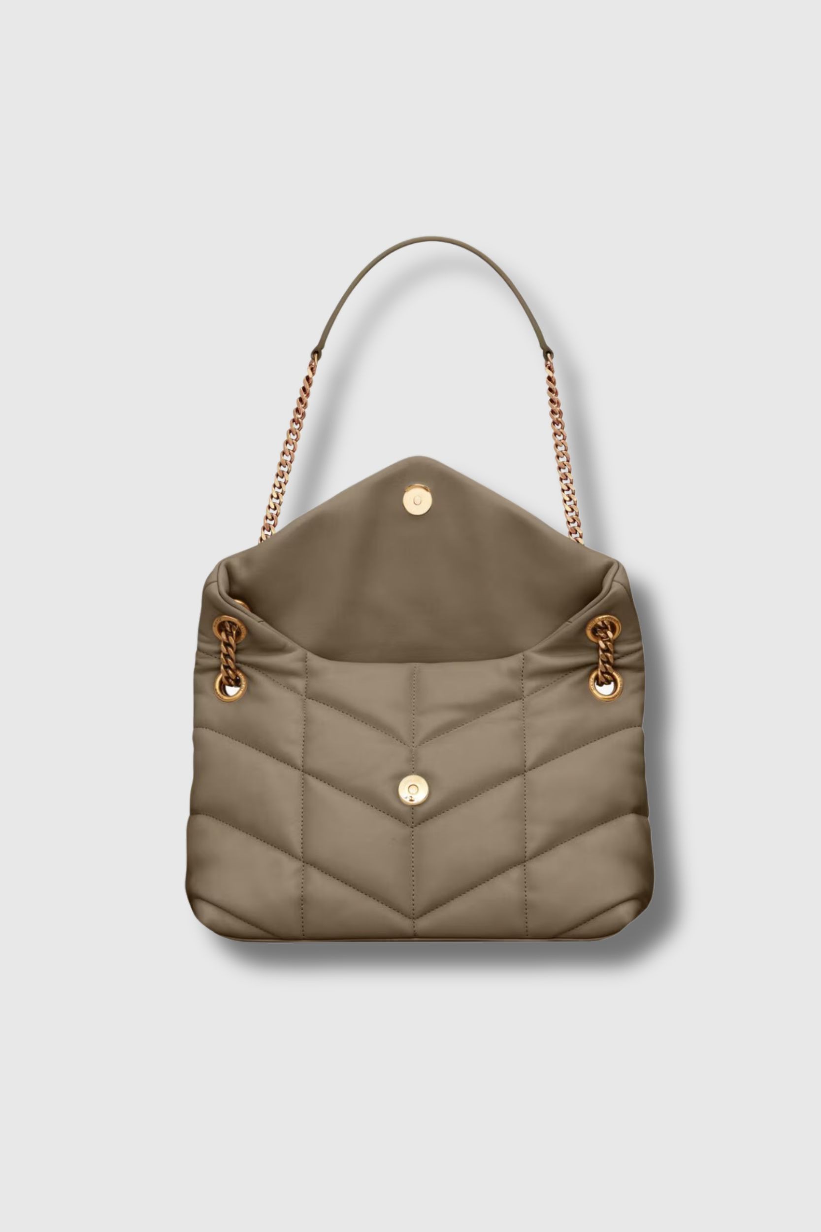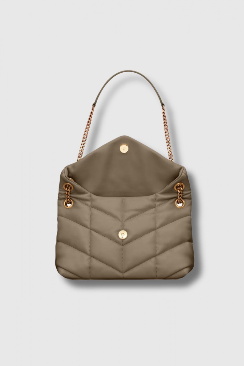 The Loulou Puffer small taupe leather bag by Saint Laurent reimagines the iconic Loulou in a puffer version crafted from supple chevron-quilted lambskin. Elegant yet modern, it features a sliding chain strap for shoulder or crossbody wear. The cotton-lined interior includes a zipped pocket, while the magnetic closure and light bronze-tone hardware complete the refined and timeless design.