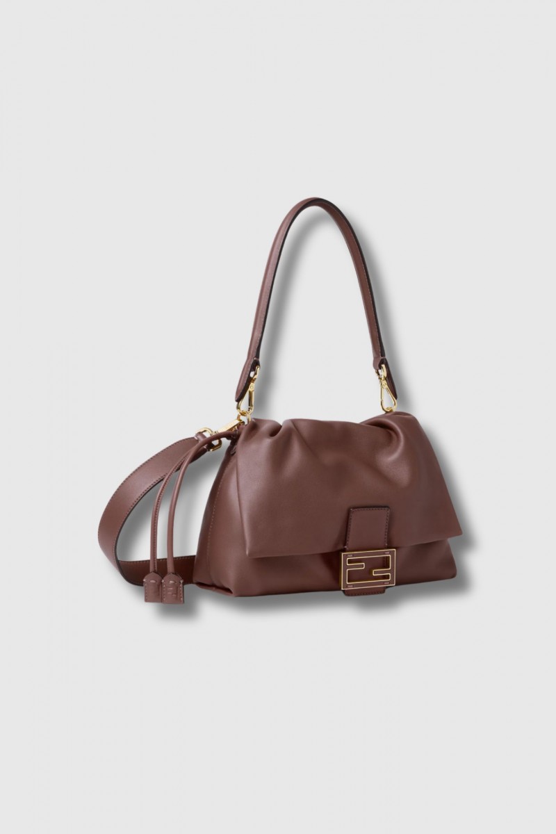 This Mamma Baguette medium bag in brown nappa leather is by Fendi. An iconic model from the late 1990s, it is reimagined in a soft, deconstructed version while retaining its signature under-the-arm silhouette. Crafted from soft mahogany nappa leather, it features the FF clasp with tone-on-tone details. Its spacious suede-lined interior, secured with a leather drawstring, blends practicality with refinement. Finished with a front flap and magnetic closure, gold-tone hardware, and removable handle and shoulder strap, it can be worn crossbody or on the shoulder.