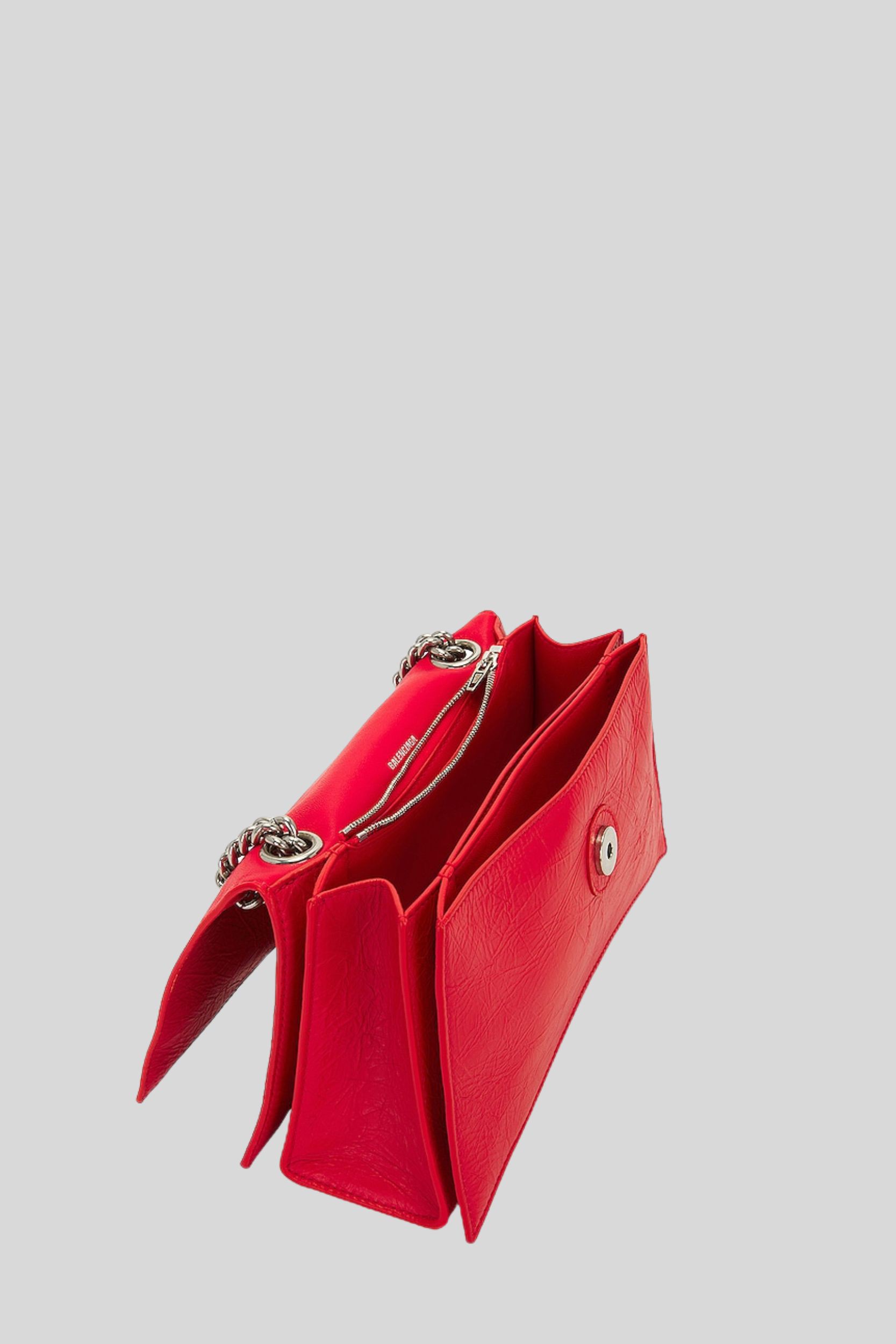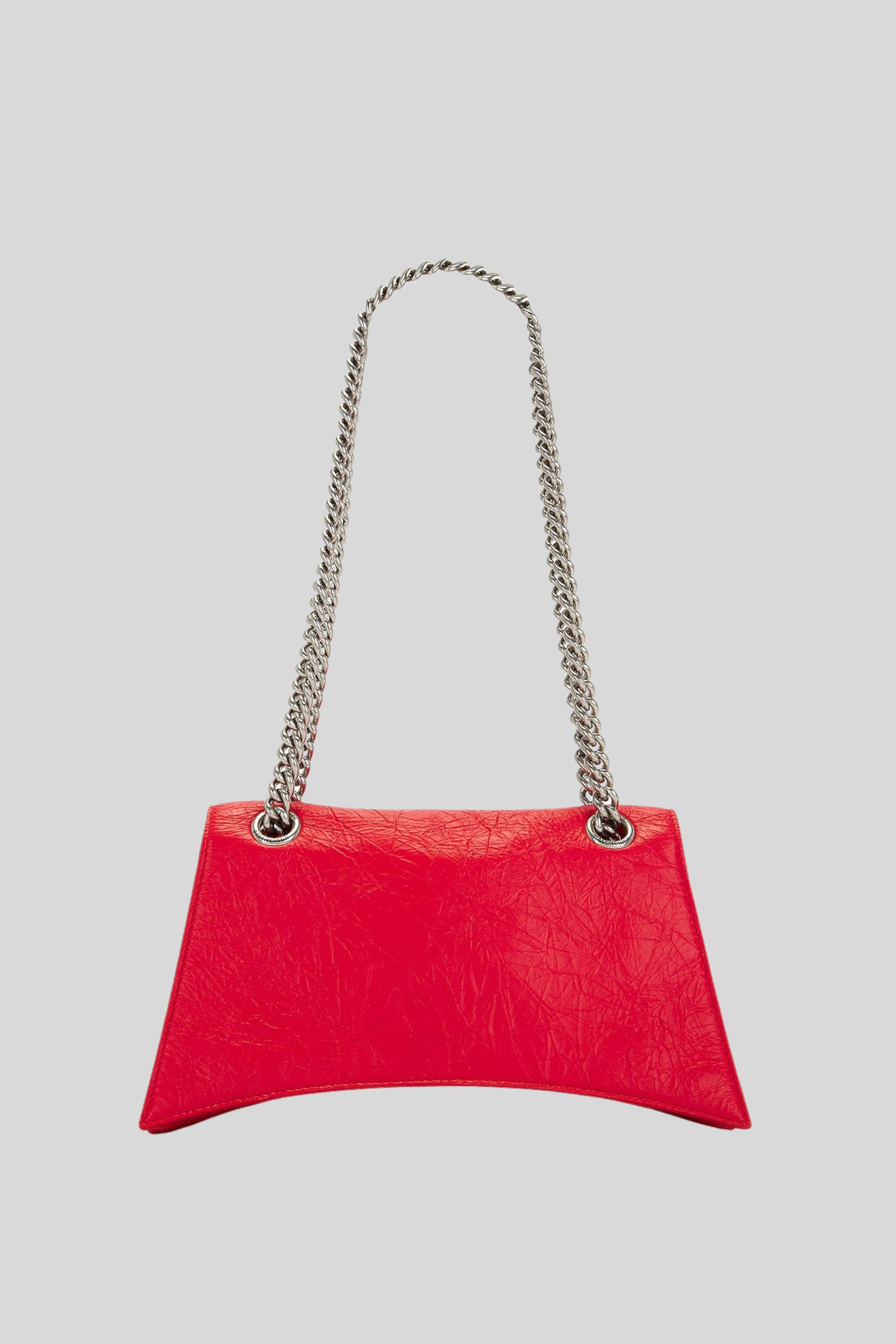 This red leather 'Crush' bag is designed by Balenciaga. It features a crumpled effect, a signature B logo plaque and silver-tone metal finishes. It is worn on the shoulder and has a magnetic closure.