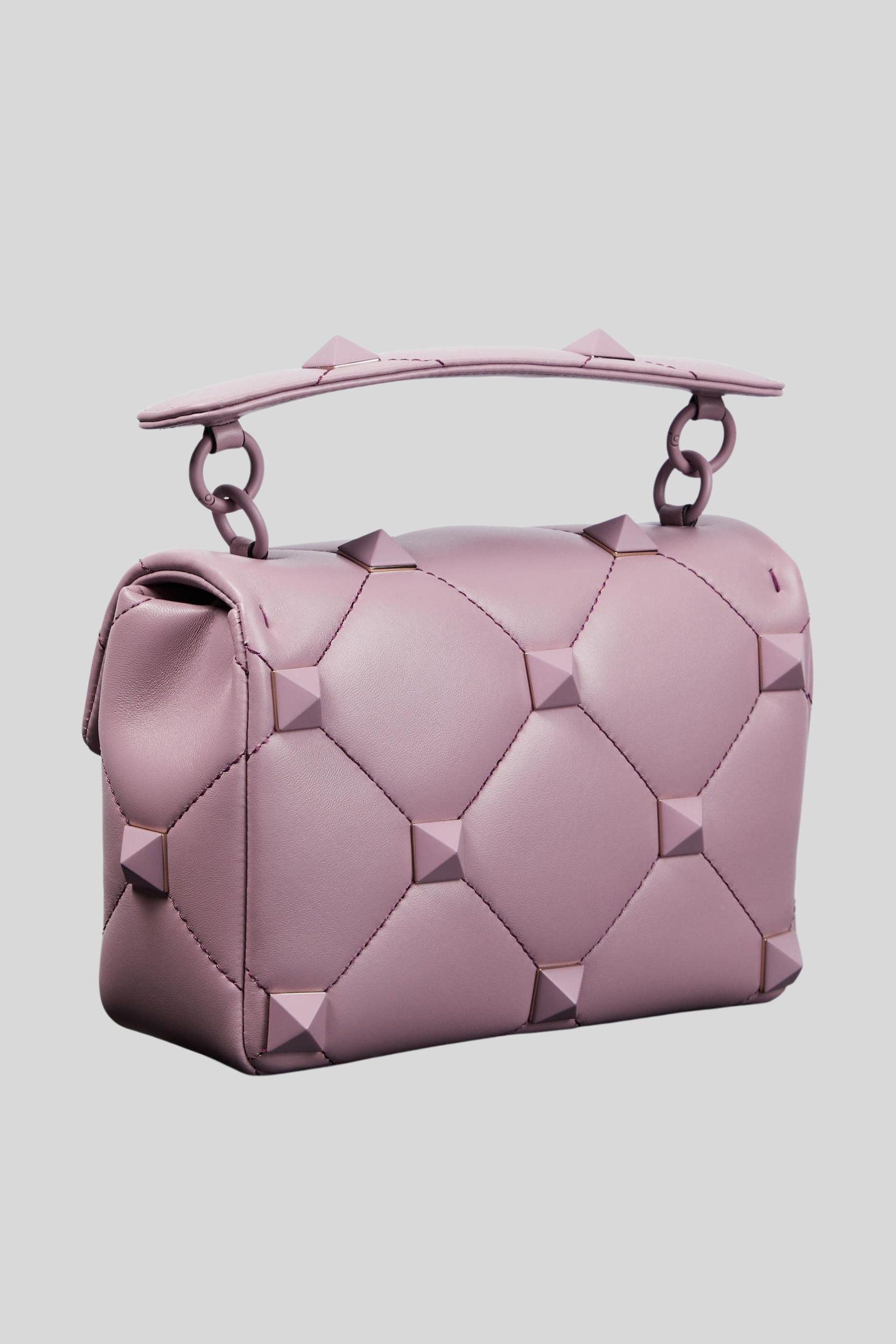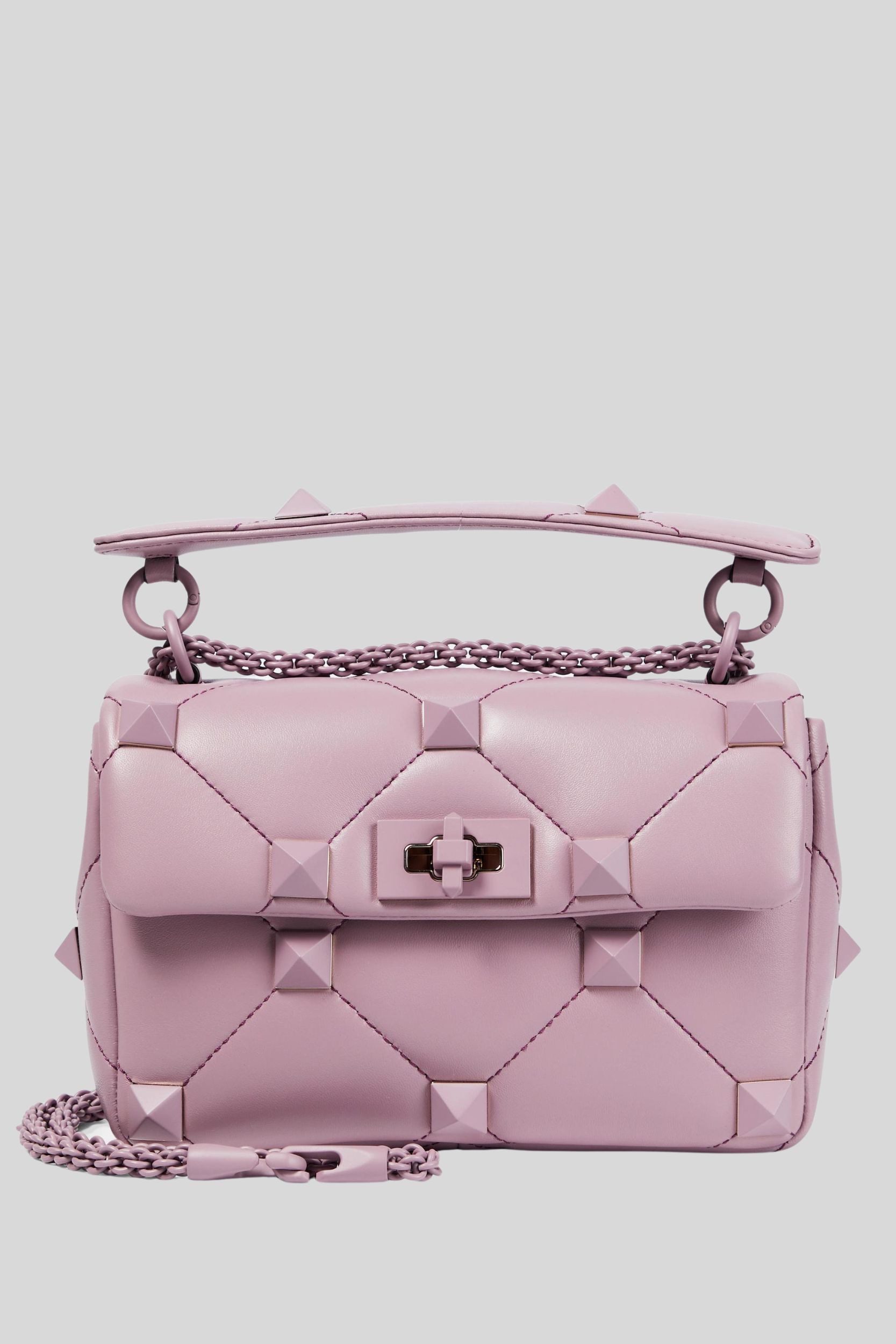 This Roman Stud Medium bag in pink lambskin is by Valentino Garavani. It is equipped with a chain and maxi studs "Studs" tone on tone.
