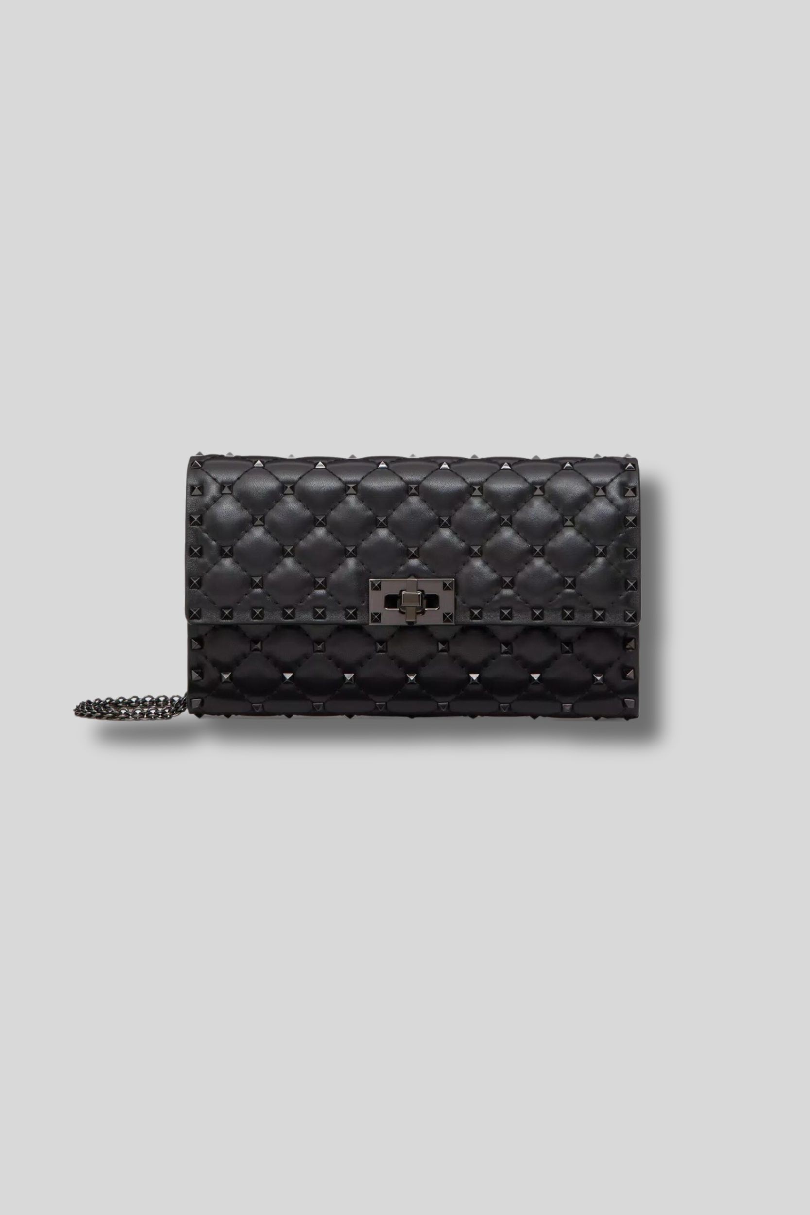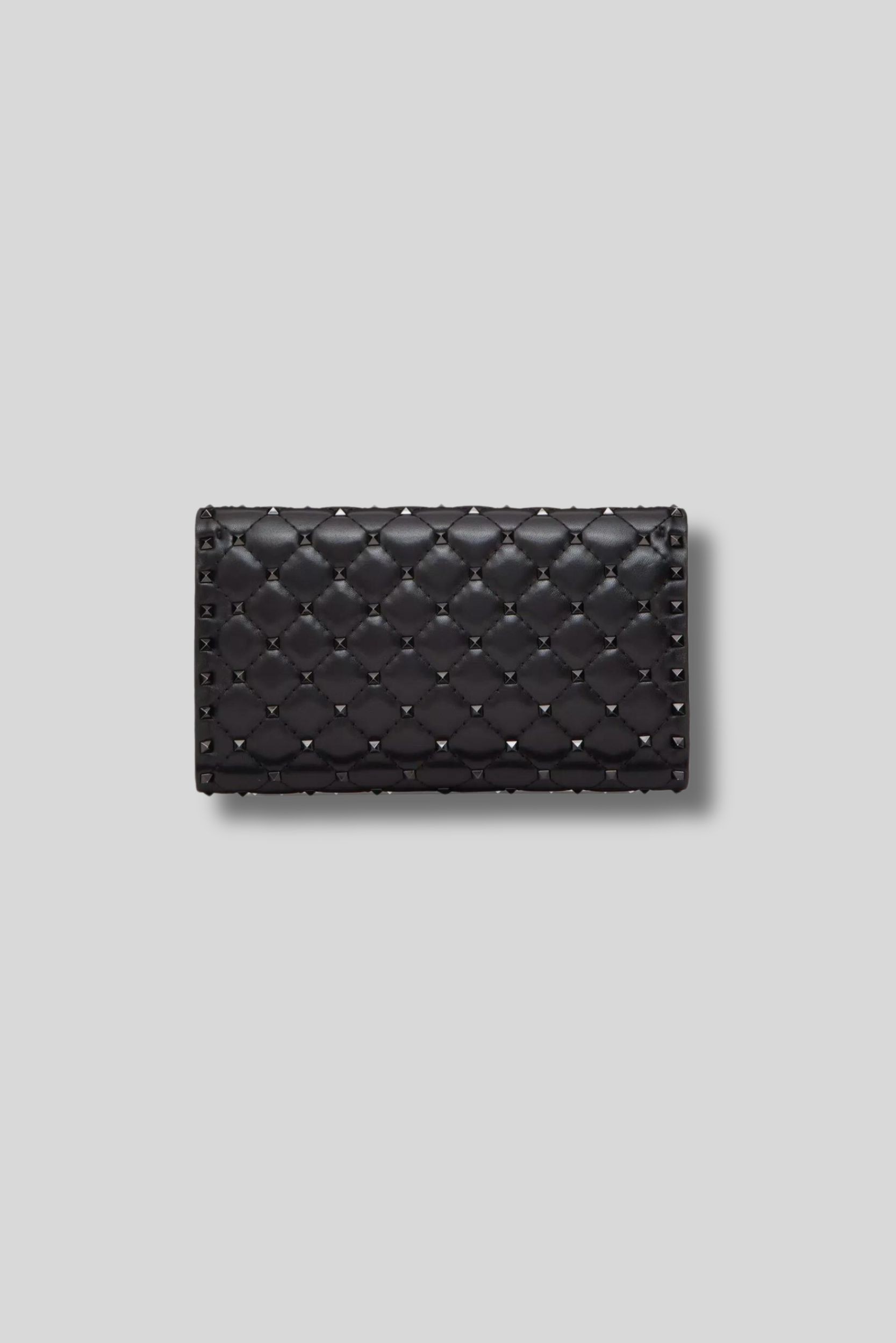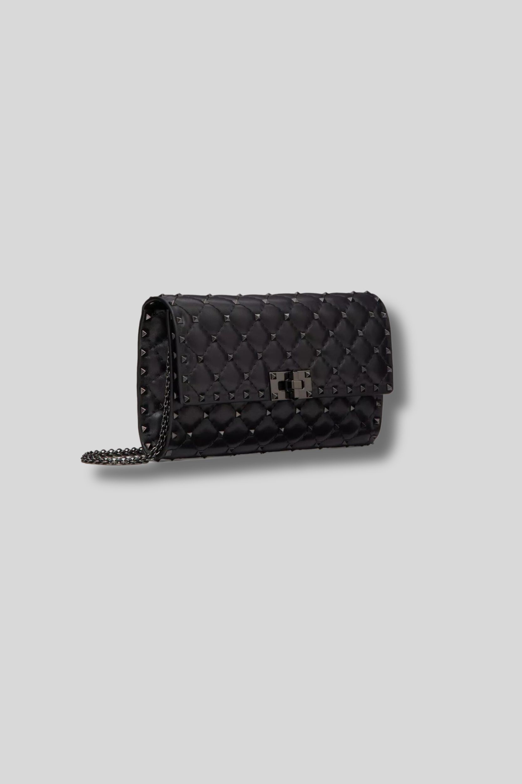 This Rockstud Spike clutch bag in black nappa leather is signed Valentino Garavani. It features a quilted construction adorned with small tone-on-tone studs. This clutch has a removable chain allowing this accessory to be worn across the body, on the shoulder, or in the hand.