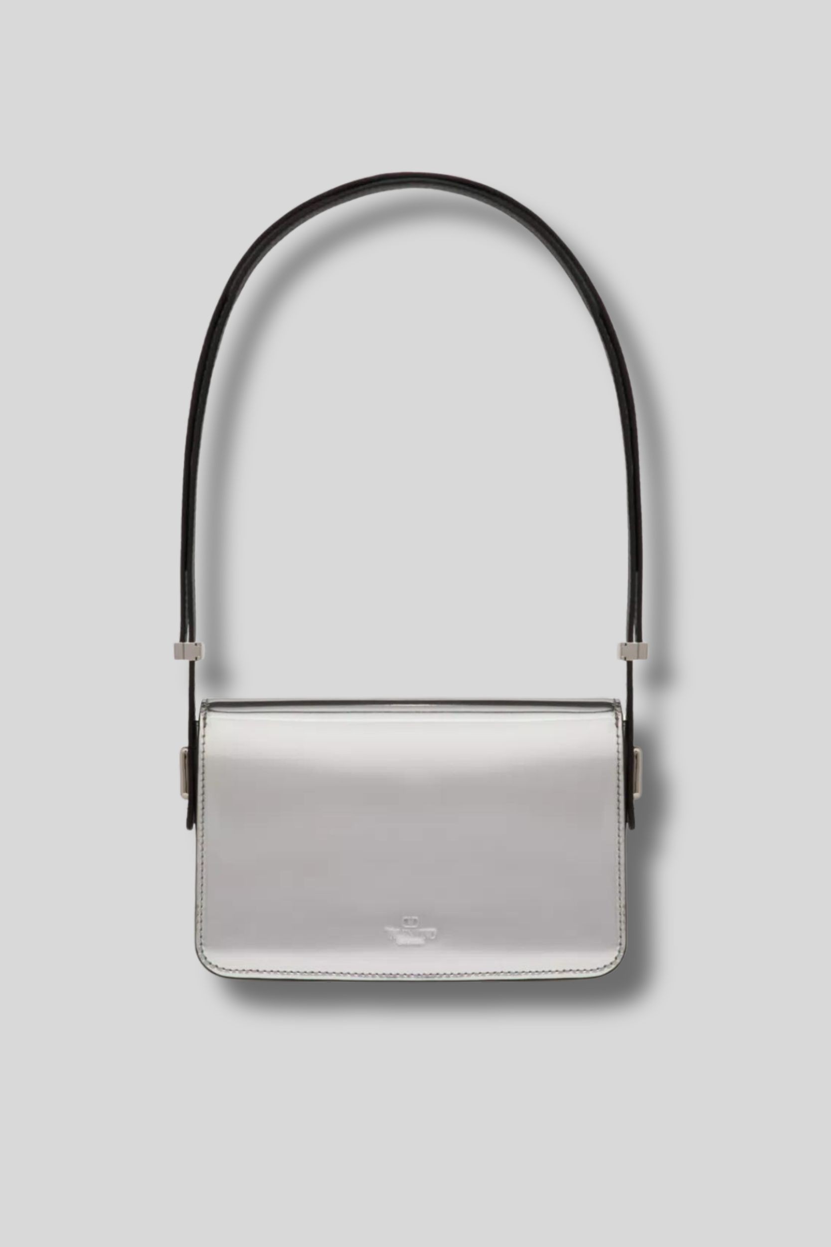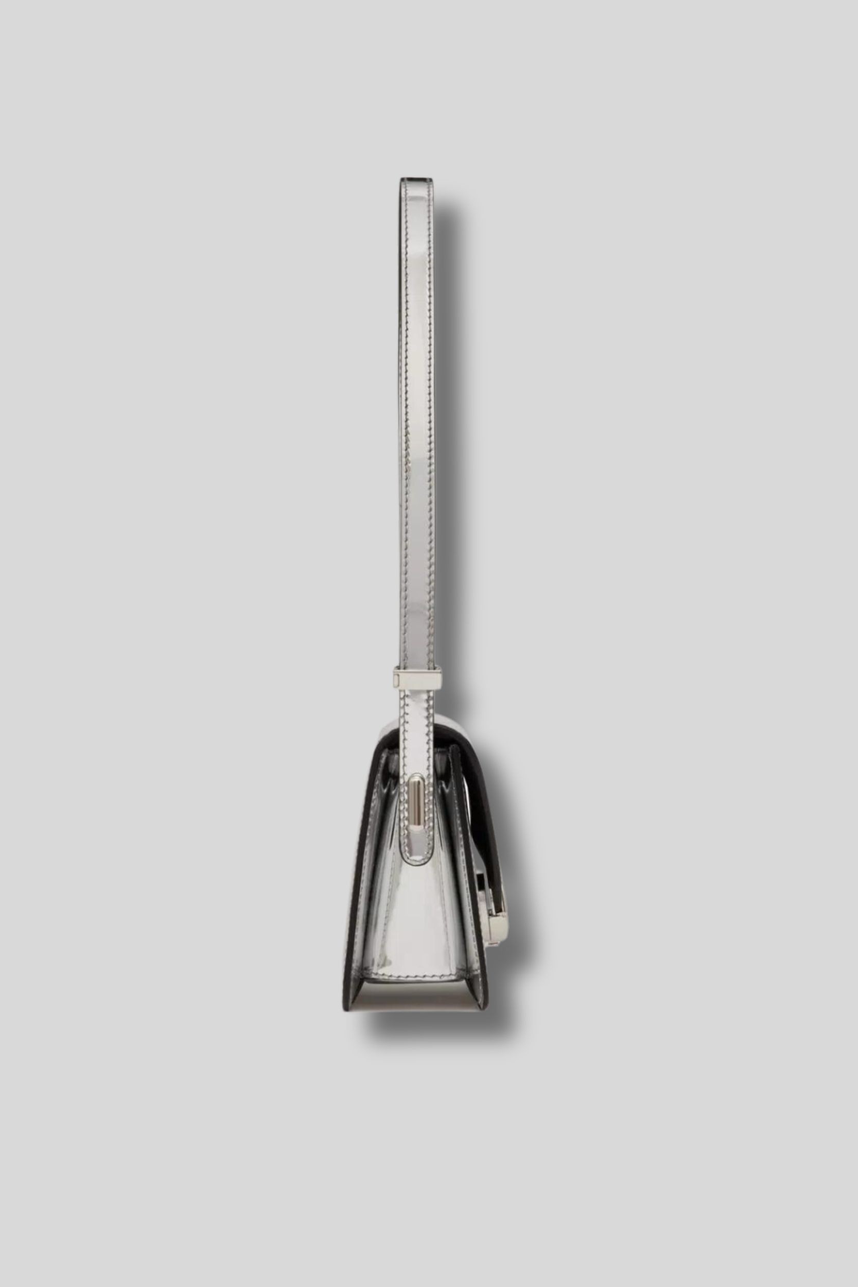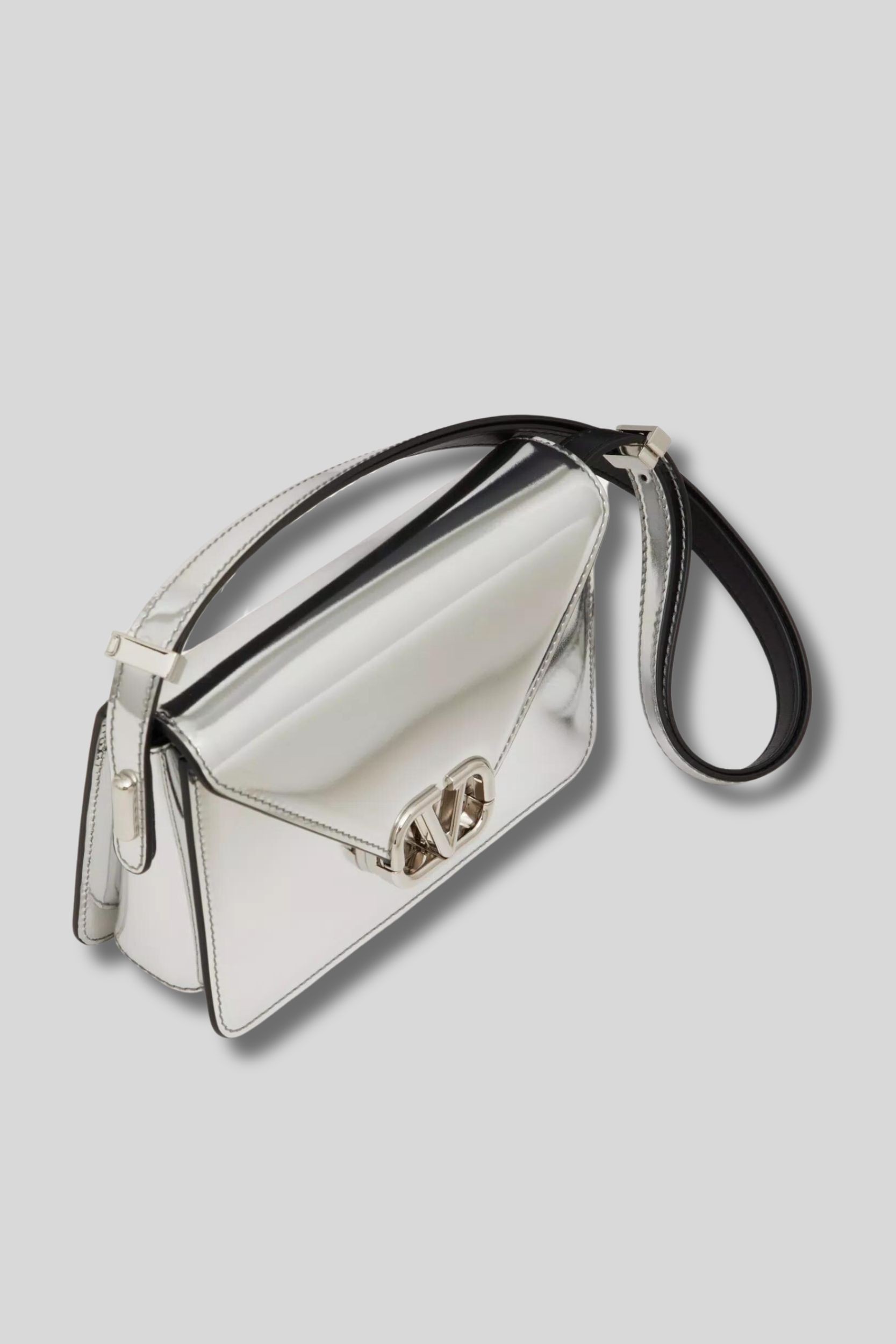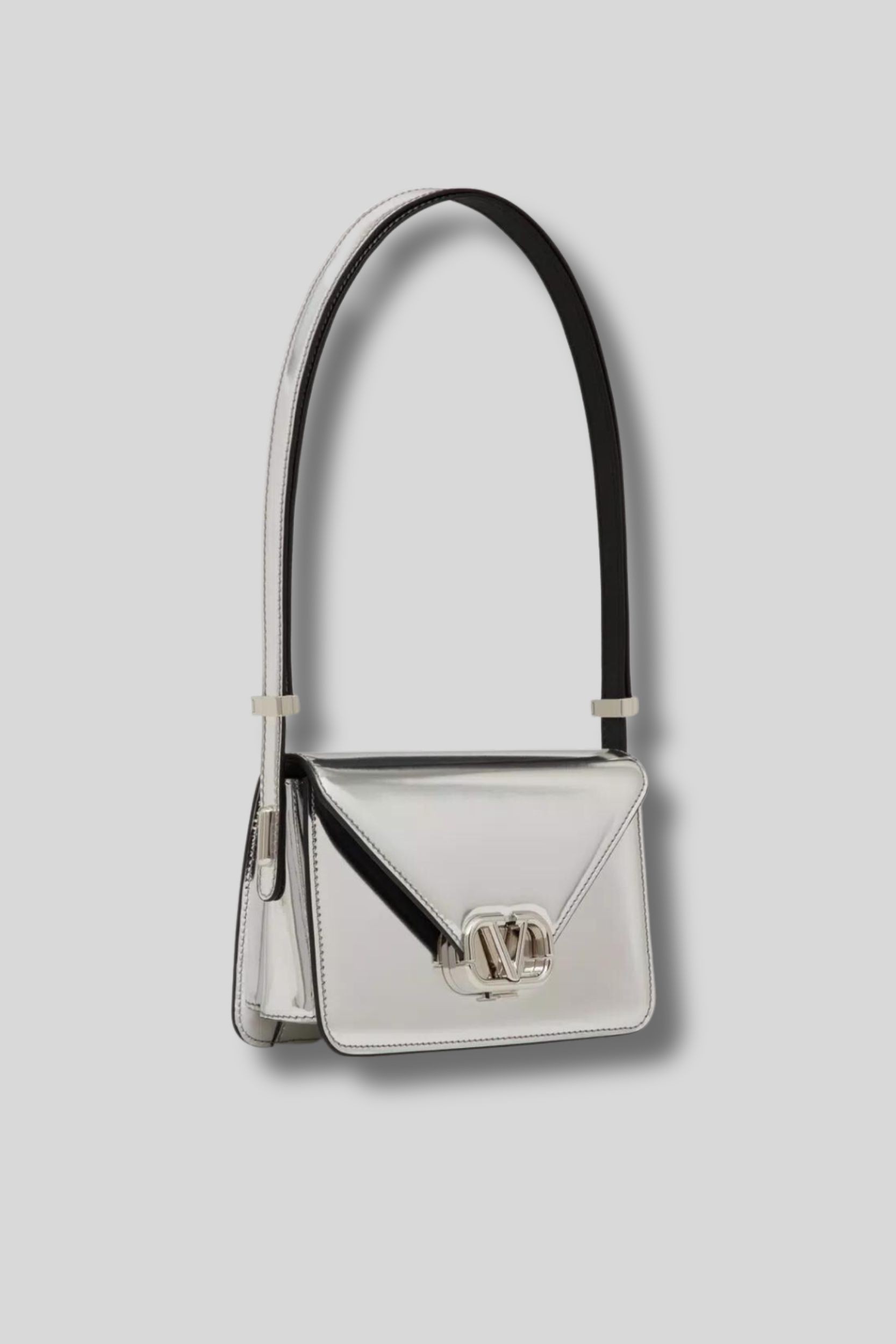 This small silver leather bag is designed by Valentino Garavani. It features an envelope design and is made of mirror-effect calfskin with a Vlogo clasp, signature of the Italian Maison. This bag has an adjustable strap allowing it to be worn on the shoulder or across the body.