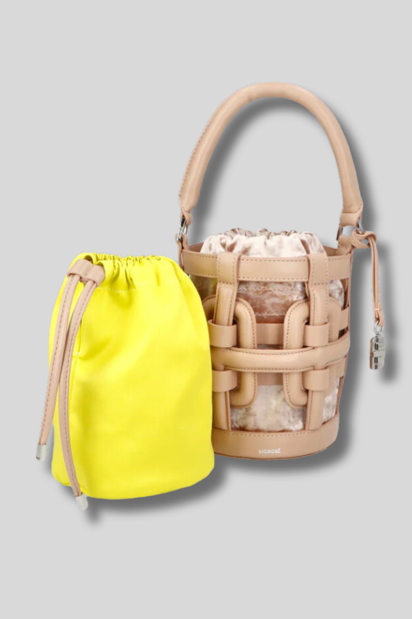 This Le Claxon 04 Nude bucket bag is designed by Morobé. It has 2 interchangeable nude and yellow pockets and a shoulder strap for crossbody use.