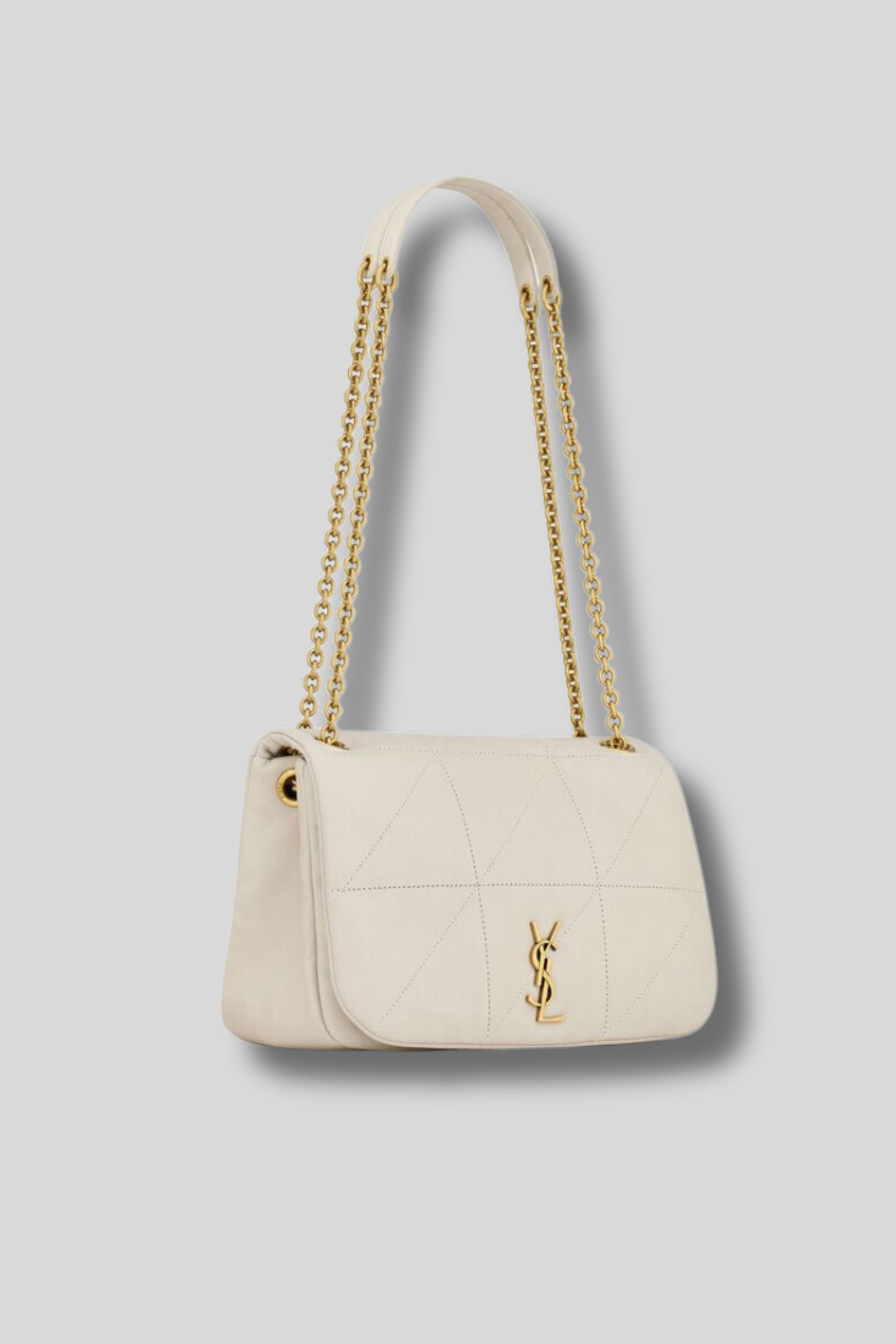 This Jamie 4.0 Small bag in off-white lambskin leather is designed by Saint Laurent. It is detailed with quilted topstitching and has a sliding chain so that it can be worn on the shoulder or as a crossbody.