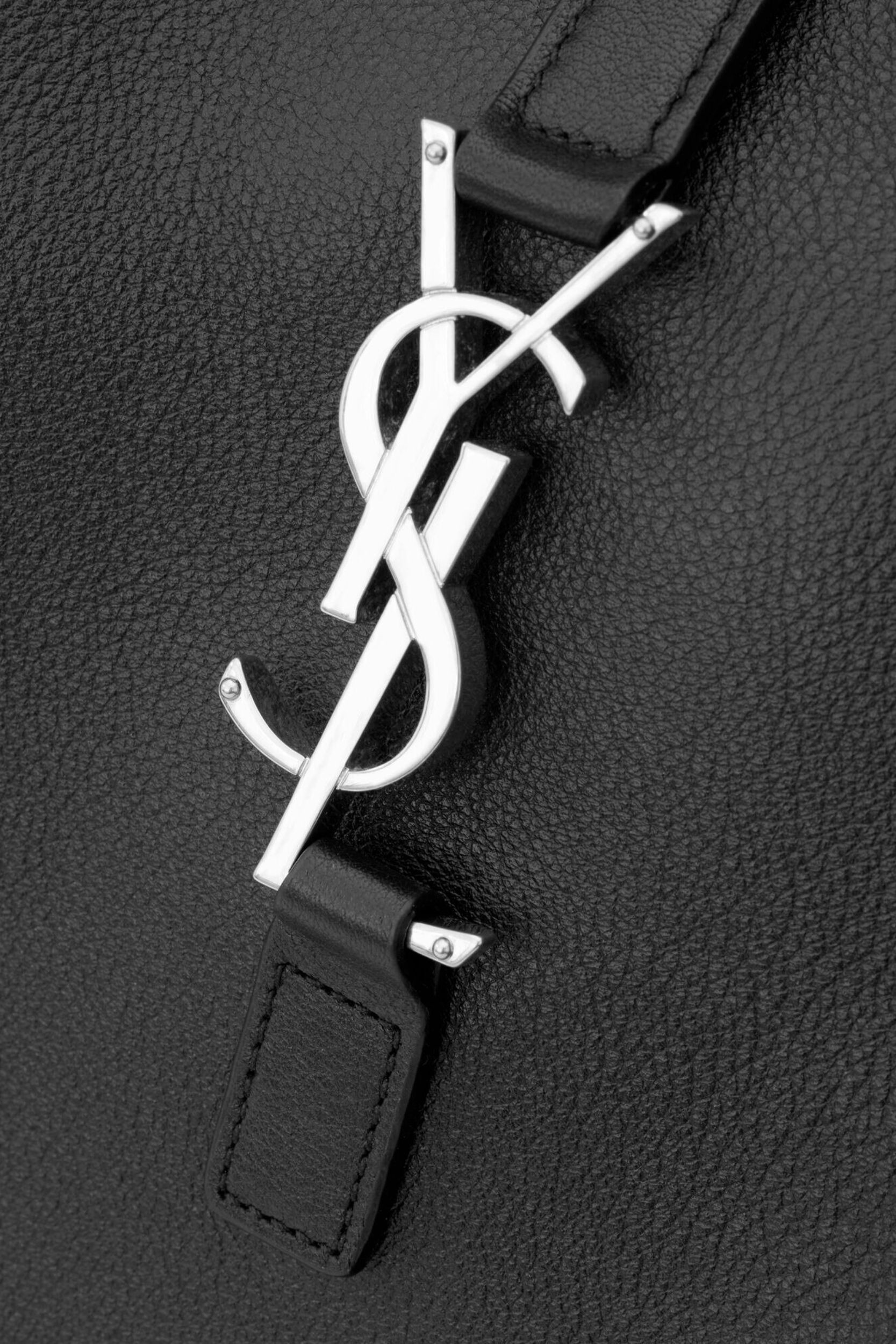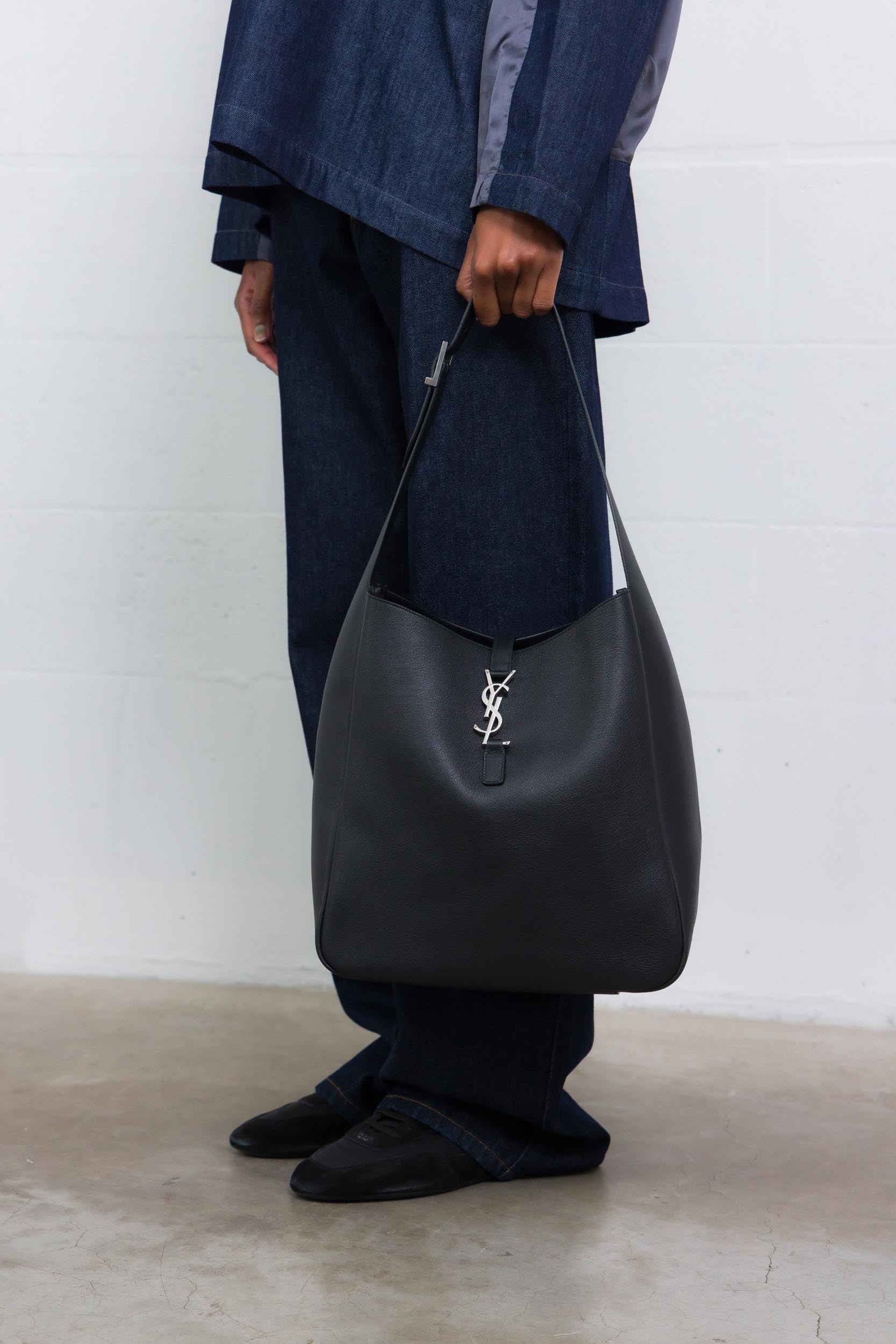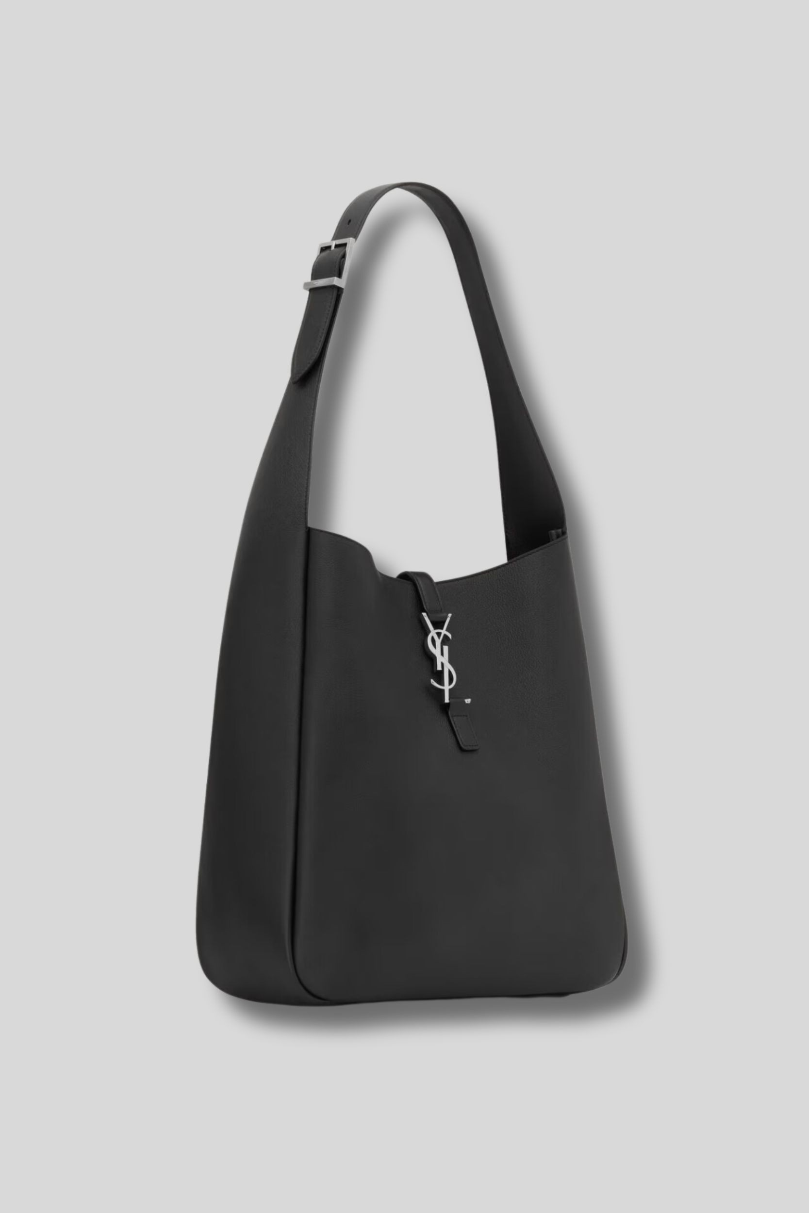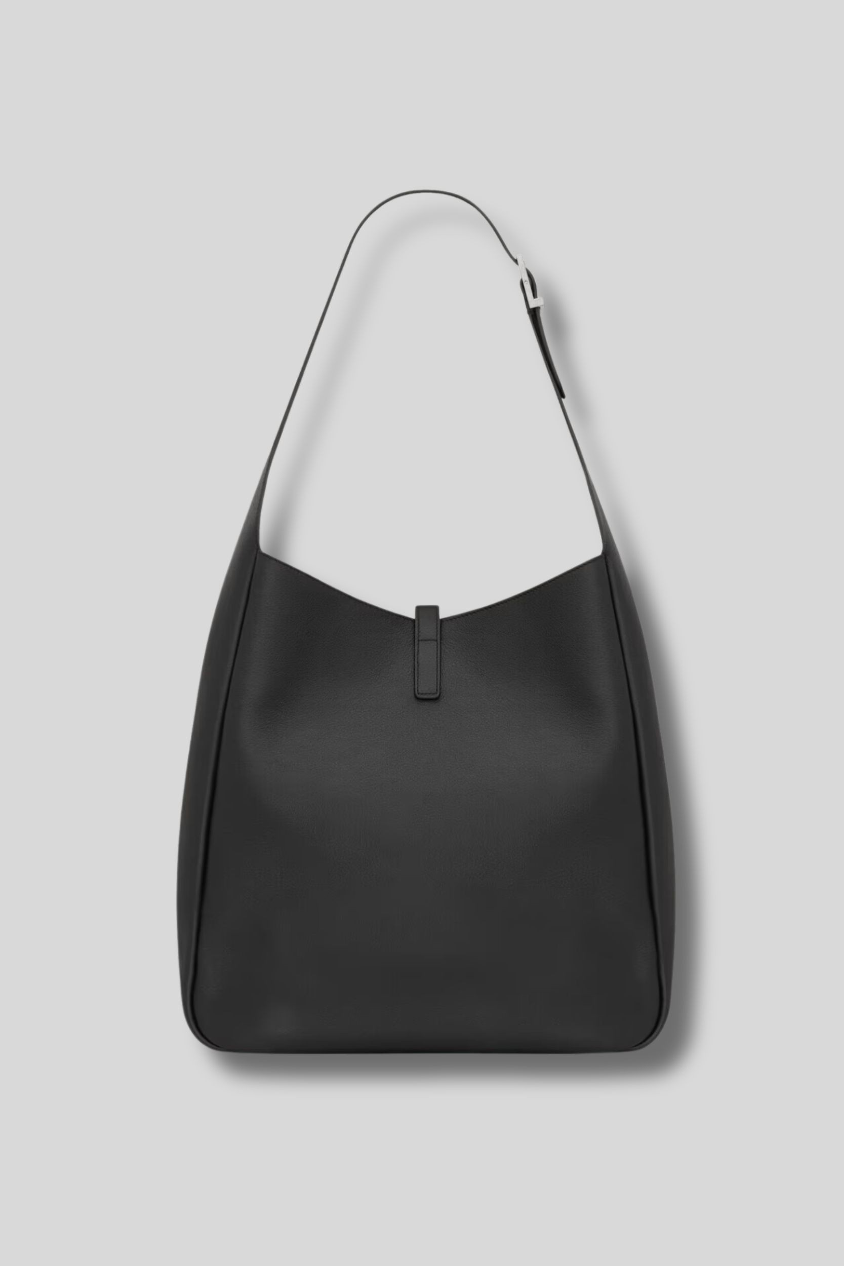This wide 5 to 7 bag in supple black grained leather with suede lining is designed by Saint Laurent. It features a tab decorated with the silver Cassandra and an inside zipped pocket. This product has an adjustable handle.