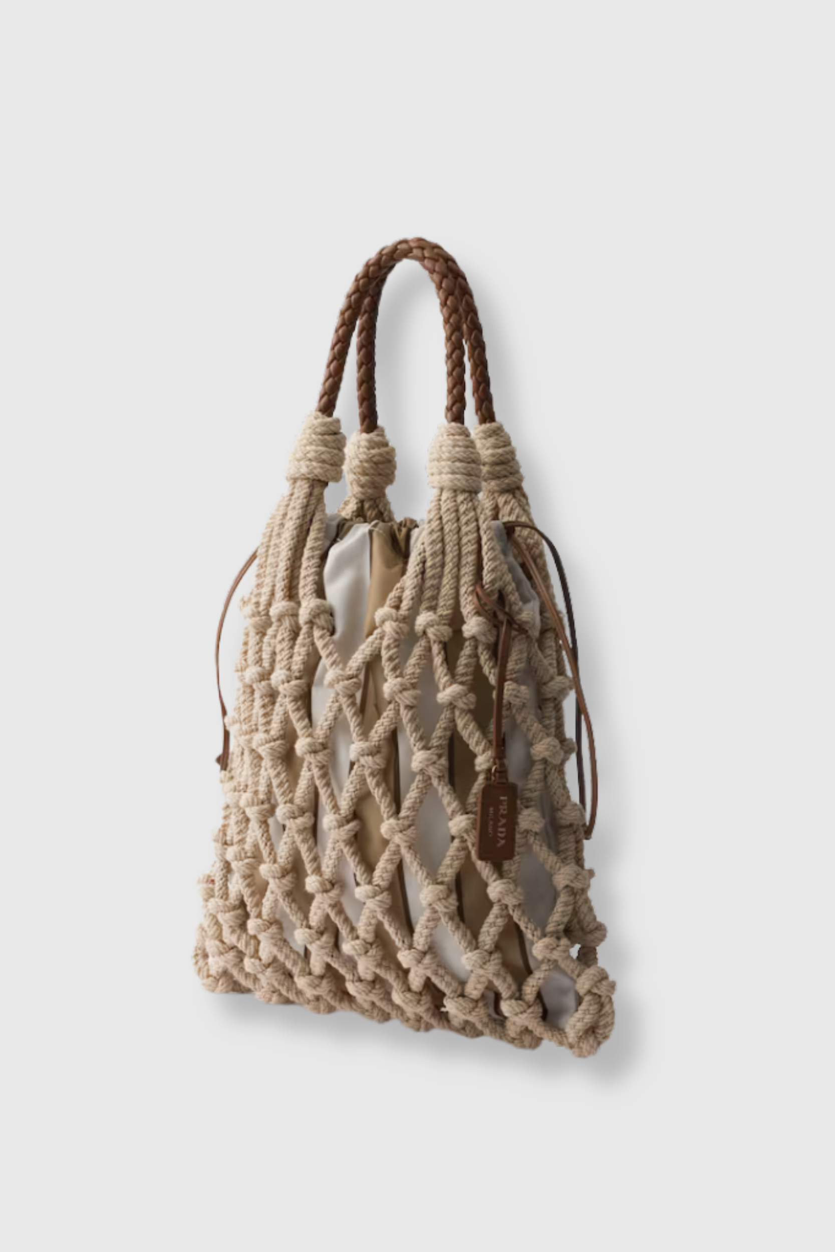 This beige rope and nylon bag is designed by Prada. Its unique macramé design, inspired by the nautical world, gives it an authentic elegance. The handles are braided leather, and the nylon interior is removable.