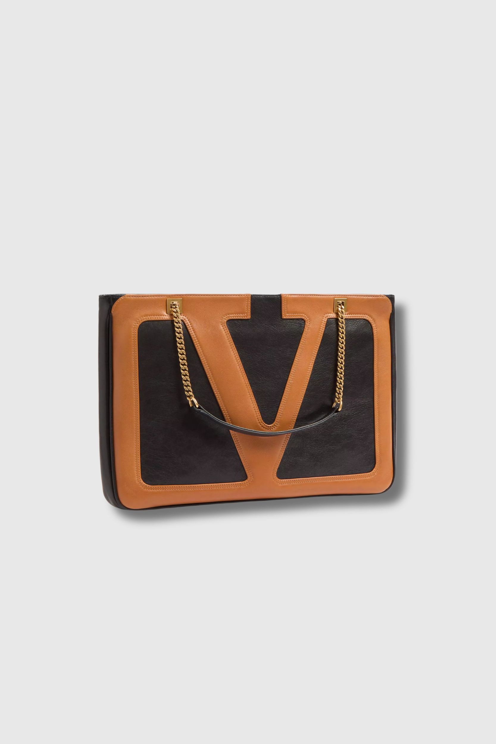 This camel leather tote bag is designed by Valentino Garavani. The Viva Superstar model in nappa leather stands out with its contrasting maxi VLogo Signature and sliding chain strap, allowing it to be worn over the shoulder or across the body. It features aged gold-finish metal hardware, a zip closure, nappa leather lining and a flat zip pocket on the outside, combining elegance and practicality.