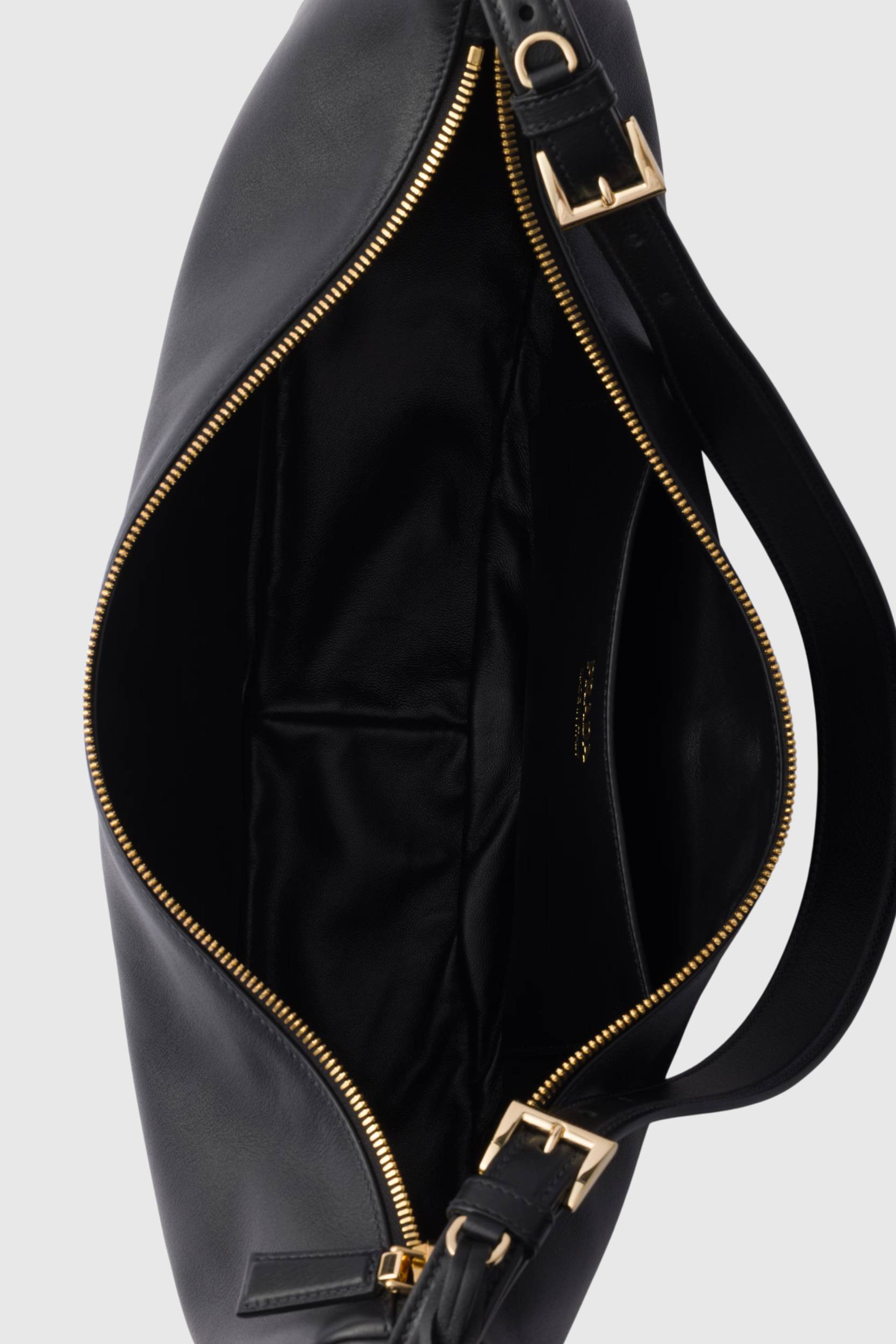 This large Demi-Lune black leather shoulder bag is designed by Prada. It features an adjustable strap, allowing it to be worn over the shoulder or crossbody. The piece is detailed with the brand’s signature triangular logo on the front, a removable keychain, and an interior patch pocket.