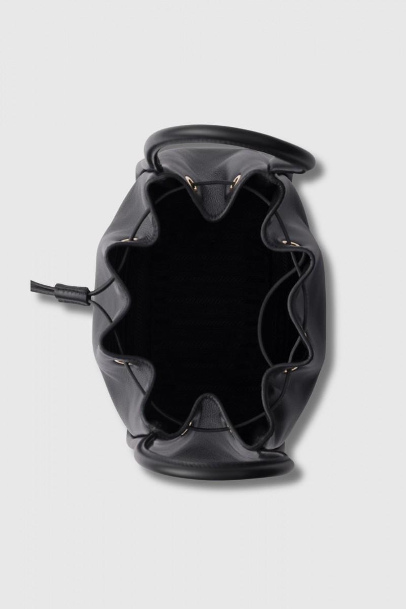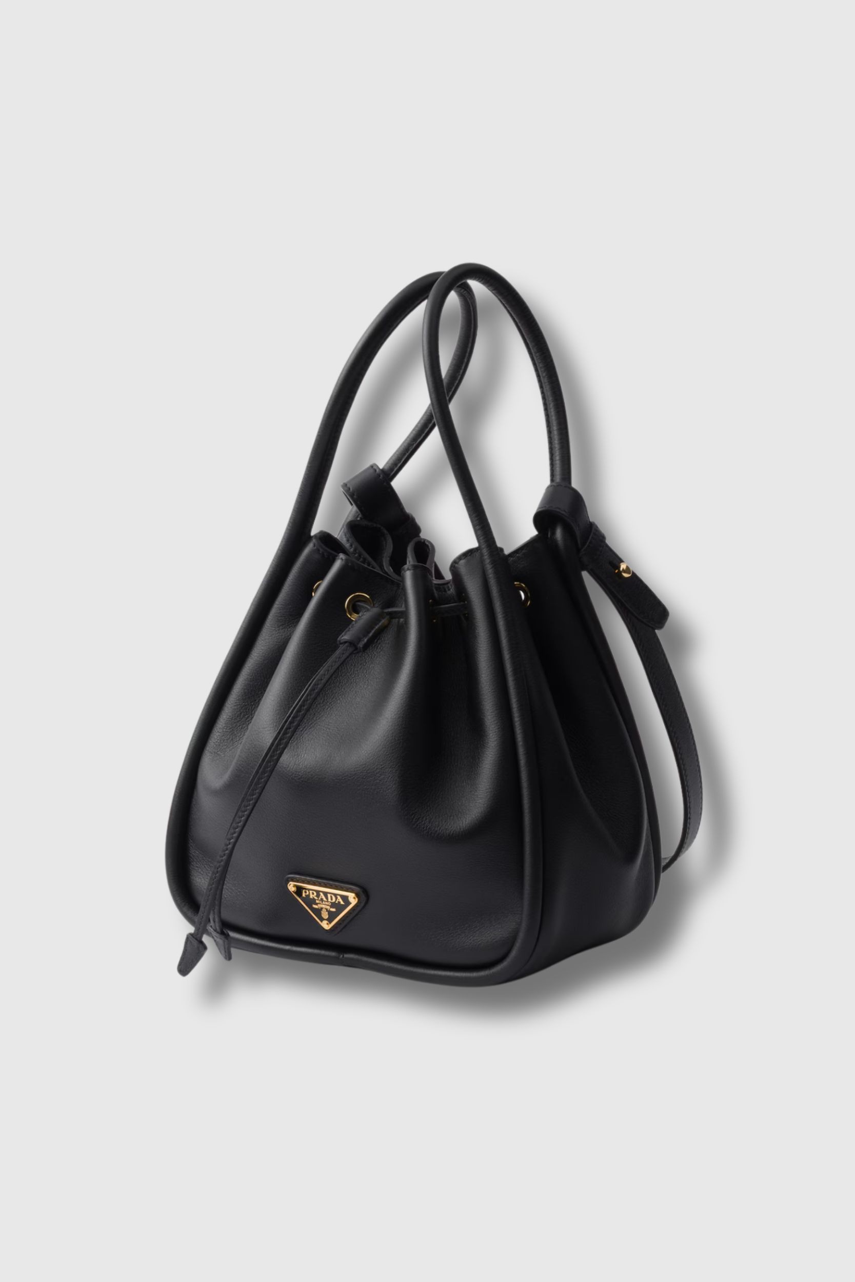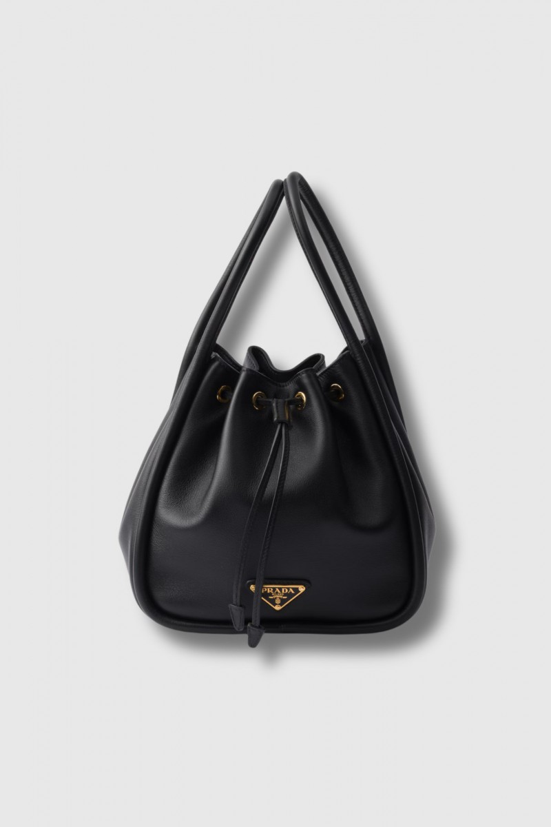 This black grained calf leather bag is designed by Prada. It features a removable shoulder strap, a sliding closure and the house's gold logo on the front.