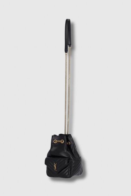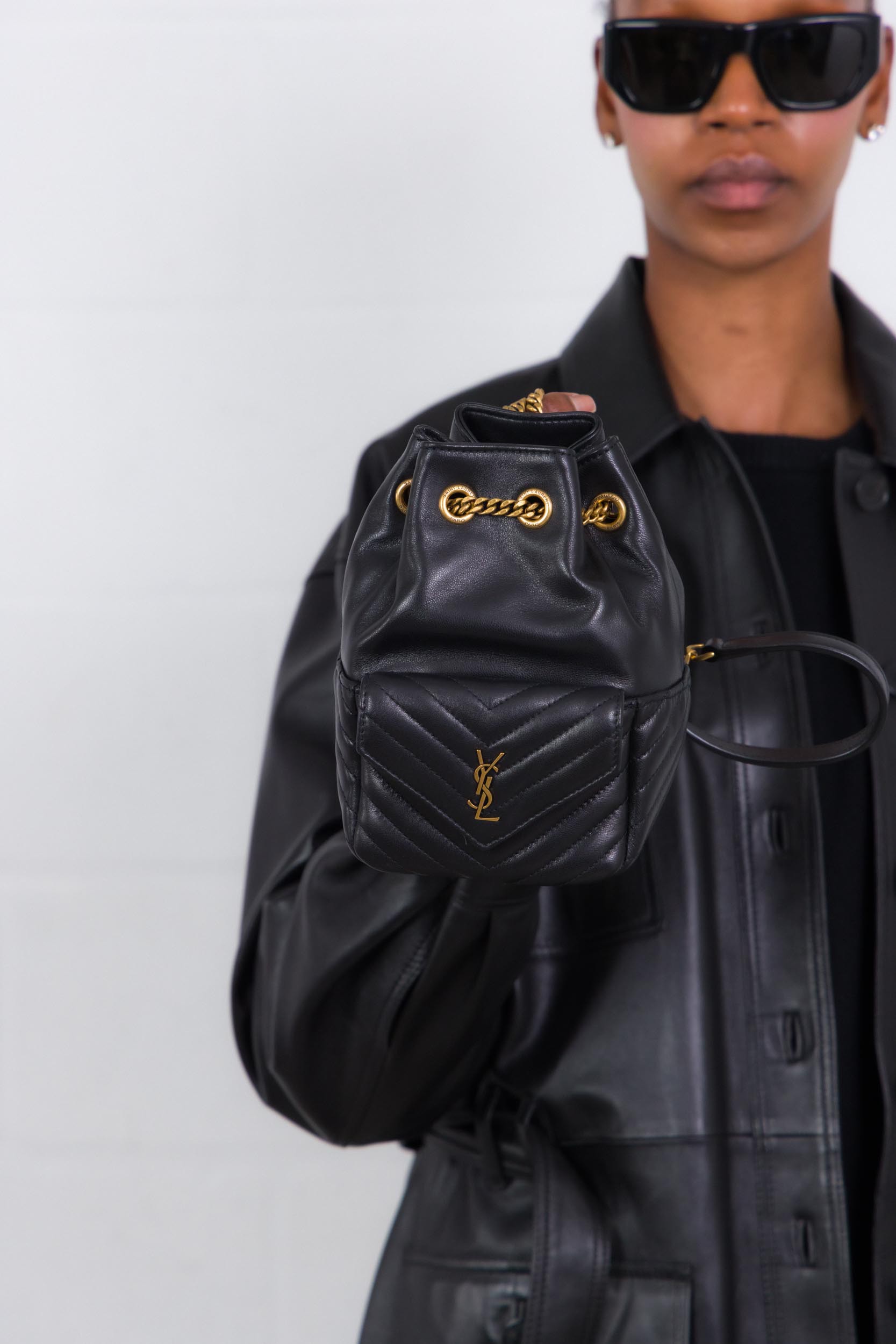 This black mini bucket bag with a shoulder strap is designed by Saint Laurent.